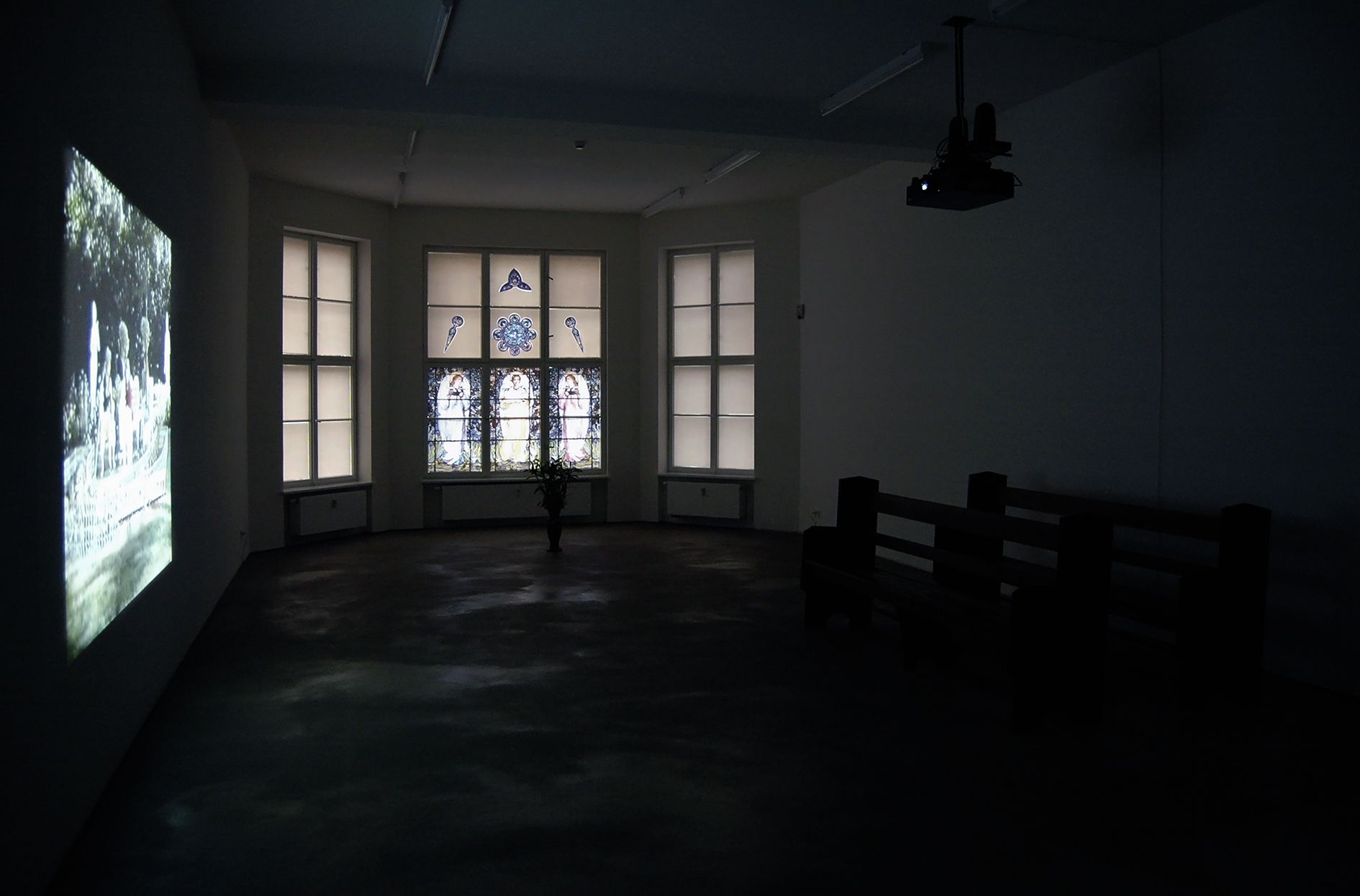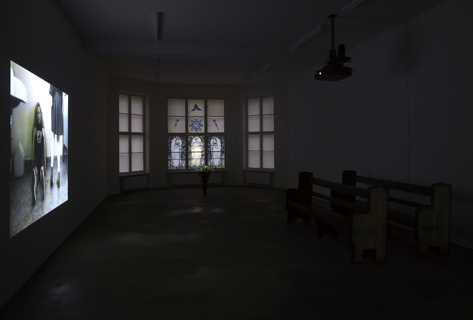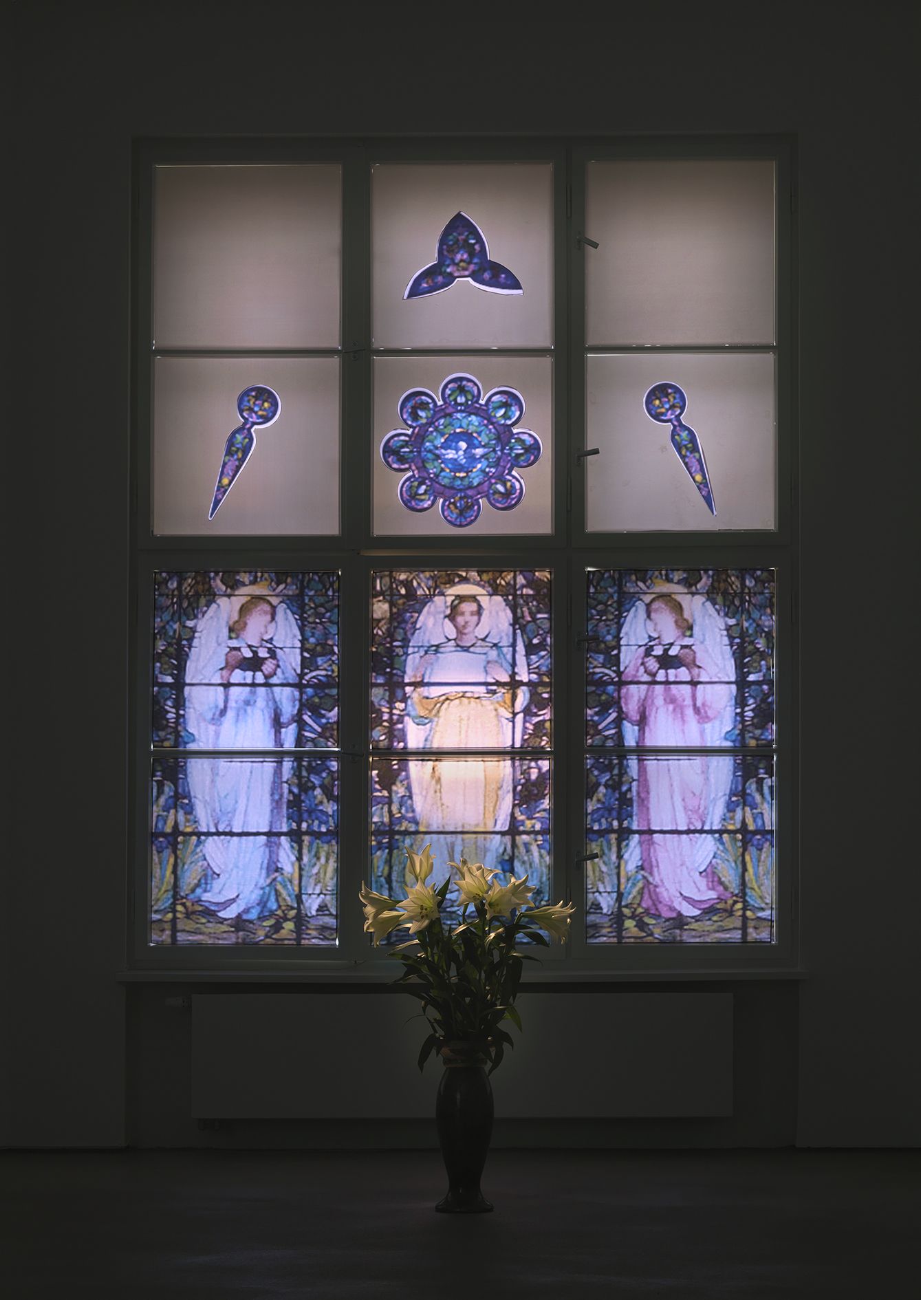 ‘Heathers’ is viewed in a chapel-like room, a context which deliberately alludes to the funeral scene in the film. The sacred and reverential atmosphere of the installation environment, with screen as altar, also subtly and humorously points towards the worship of the Hollywood idol that so fascinates Kilimnik. This sense of kitsch morbidity has long been central to her artistic practice.