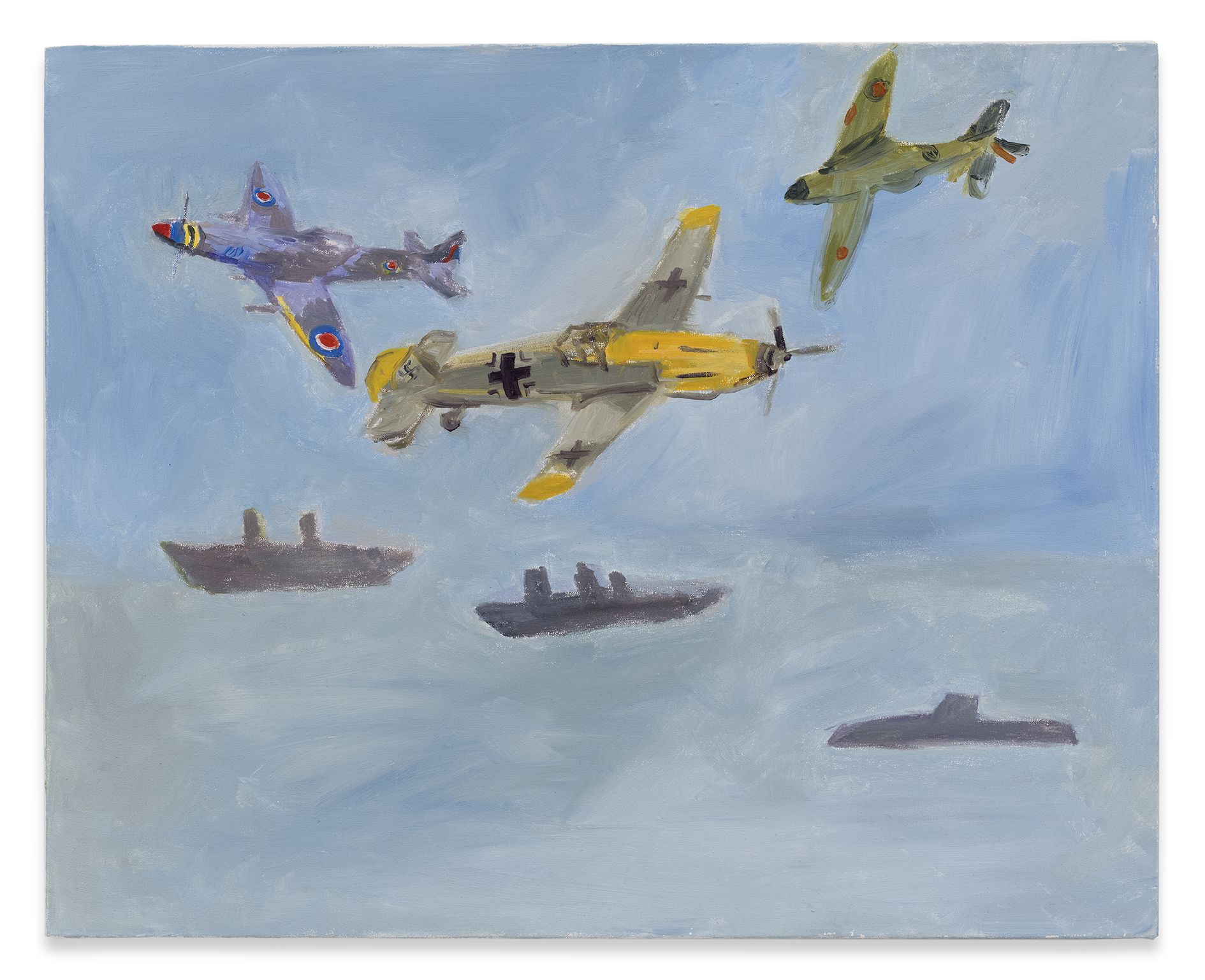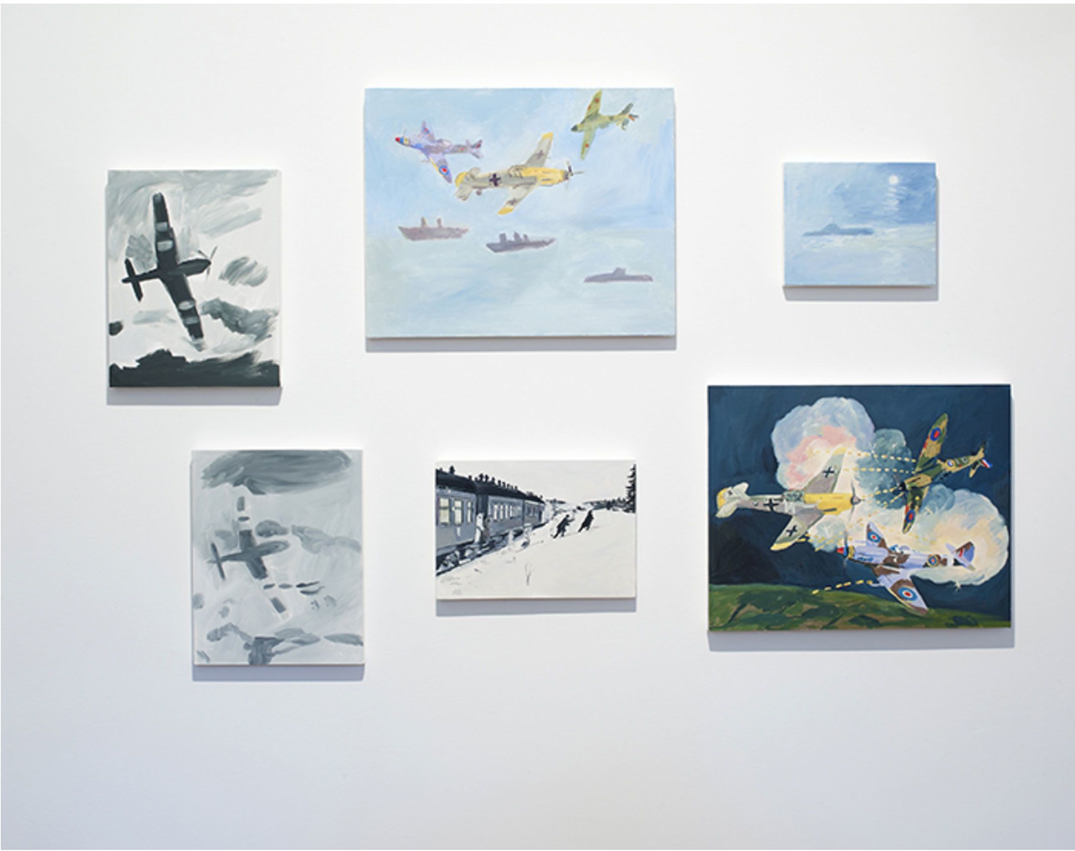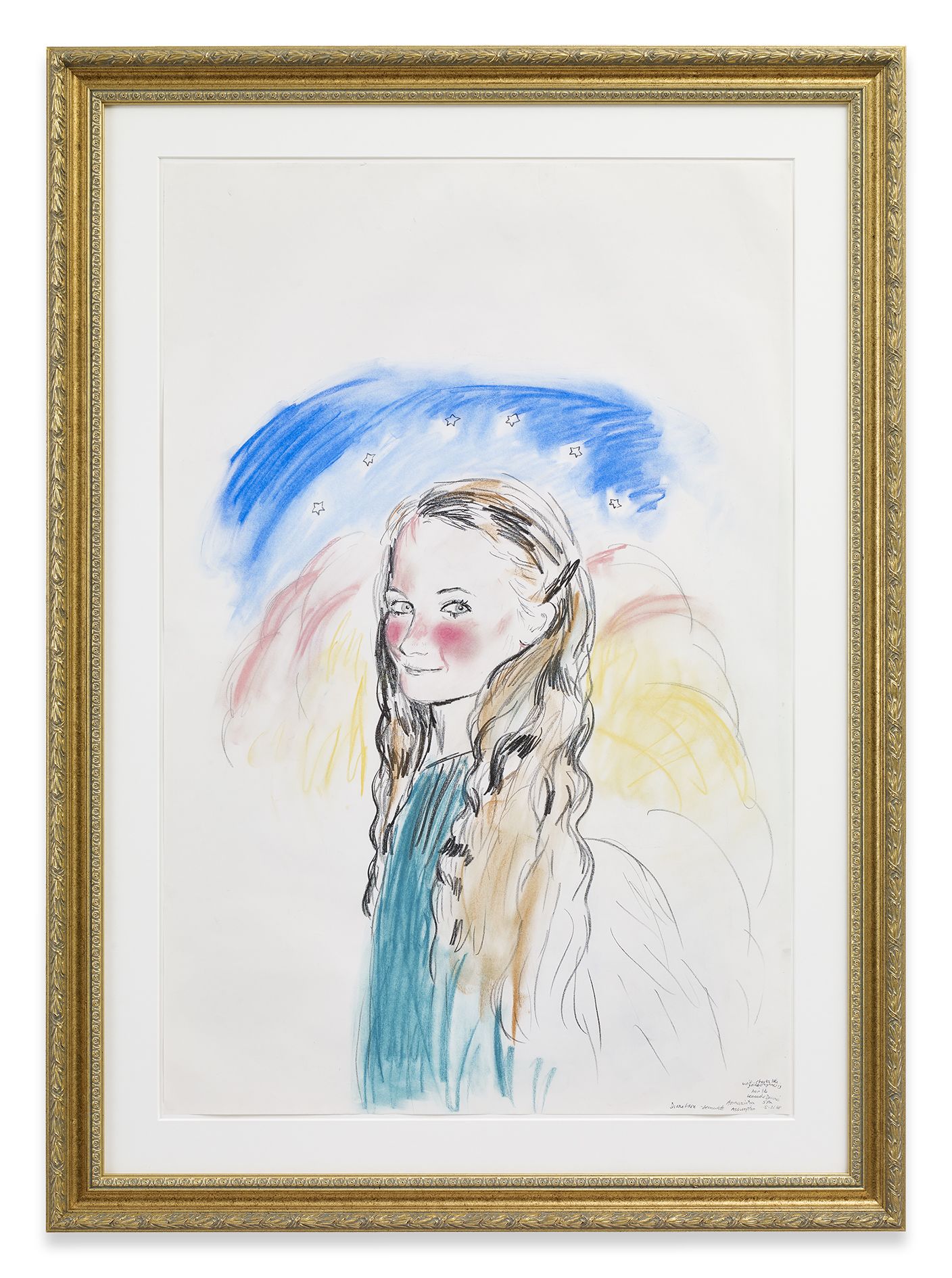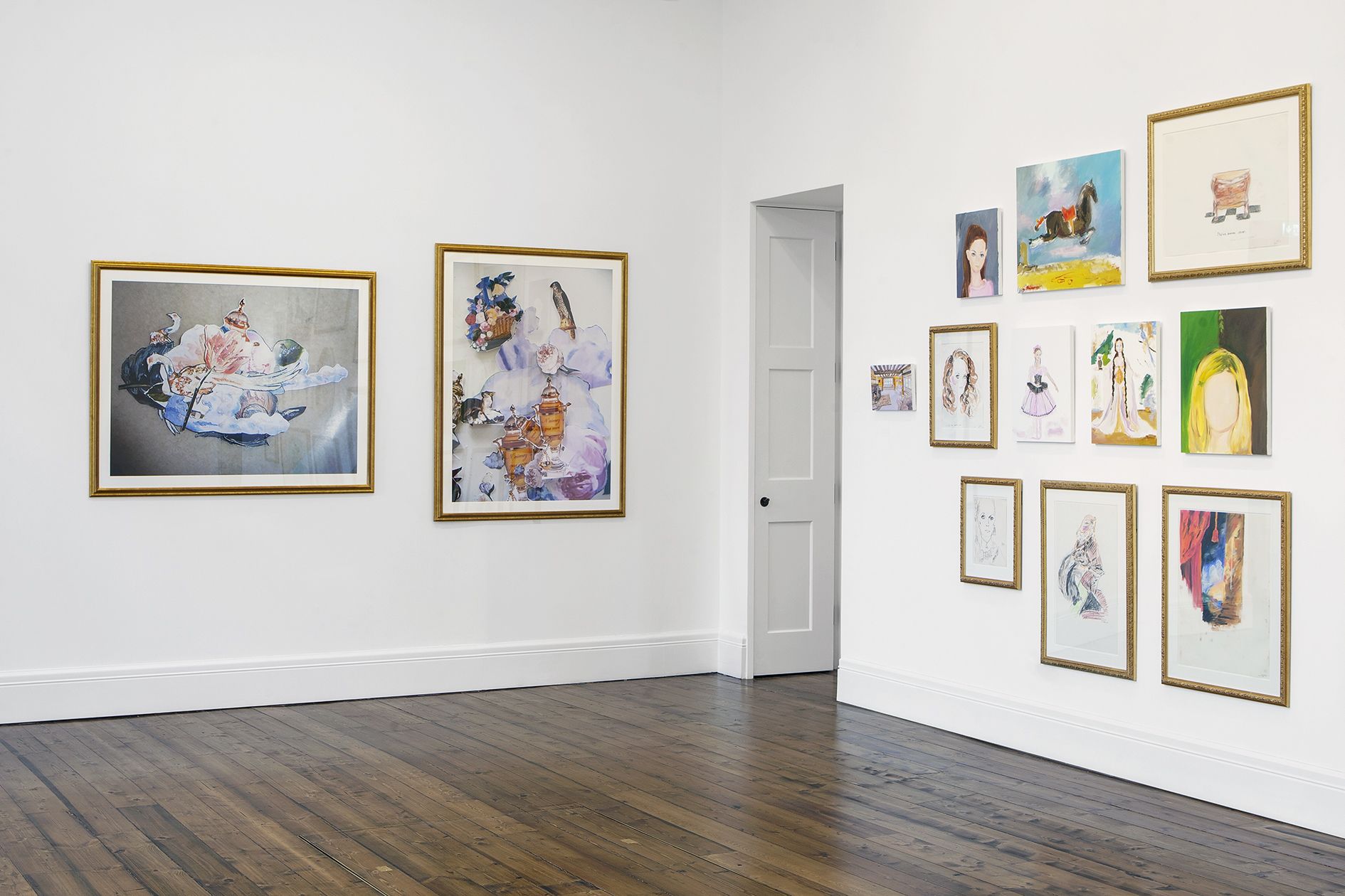 Kilimnik’s theme of the Second World War continues in the next room. Paintings of fighter planes and studies of military horses are treated with a lightness of colour and ease of brushstroke that sometimes transforms their subject matter into décor. Elsewhere, an early series of maps is shown alongside a new, much larger series that at first glance looks like abstract paintings. The Battle for France is plotted in one, accompanied by a series of handwritten notes explaining battle plans. In another, she comments on the visual prettiness of the colours and shapes, deliberately subsuming the trauma and devastation they identify into a prettier, more appealing surface. Kilimnik’s works are often saturated with these double meanings – innocence and cynicism, fantasy and reality, the everyday and infamy. Upstairs, the works reveal her fascination with cultural history. Copies of the work of earlier artists abound, such as Scottish artist Sir Henry Raeburn, as well as French Rococo painter Jean Baptiste Oudry. The early drawing My Sister and Me by Sir Thomas Lawrence (1986) is a copy in pastel of a painting by Sir Thomas Lawrence, whilst another early pastel is a copy of a work by the eighteenth century French artist, Jean-Baptiste Greuze. They, along with the later ‘Doll’ paintings, and photographs, attest to Kilimnik’s instrumental development of the new tendency in figurative painting, as well as her continued interest in the components that have formed cultural identity through the ages. In her works, the structuring factors of culture are shown to be myriad and unexpected: from regional borders, to regional dress, landscapes, mythology, witchcraft, stagecraft, the big screen and the small screen.