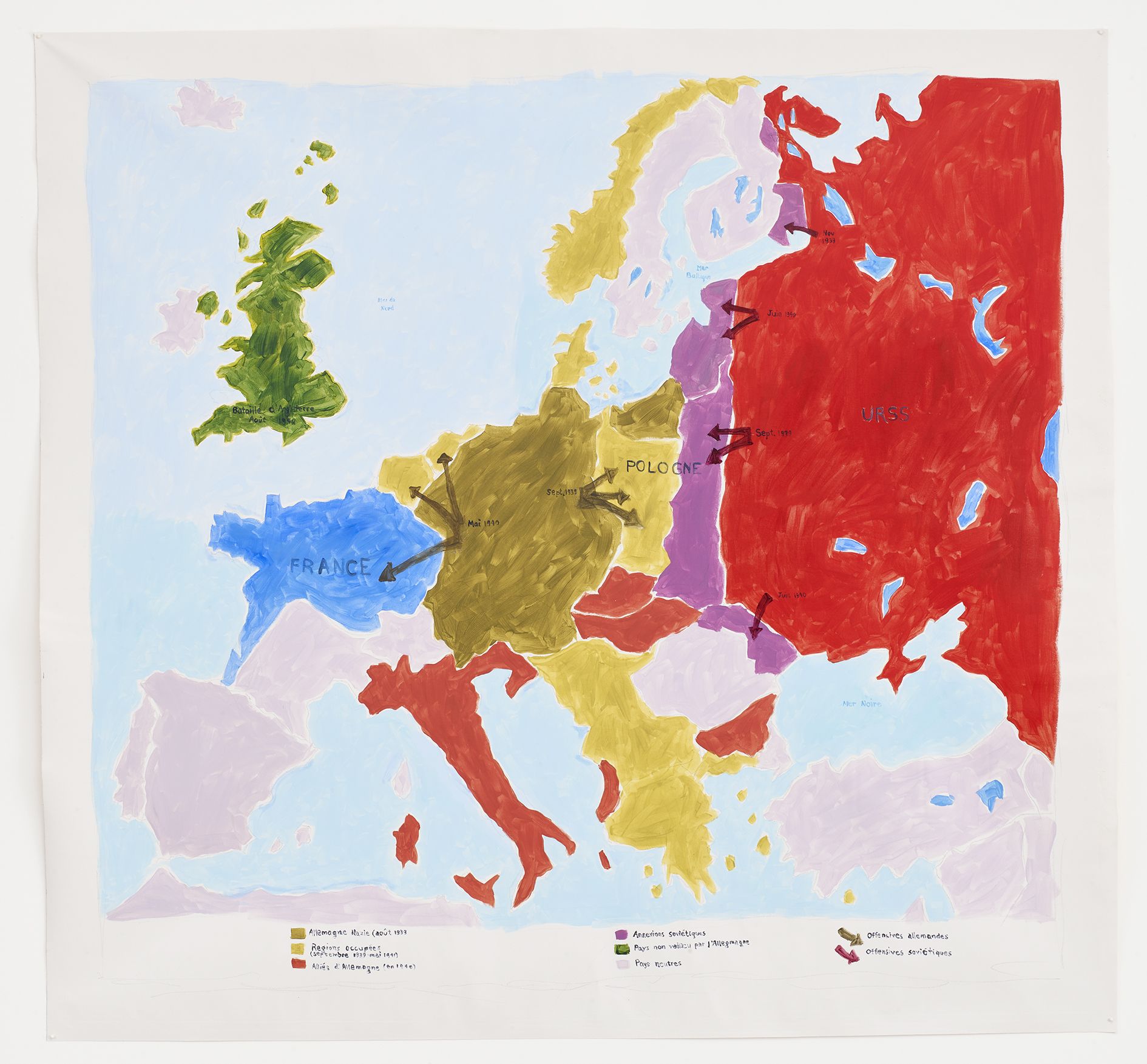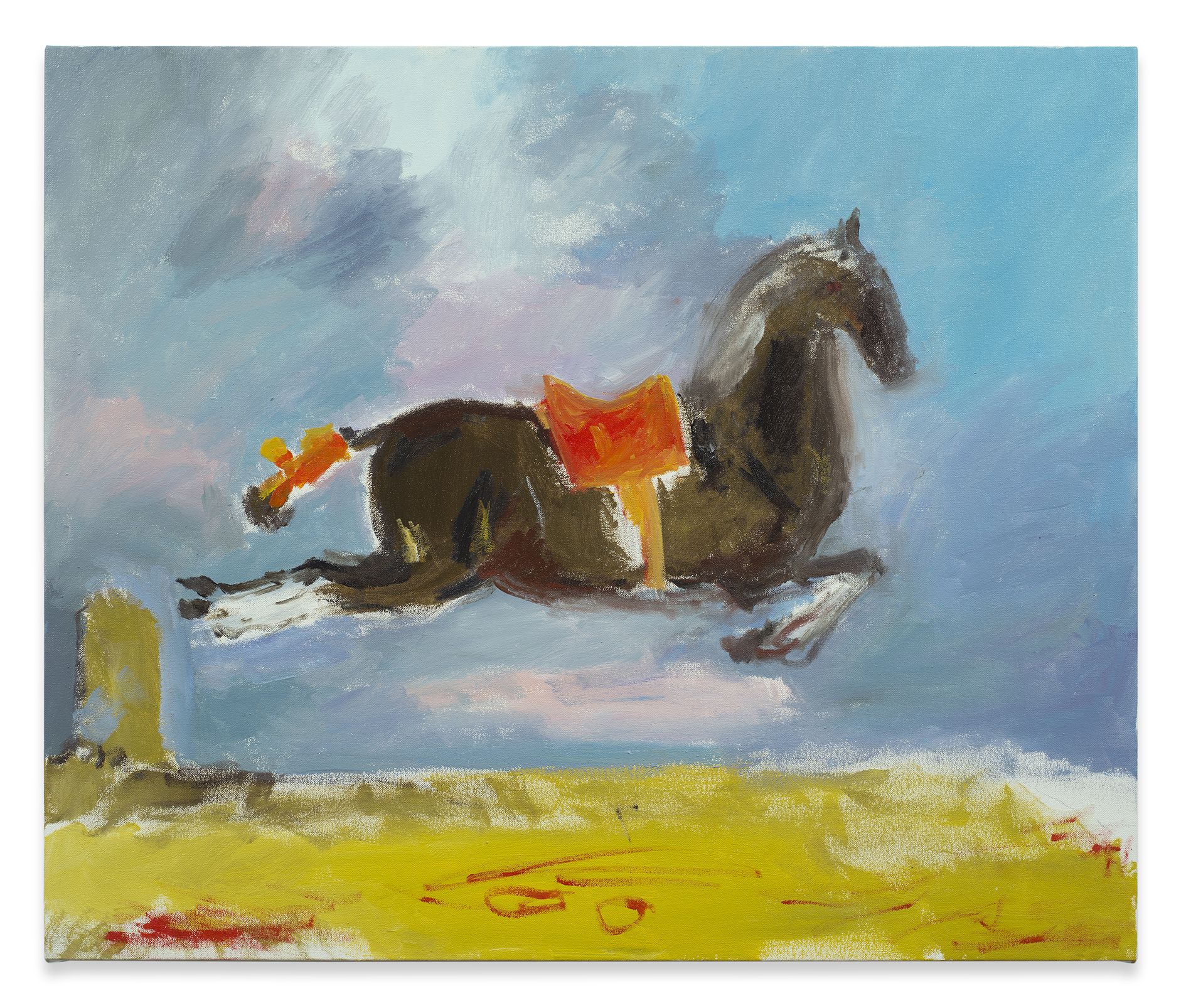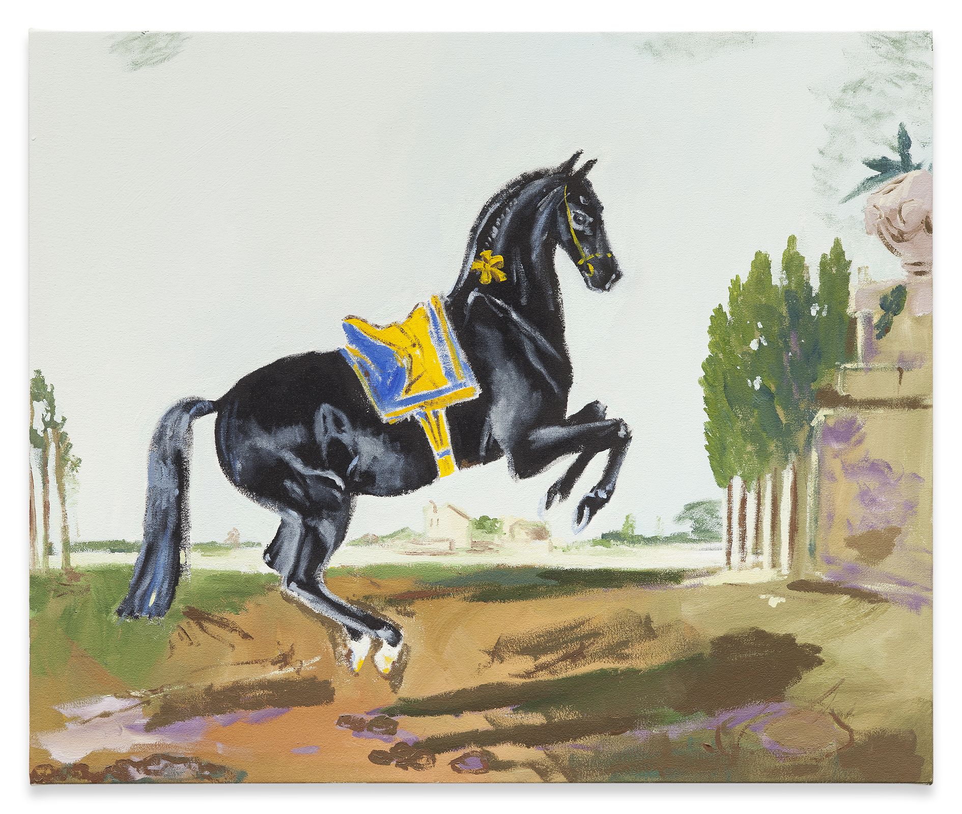 Kilimnik’s theme of the Second World War continues in the next room. Paintings of fighter planes and studies of military horses are treated with a lightness of colour and ease of brushstroke that sometimes transforms their subject matter into décor. Elsewhere, an early series of maps is shown alongside a new, much larger series that at first glance looks like abstract paintings. The Battle for France is plotted in one, accompanied by a series of handwritten notes explaining battle plans. In another, she comments on the visual prettiness of the colours and shapes, deliberately subsuming the trauma and devastation they identify into a prettier, more appealing surface. Kilimnik’s works are often saturated with these double meanings – innocence and cynicism, fantasy and reality, the everyday and infamy. Upstairs, the works reveal her fascination with cultural history. Copies of the work of earlier artists abound, such as Scottish artist Sir Henry Raeburn, as well as French Rococo painter Jean Baptiste Oudry. The early drawing My Sister and Me by Sir Thomas Lawrence (1986) is a copy in pastel of a painting by Sir Thomas Lawrence, whilst another early pastel is a copy of a work by the eighteenth century French artist, Jean-Baptiste Greuze. They, along with the later ‘Doll’ paintings, and photographs, attest to Kilimnik’s instrumental development of the new tendency in figurative painting, as well as her continued interest in the components that have formed cultural identity through the ages. In her works, the structuring factors of culture are shown to be myriad and unexpected: from regional borders, to regional dress, landscapes, mythology, witchcraft, stagecraft, the big screen and the small screen.