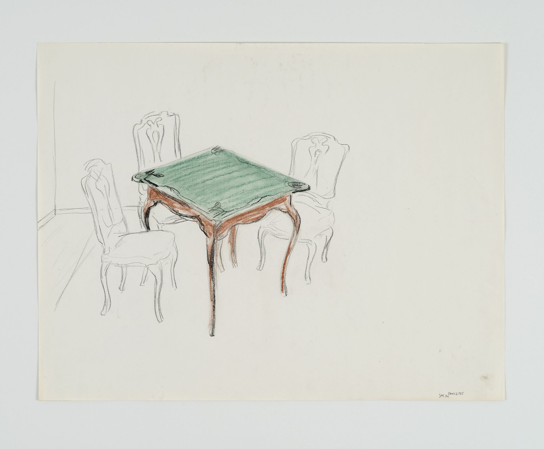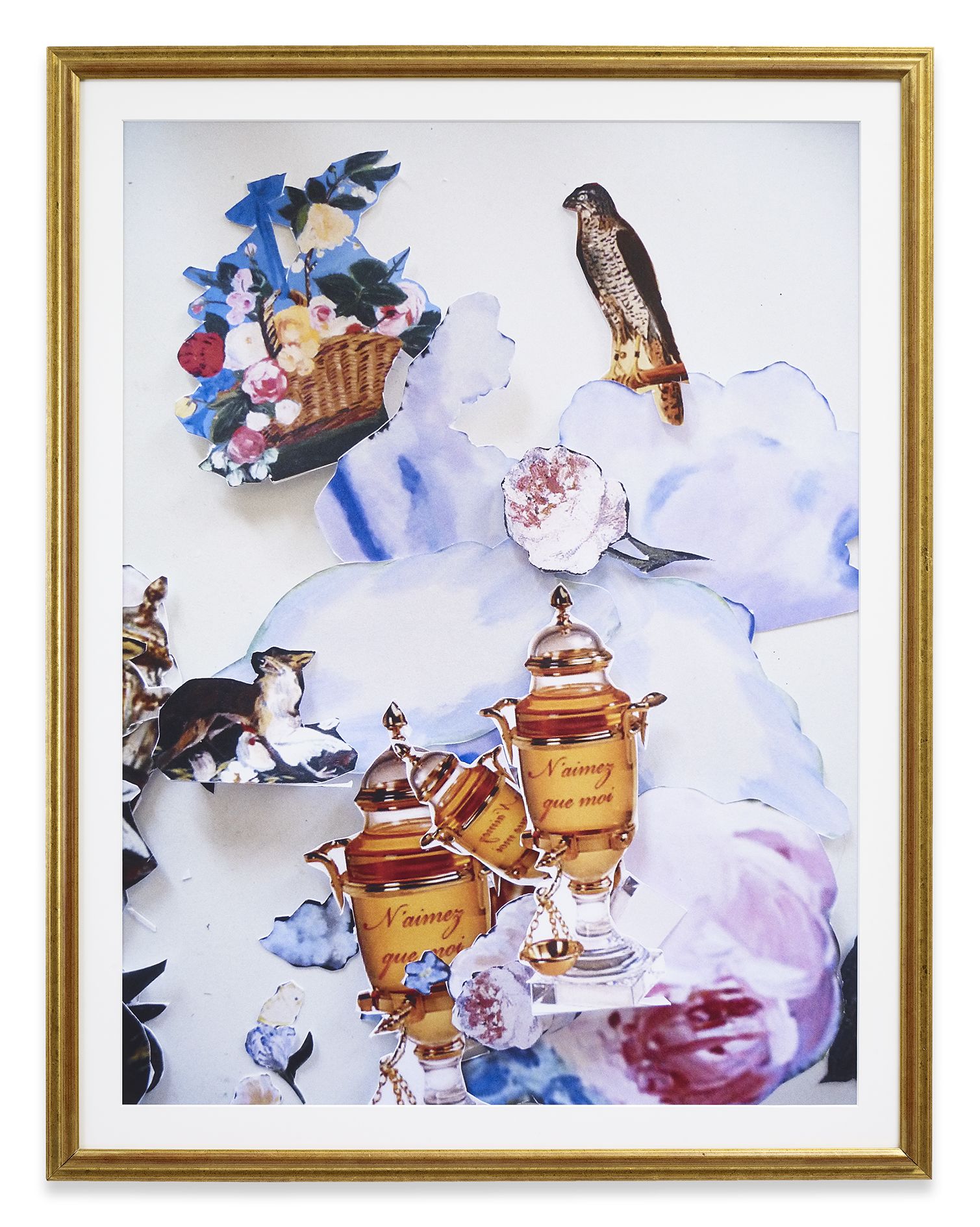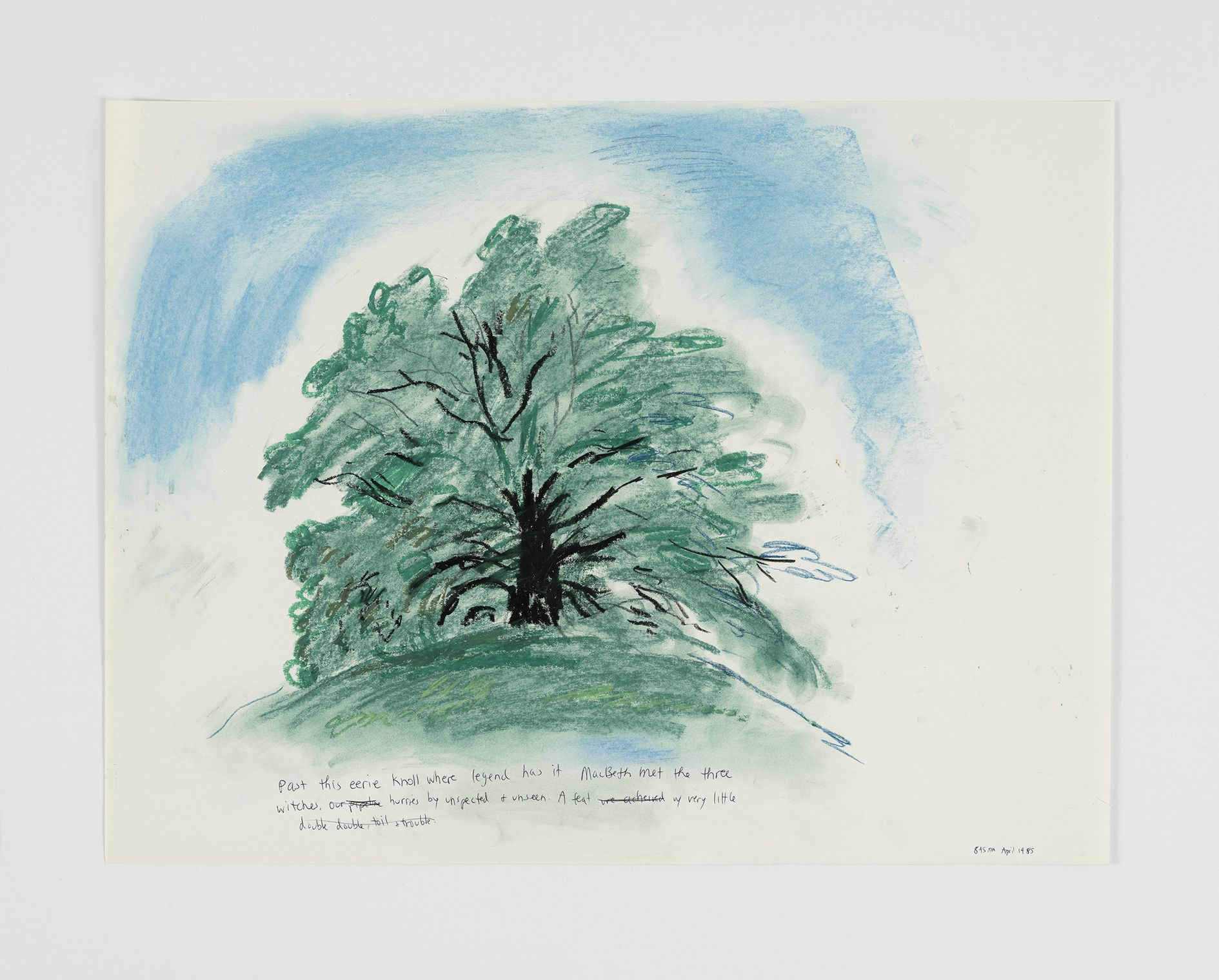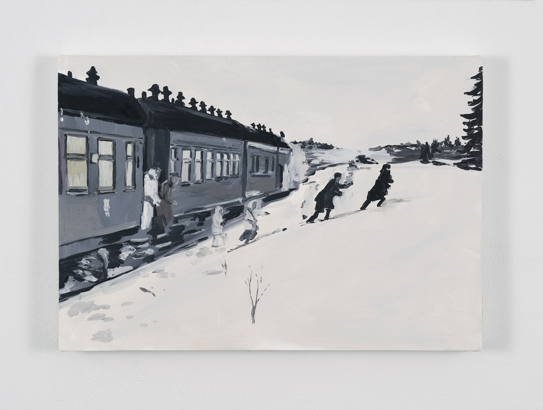 Kilimnik’s theme of the Second World War continues in the next room. Paintings of fighter planes and studies of military horses are treated with a lightness of colour and ease of brushstroke that sometimes transforms their subject matter into décor. Elsewhere, an early series of maps is shown alongside a new, much larger series that at first glance looks like abstract paintings. The Battle for France is plotted in one, accompanied by a series of handwritten notes explaining battle plans. In another, she comments on the visual prettiness of the colours and shapes, deliberately subsuming the trauma and devastation they identify into a prettier, more appealing surface. Kilimnik’s works are often saturated with these double meanings – innocence and cynicism, fantasy and reality, the everyday and infamy. Upstairs, the works reveal her fascination with cultural history. Copies of the work of earlier artists abound, such as Scottish artist Sir Henry Raeburn, as well as French Rococo painter Jean Baptiste Oudry. The early drawing My Sister and Me by Sir Thomas Lawrence (1986) is a copy in pastel of a painting by Sir Thomas Lawrence, whilst another early pastel is a copy of a work by the eighteenth century French artist, Jean-Baptiste Greuze. They, along with the later ‘Doll’ paintings, and photographs, attest to Kilimnik’s instrumental development of the new tendency in figurative painting, as well as her continued interest in the components that have formed cultural identity through the ages. In her works, the structuring factors of culture are shown to be myriad and unexpected: from regional borders, to regional dress, landscapes, mythology, witchcraft, stagecraft, the big screen and the small screen.