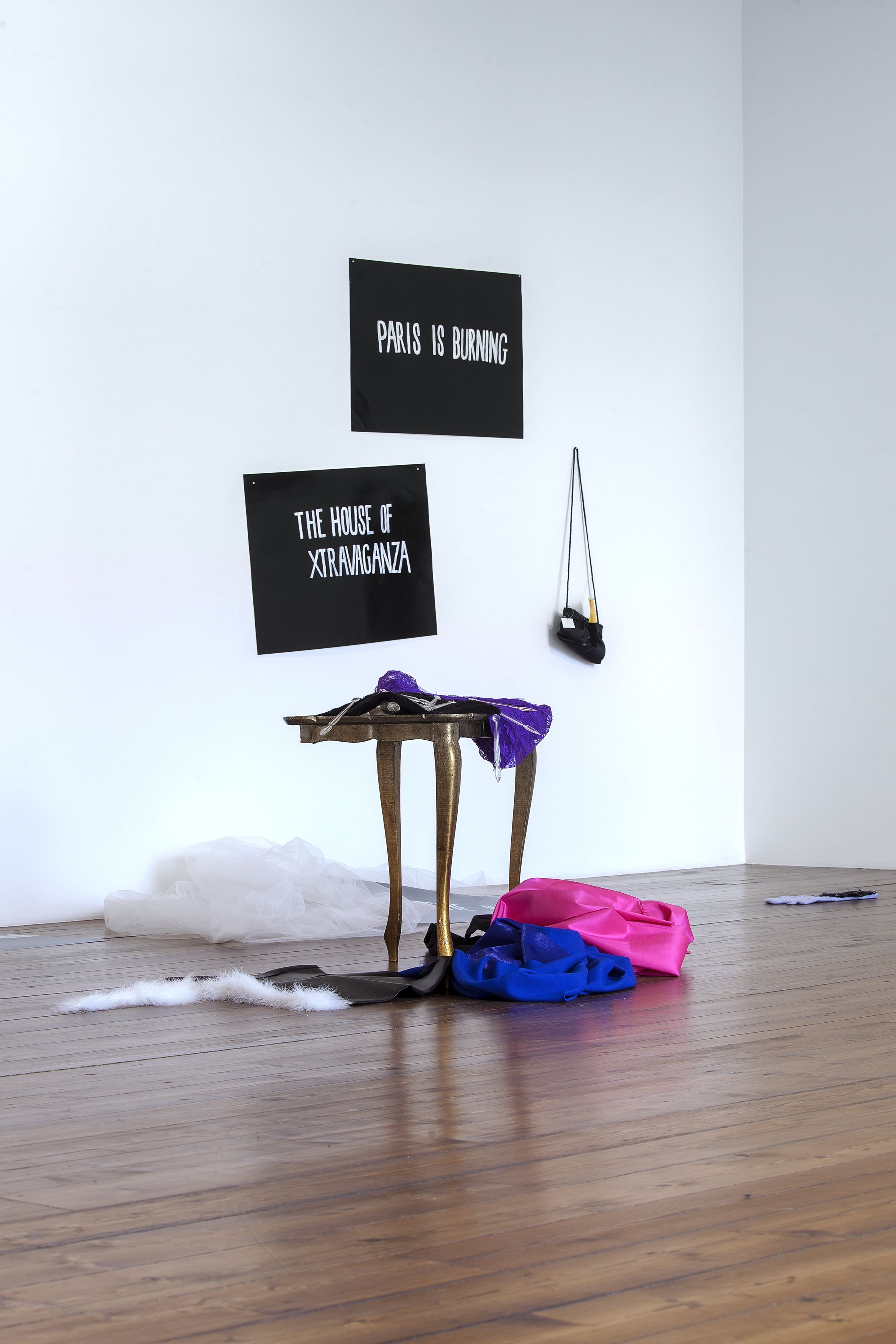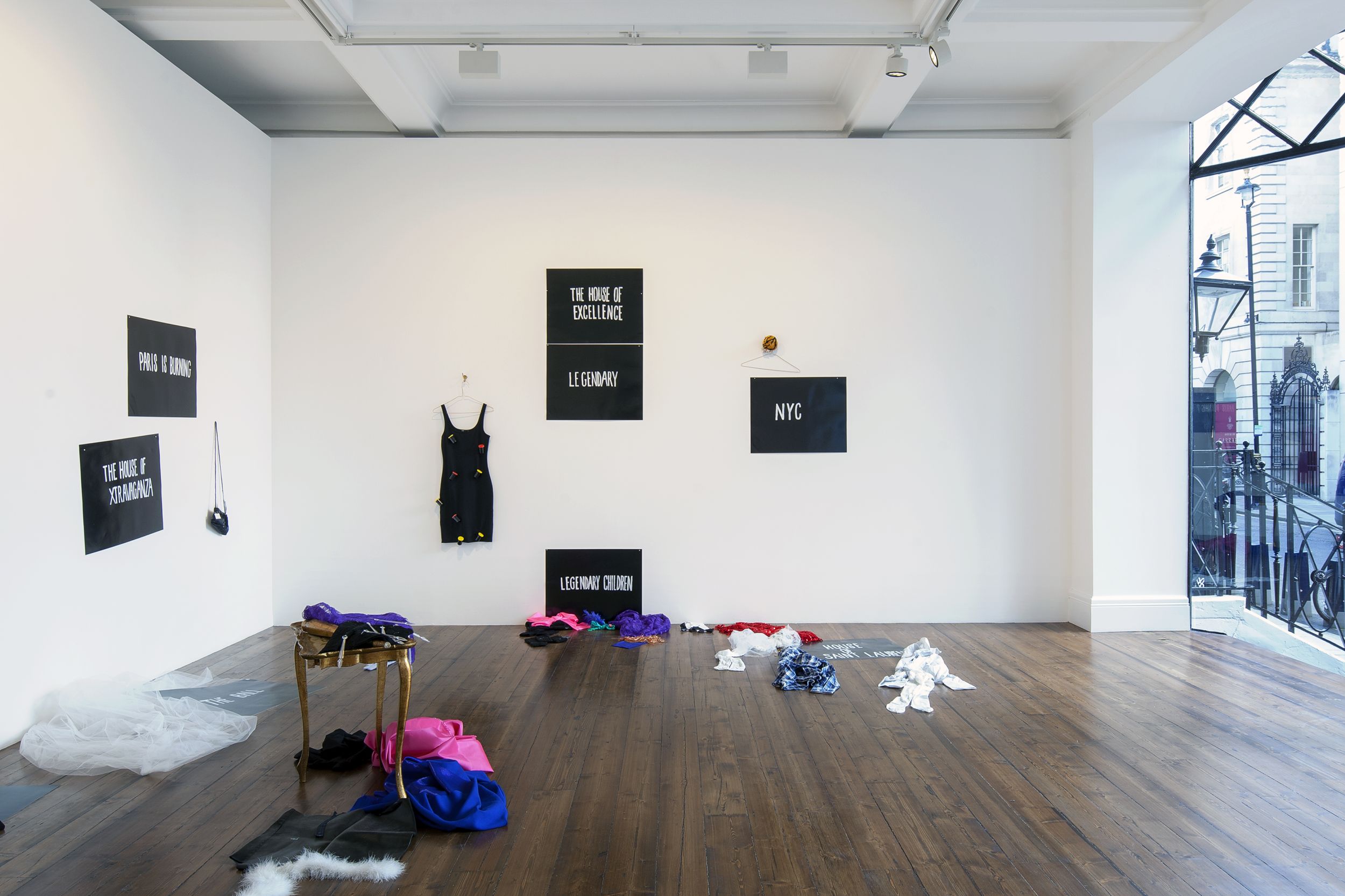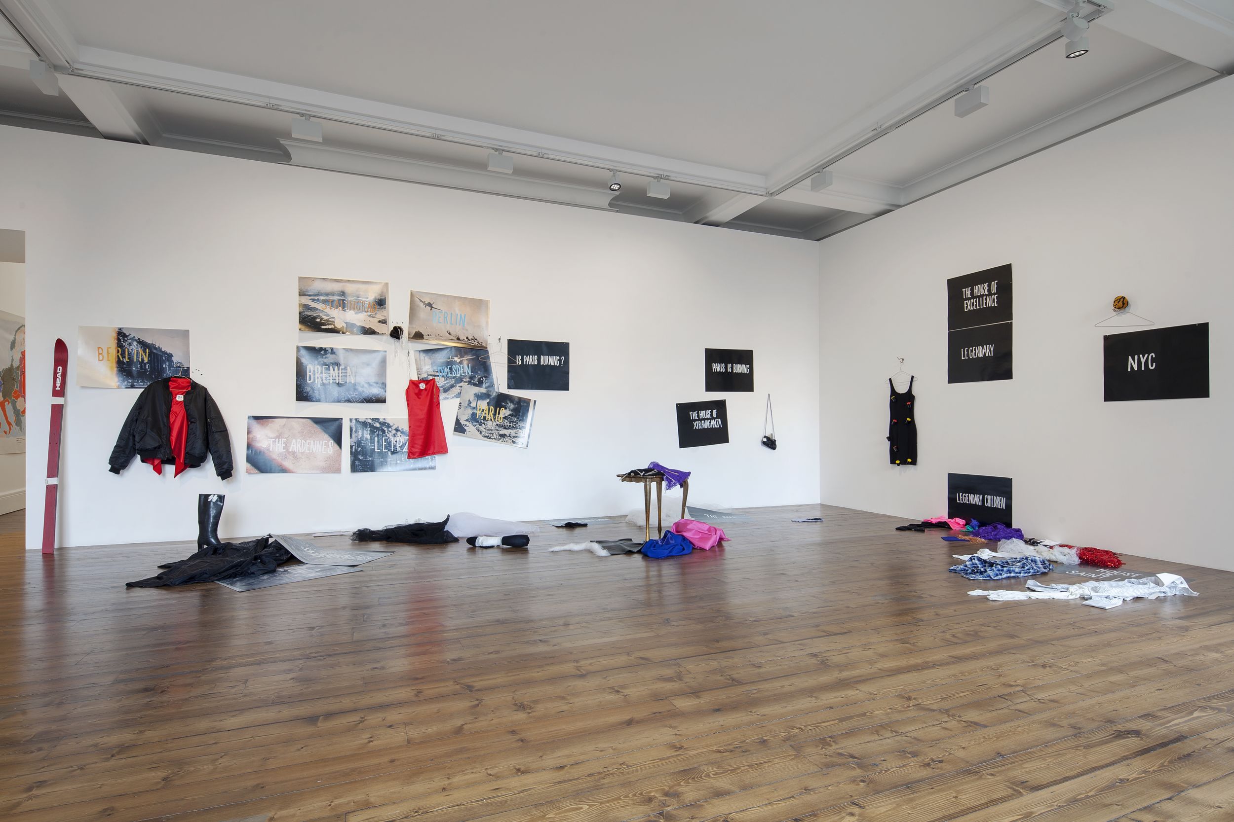 Paris is Burning (1991) / Is Paris Burning? (1944) from 1992 is the first work in the exhibition, occupying the ground floor space. The work has not been shown publicly since Kilimnik’s very first museum show at the ICA Philadelphia in 1992. It is an important example of her early sculptural work – a genre for which she gained attention in the late 1980s alongside artists such as Mike Kelley and Cady Noland. Other early examples include The Joker Episode of the Avengers (1991) – part of a series of works based on the British television series The Avengers. In the work on view, an assortment of objects is displayed throughout the exhibition space, seemingly at random, giving the illusion of an abandoned stage set or a display in a store window. On the back wall, the two halves of the work’s title are announced in bold white typeface on black posters, simulating the cards used in silent movies as well as the aesthetic in Jennie Livingstone’s 1990 documentary, Paris is Burning. At a remove from each other, the titles indicate two narrative frames for the incongruous props and posters that appear around them. On the left, ‘Is Paris Burning?’ Refers to a Hollywood movie from 1966 that centred on Hitler’s real-life plans to destroy Paris in 1944, hours before it was liberated from Nazi rule. Meanwhile on the right, Kilimnik uses the aforementioned documentary that followed the thriving ball culture engendered by New York City’s African-American, Latino, gay, and transgender communities. The films collide in the installation: the stigmatic symbol of the swastika brands a red dress like a flag, and is displayed with a bandaged leg, skis, tights, a jacket, and other costume and fashion items. The props appear to be selected from the historic and recent past to overlap in a disconcerting mise en scène of twentieth century experience. On the left, photos are displayed from the Hollywood movie, showing cities ravaged by bombs and battles in the Second World War. On the right, ball vocabulary appears with the names of the most illustrious New York drag ‘houses’. Kilimnik uses the idea of the stage set to re-present icons of evil as adornment, fashion and fascism, and to present historical fact as theatre. Through presenting these two discordant areas of history – war-torn Europe and countercultural New York, she examines how cultures are established through varying means.