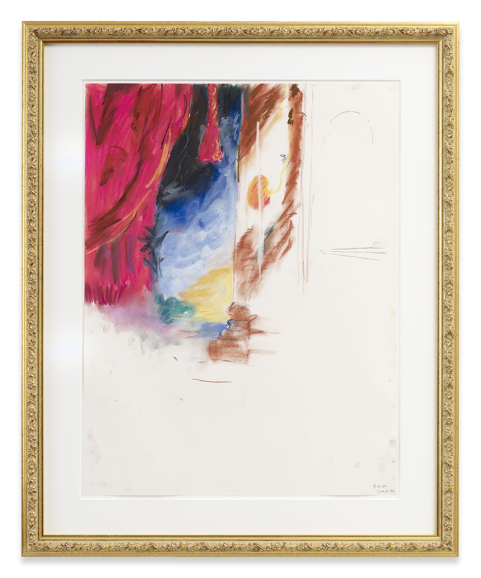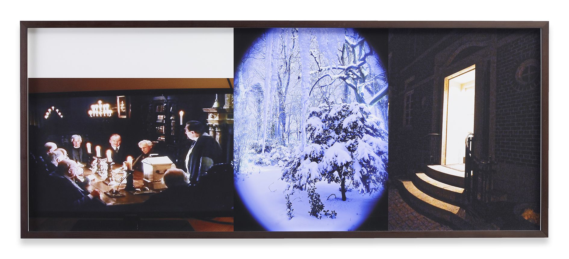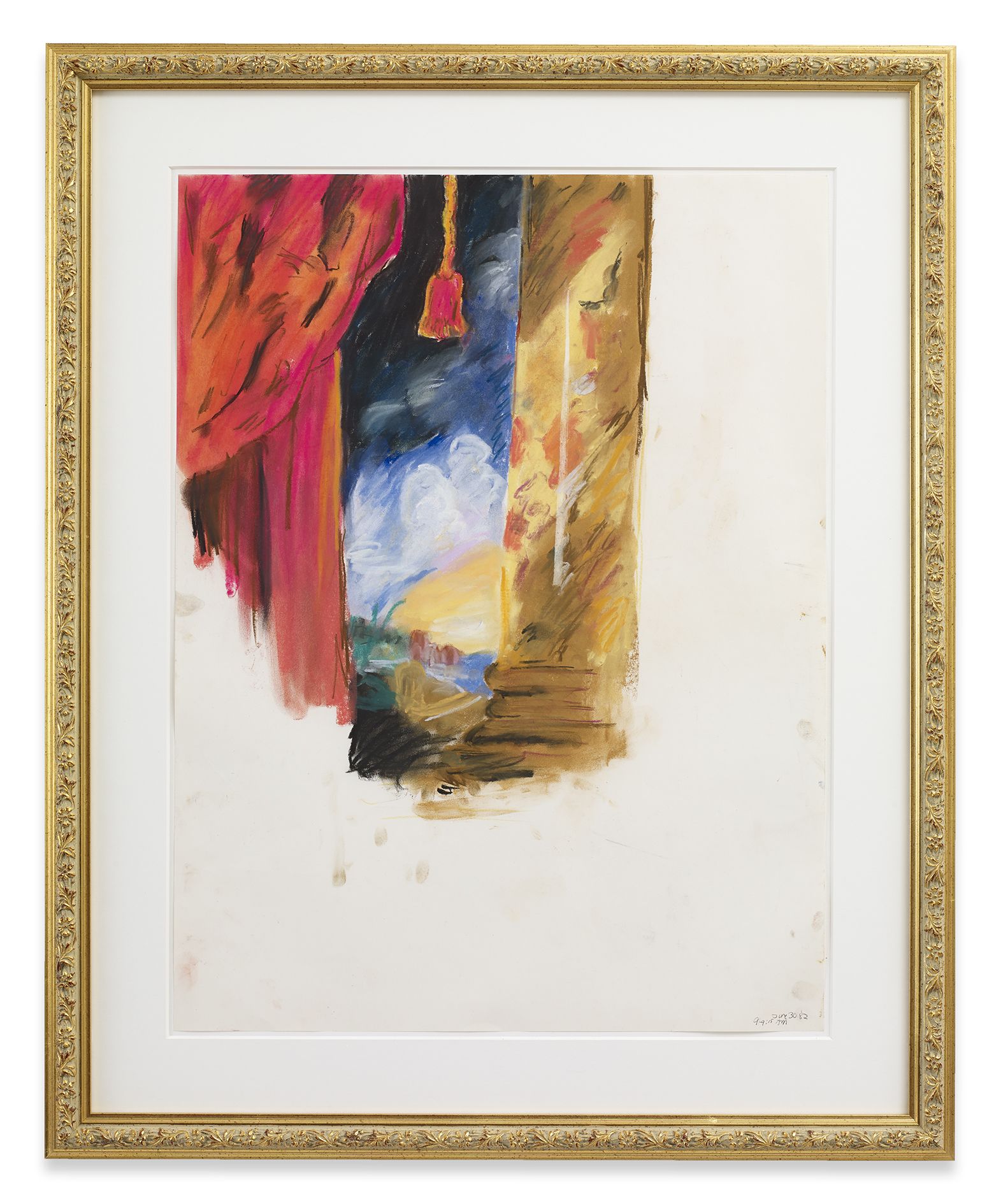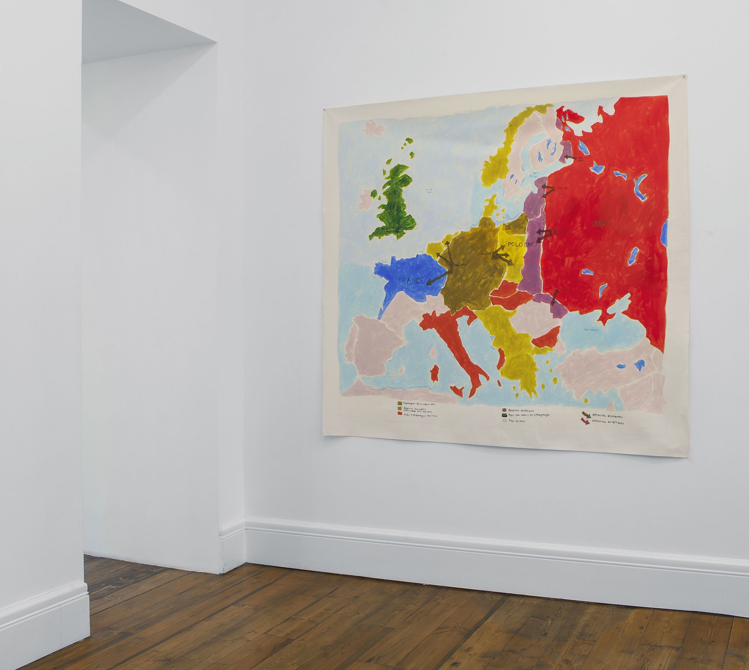 Paris is Burning (1991) / Is Paris Burning? (1944) from 1992 is the first work in the exhibition, occupying the ground floor space. The work has not been shown publicly since Kilimnik’s very first museum show at the ICA Philadelphia in 1992. It is an important example of her early sculptural work – a genre for which she gained attention in the late 1980s alongside artists such as Mike Kelley and Cady Noland. Other early examples include The Joker Episode of the Avengers (1991) – part of a series of works based on the British television series The Avengers. In the work on view, an assortment of objects is displayed throughout the exhibition space, seemingly at random, giving the illusion of an abandoned stage set or a display in a store window. On the back wall, the two halves of the work’s title are announced in bold white typeface on black posters, simulating the cards used in silent movies as well as the aesthetic in Jennie Livingstone’s 1990 documentary, Paris is Burning. At a remove from each other, the titles indicate two narrative frames for the incongruous props and posters that appear around them. On the left, ‘Is Paris Burning?’ Refers to a Hollywood movie from 1966 that centred on Hitler’s real-life plans to destroy Paris in 1944, hours before it was liberated from Nazi rule. Meanwhile on the right, Kilimnik uses the aforementioned documentary that followed the thriving ball culture engendered by New York City’s African-American, Latino, gay, and transgender communities. The films collide in the installation: the stigmatic symbol of the swastika brands a red dress like a flag, and is displayed with a bandaged leg, skis, tights, a jacket, and other costume and fashion items. The props appear to be selected from the historic and recent past to overlap in a disconcerting mise en scène of twentieth century experience. On the left, photos are displayed from the Hollywood movie, showing cities ravaged by bombs and battles in the Second World War. On the right, ball vocabulary appears with the names of the most illustrious New York drag ‘houses’. Kilimnik uses the idea of the stage set to re-present icons of evil as adornment, fashion and fascism, and to present historical fact as theatre. Through presenting these two discordant areas of history – war-torn Europe and countercultural New York, she examines how cultures are established through varying means.