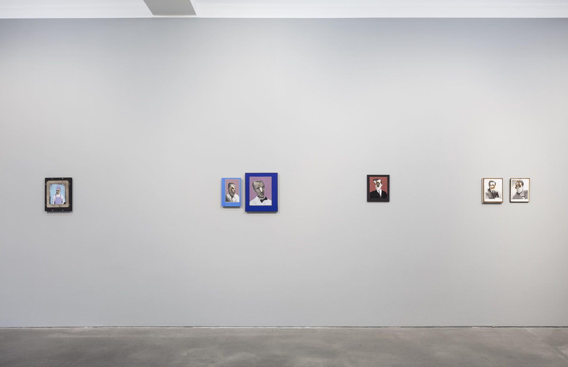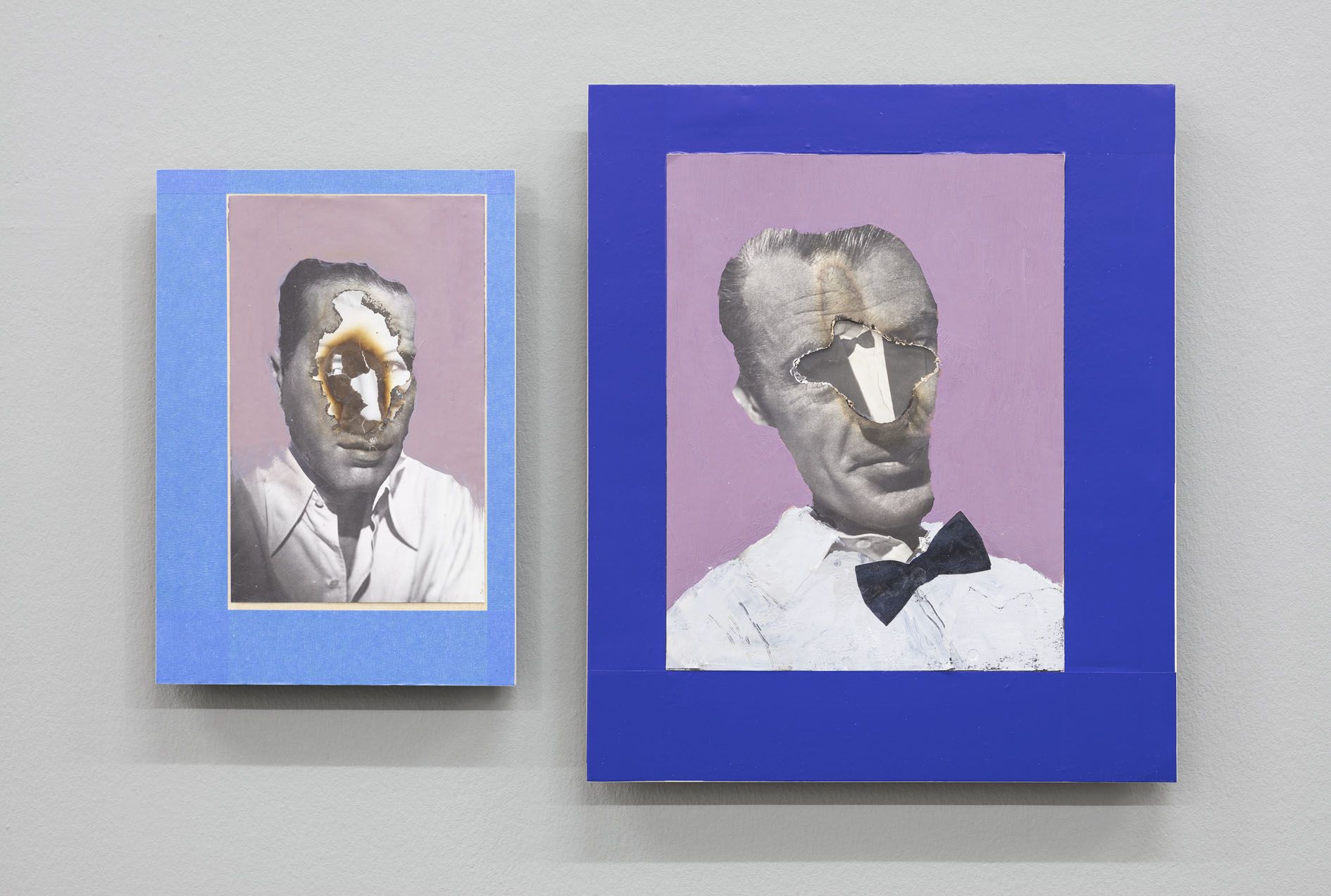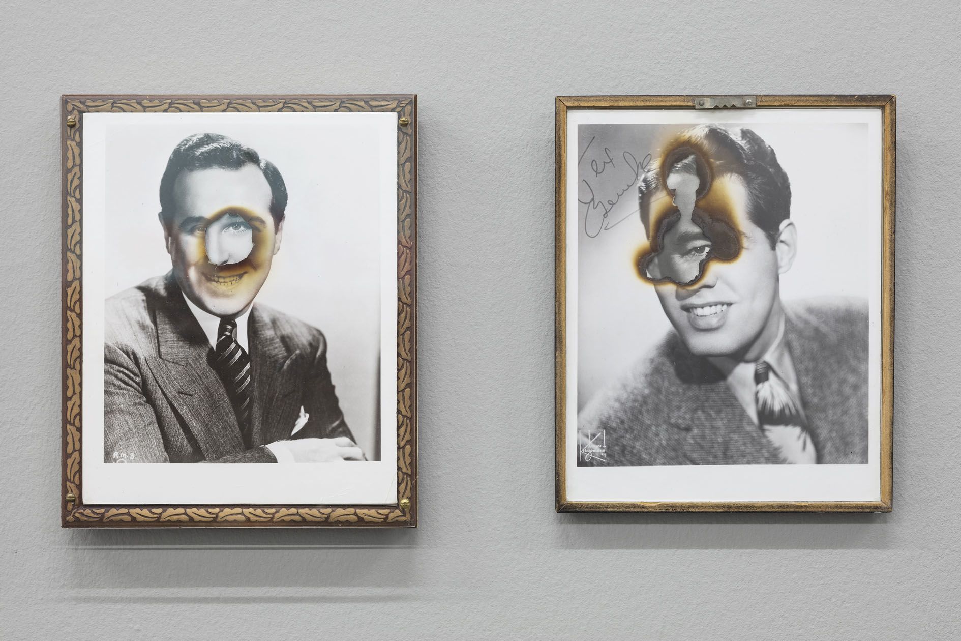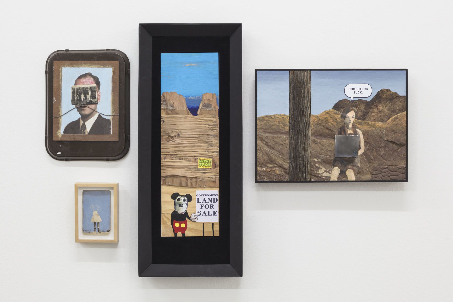 Foulkes’ recent paintings incorporate his usual artistic paraphernalia, including paint, wood, photographs and numerous found objects. Yet he has also added new techniques to his repertoire. In several portraits on view, glamorous black-and-white movie headshots, which Foulkes sourced from flea markets and shops around Los Angeles, are layered atop one another. The artist has burned holes into their faces so that those of other long-lost actors show through, digging back through time to reveal forgotten lives and aspirations. In two larger works, more familiar figures take center stage: He’ll Always Be Here depicts the artist and his recurring nemesis, Mickey Mouse, who materializes from the wood grain above him like a hovering storm cloud. In The Wall, Foulkes’ latest declaration against the current President of the United States, an open-mouthed Trump has tumbled from a brick façade like a pitiful Humpty Dumpty figure. Presented in Berlin, this work poignantly recalls German history and the social and psychological damage that border walls inflict.
