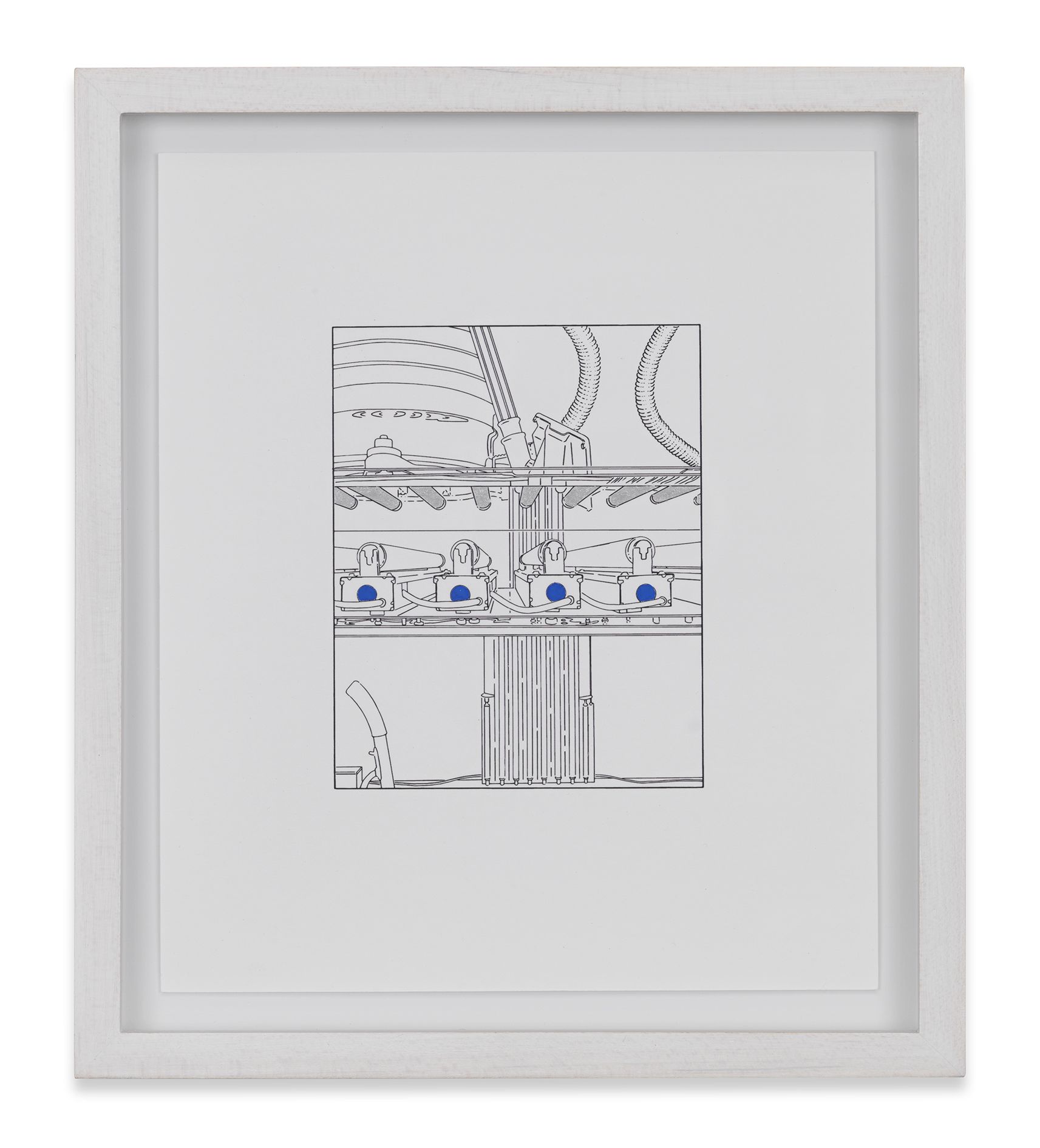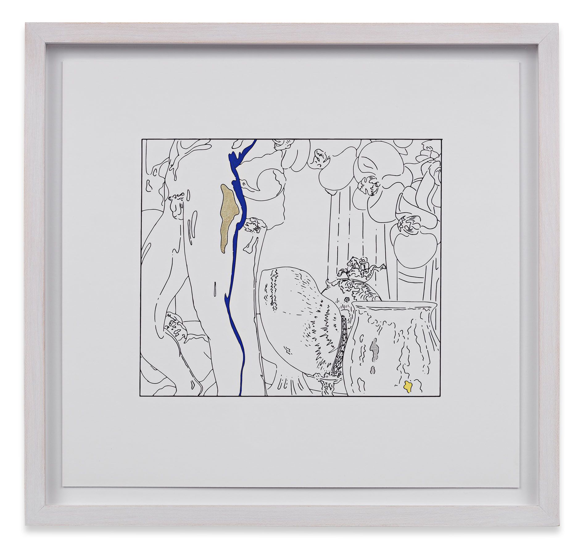 Over the last 30 years, Louise Lawler has been making photographs that depict views of objects and artworks in their everyday working environments, shifting the emphasis from the subject itself to vantage points, framing devices and the modes of distribution that affect the reception of an artwork. For No Drones, Lawler will exhibit a group of ‘tracings’, a series that she developed for her exhibition at the Museum Ludwig, Cologne, in 2013. Traced directly from her photographs, and made in collaboration with the artist and children’s book illustrator Jon Buller, the ‘tracings’ are black-and-white line drawings that are converted to a vector graphic and printed on a vinyl that is adhered directly to the wall. Each edition exists as an adaptable digital file that can be printed at any size. A particular group of tracings exhibited on this occasion, for instance, have been produced to adapt to the large walls of the Berlin gallery. A ‘tracing’ takes material form only when exhibited, and it can be destroyed and remade in a different size for its next presentation. Some of the works in the show are editions of 10, while others are unlimited editions.