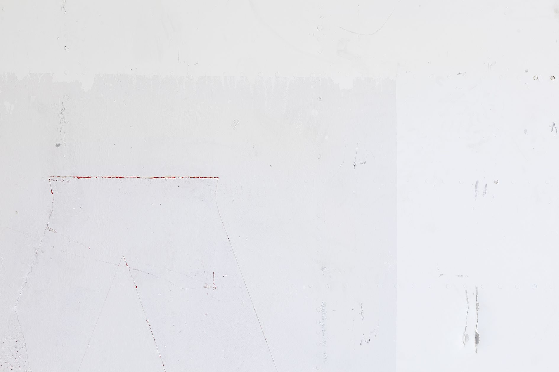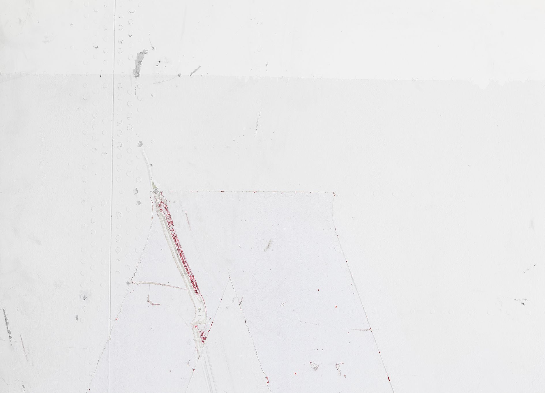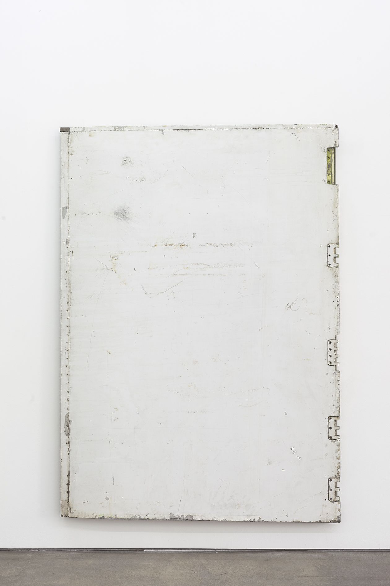 Michail Pirgelis finds the material for the majority of his works on airplane cemeteries in California and Arizona, where discarded passenger planes await their dismantling and the recycling of their valuable aluminium and titanium alloys. Pirgelis removes individual segments from the gigantic aeronautical bodies, for further modification in his studio. For adopted he has left some of them in their original state, such as the brake mechanism of the work Onera, almost three meters in size and reminiscent of a cross. On other airplane components such as the canvas-sized, rectangular fragments of an airplane’s exterior skin, he has partially exposed the metal beneath the coat of lacquer. Likewise he has sanded and polished the calotte in When it is called moment – a component from the fuselage of an airplane, responsible for cabin pressurisation, normally invisible to passengers – until its curved aluminium surface resembles a convex mirror. Together with another calotte it looms in a concentric configuration into the exhibition space. Finally, for the work Beer or Wine, Pirgelis has mounted flexible airplane cabin flooring, which still retain all the traces of adhesive, screws, and the holes for seat legs, on an invisible base with a suspension mechanism.