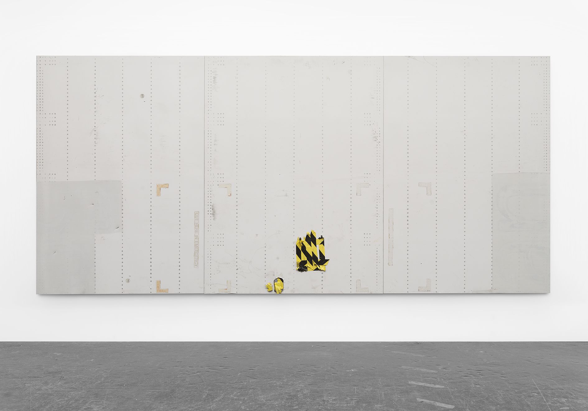 Michail Pirgelis’ works begin with materials from discarded aircraft, which he culls from airplane cemeteries in California and Arizona. Pirgelis alters these materials only minimally, leaving the painted surfaces on most of his objects as he found them. He is known to grind and polish select cut-outs, remove portions of lettering or uncover rivet lines, so the viewer essentially finds a surface marked by weather elements and traces of use, the sand, sun, and desert storms. They are complex aesthetic surfaces that bear a clear reference to painting. In a sense, these objects could also be read as ‘found abstraction’. Large-scale wall works like Second Chance (2016) or Neverending Story I (2014) have the look of heavy canvases, while the floor panels in works like Beer or Wine (2014) recall minimalistic sculptures. But for all the clear visual references, Pirgelis’ objects could hardly be a more radical undermining of these same art-historical traditions. None of his objects has the pristine, immaculate surface of a Donald Judd or Carl André. None of them is ‘invented’, ‘produced’ or even ‘commented upon’. They are not even readable as ready-mades, because it is impossible to see what the sculptures once were. The objects’ materials and existing forms have been completely stripped of their original purpose. Pirgelis’ works take viewers to the limits of their unconscious knowledge of what constitutes an object. They are sculptures that thwart their own objectivity, situating themselves on the brink of non-objecthood.