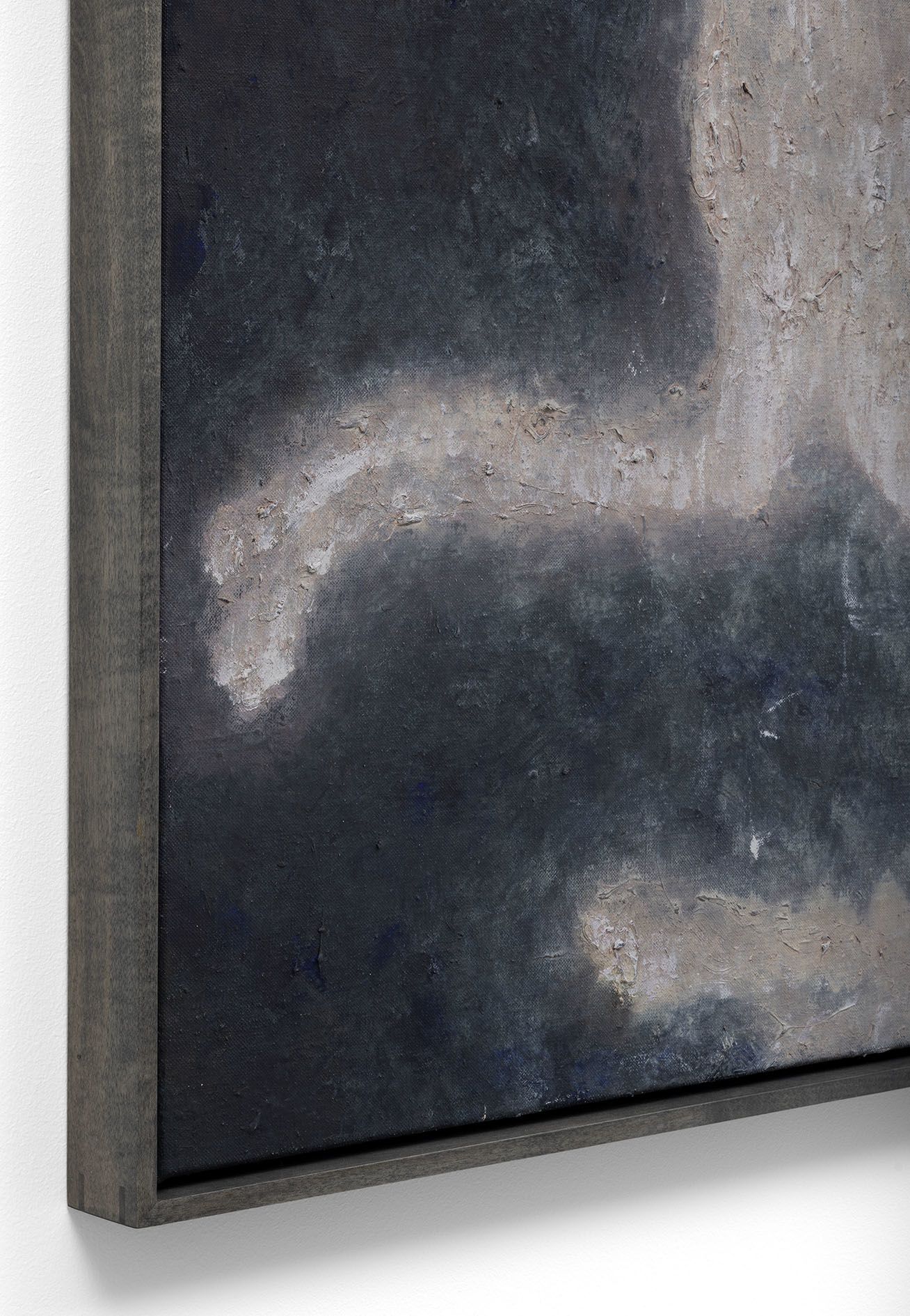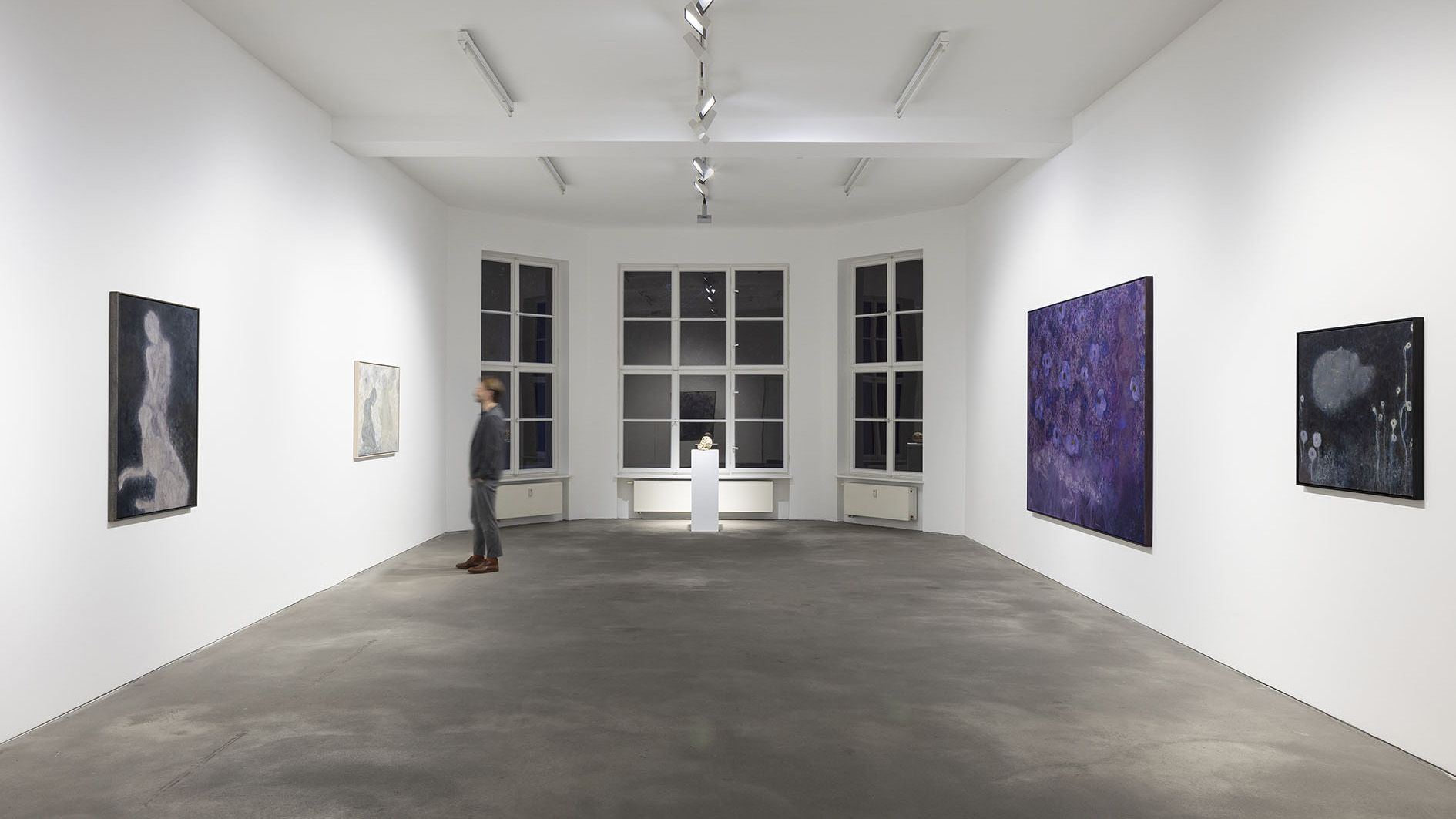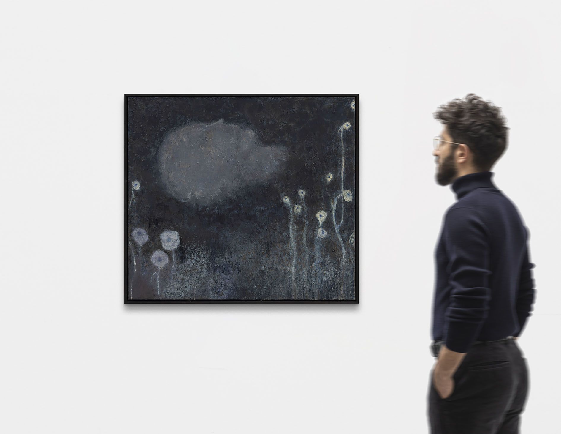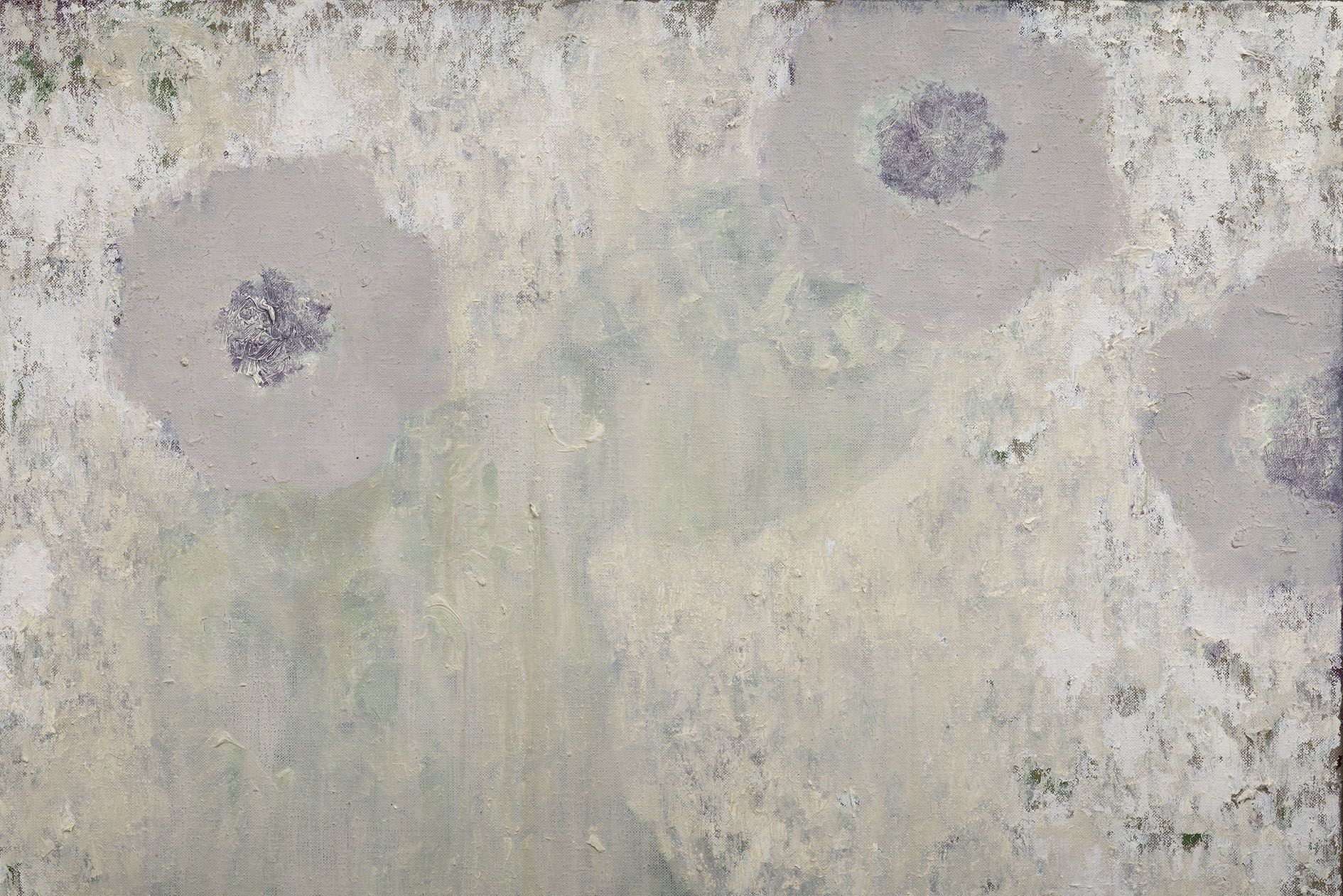 In a lengthy process that takes months to years, he conjures ghostly fauna and figures that seem to haunt his works. The artist evolves his surfaces as highly textured topographies: thick layers of wax and impasto areas are reworked multiple times.