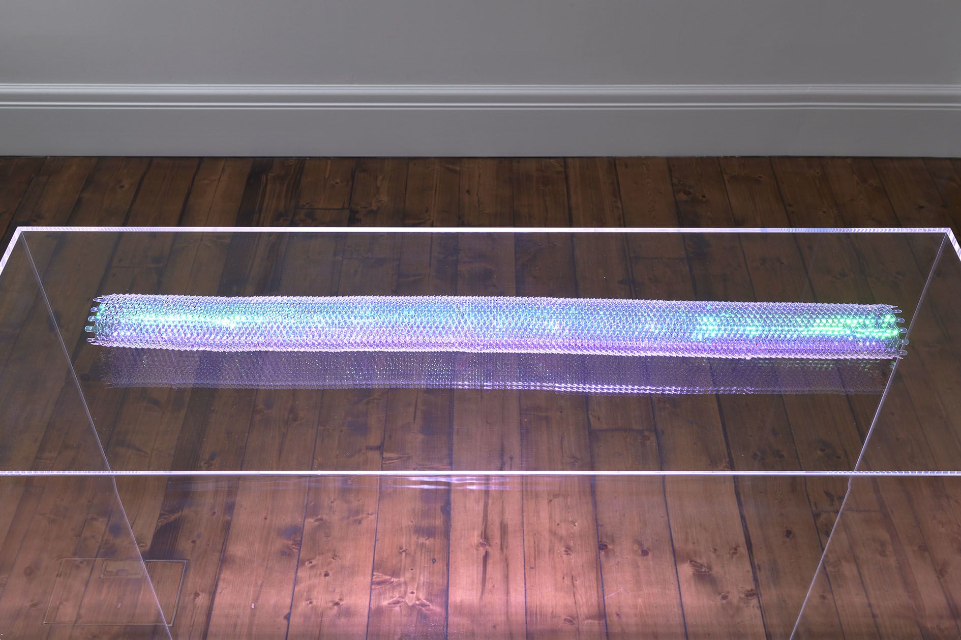 Flickering LED spotlights illuminate snakebot skins resting on transparent pedestals, transpose the mimesis of nature into a new kind of naturalness marked by diodes and hyperconnectivity. The wood of the floor shimmers, a reminder of dismantled ecosystems.