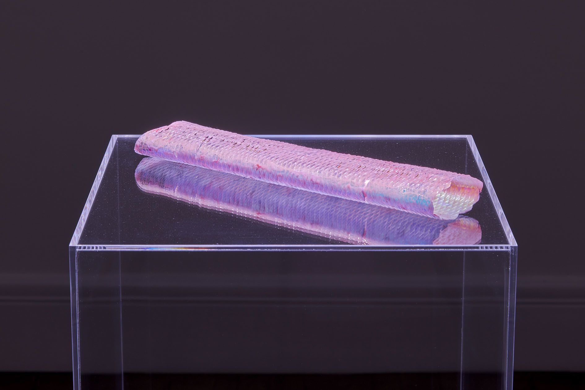 Ekdysian robot snake skin, kirigami cut PVC, perspex plinth, LED projector, light
