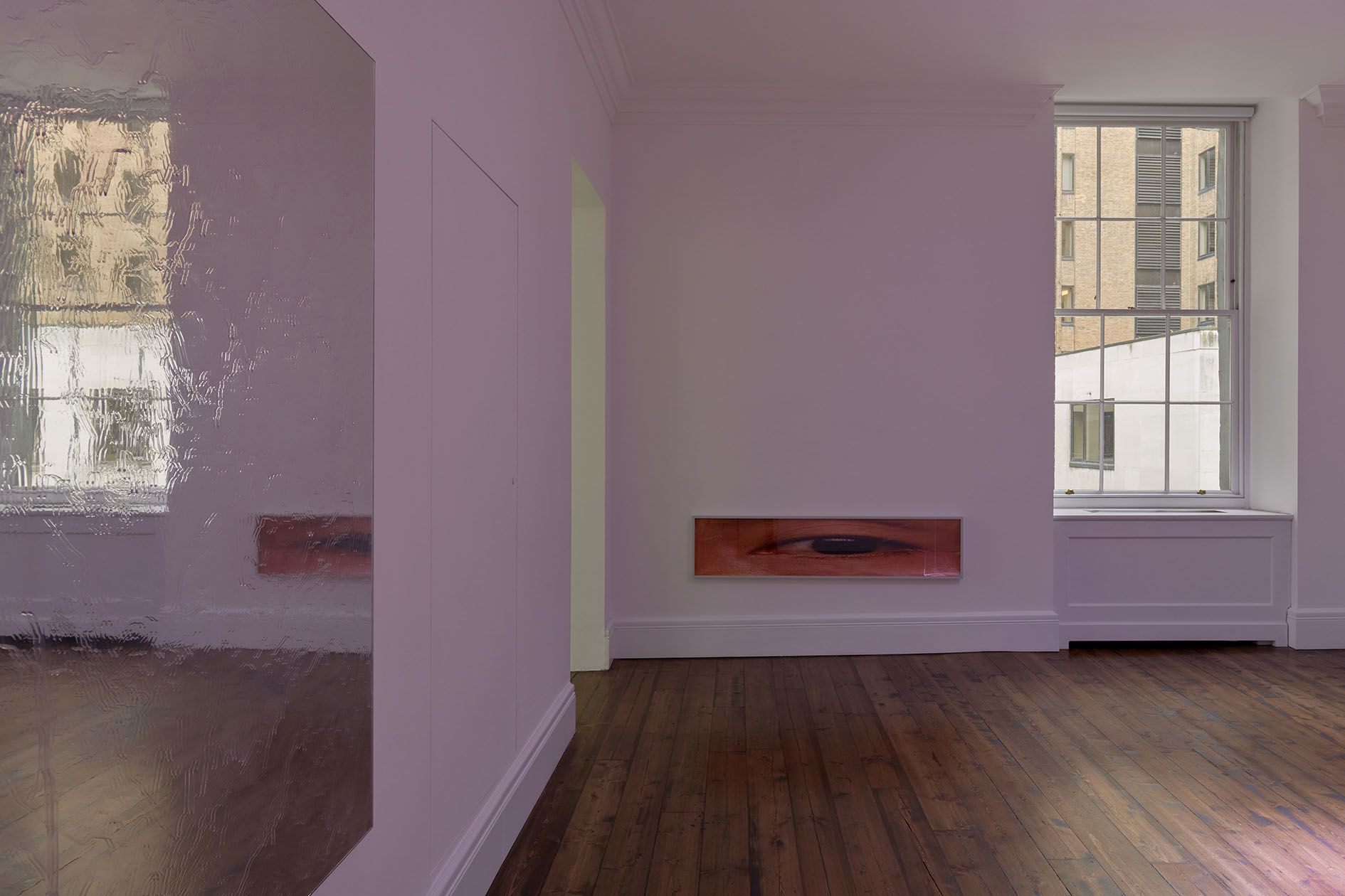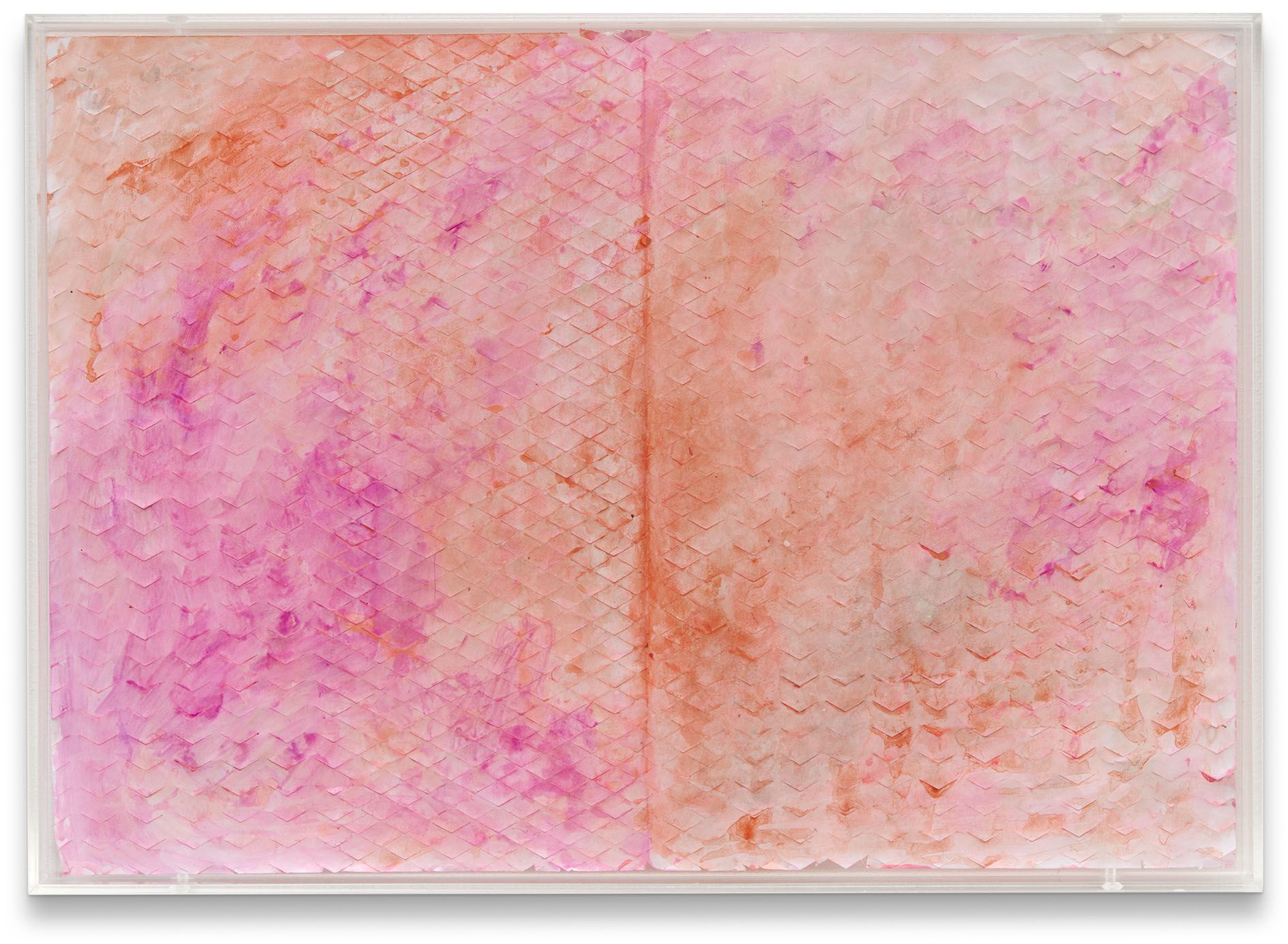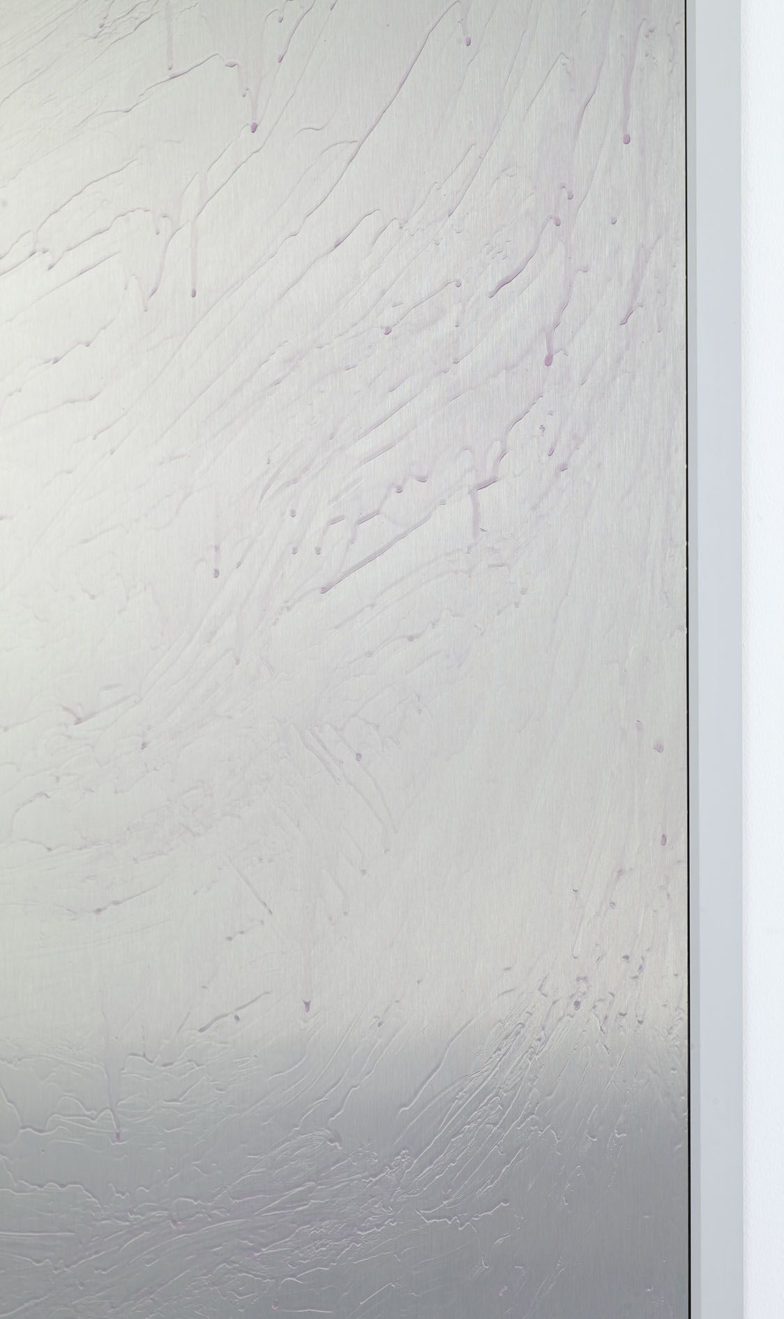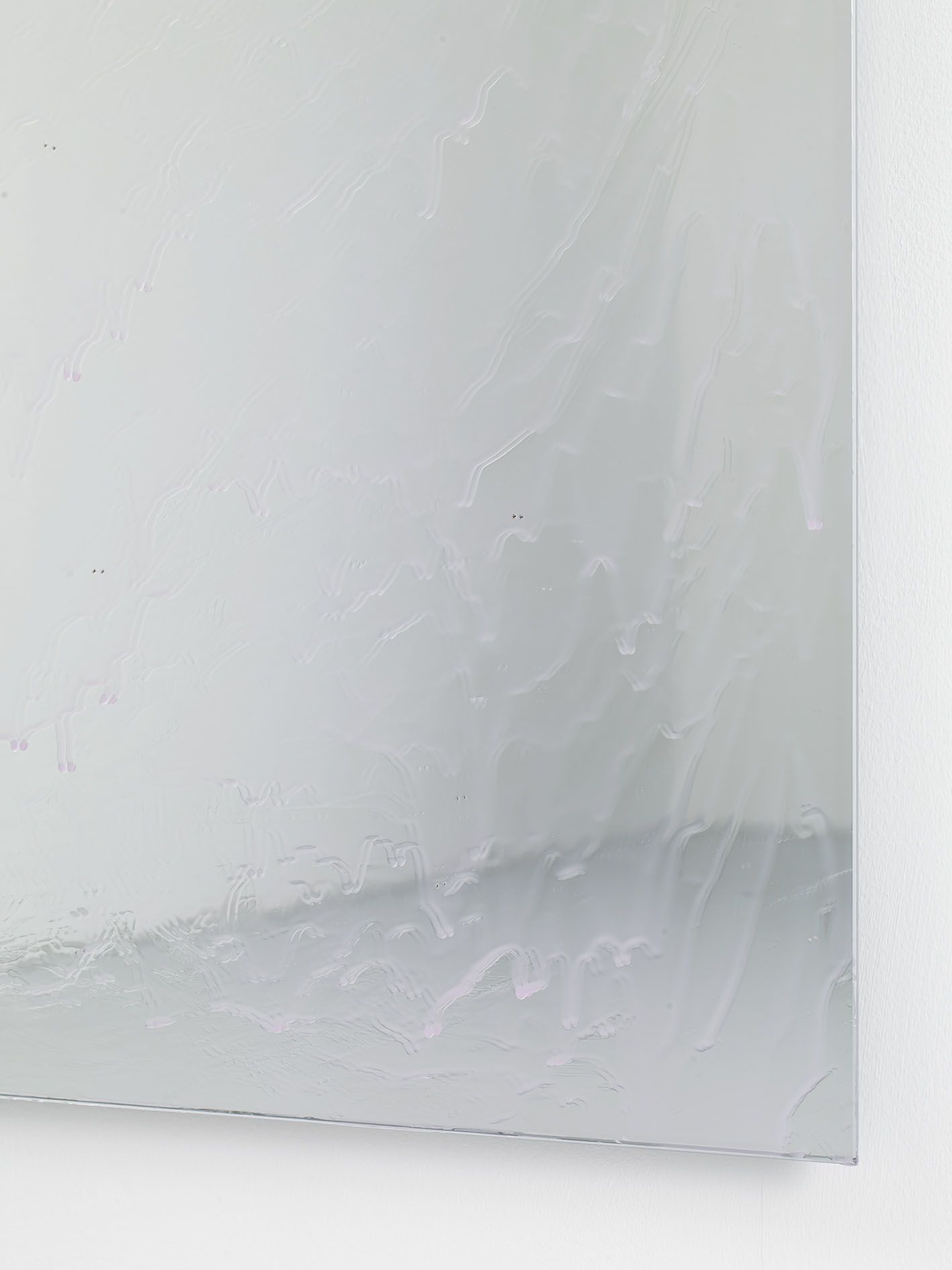 Rosenkranz lightly coats the works with delicate, semitransparent layers of pink. Its color appears again and again in Rosenkranz’s work, a reference to human tissue. The translucent layers of pink pigment on reflective surfaces, a hue not present in our biological spectrum, troubles the perception of our own visible reflection and the identity we construct when looking at ourselves.