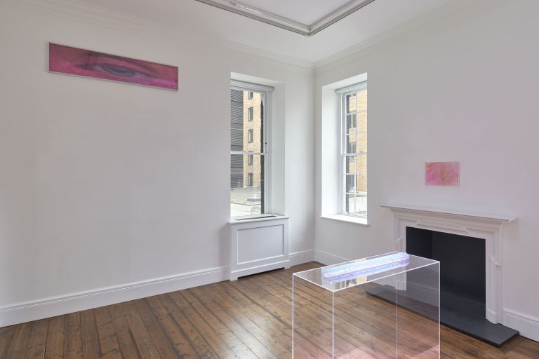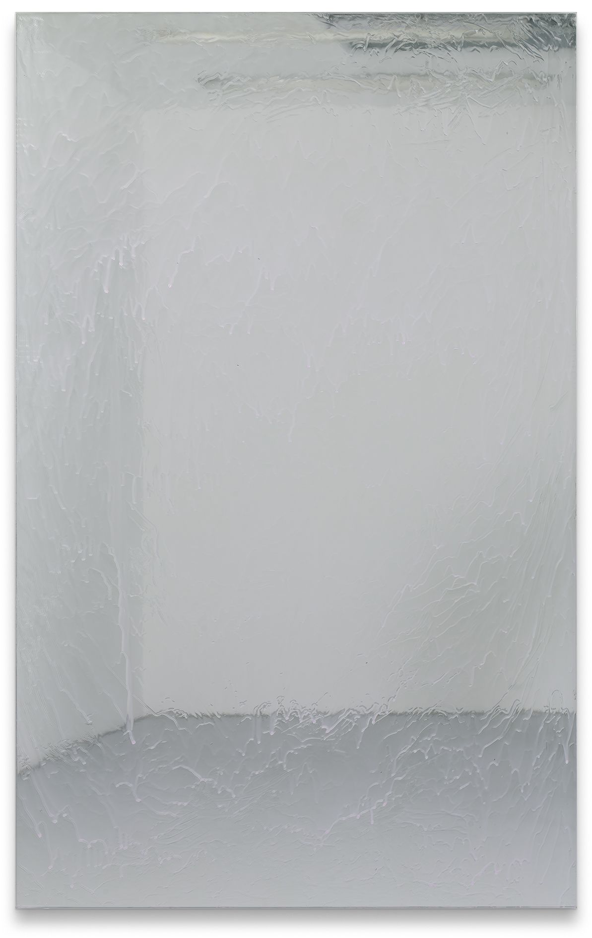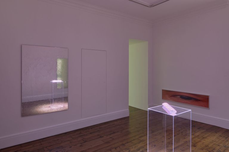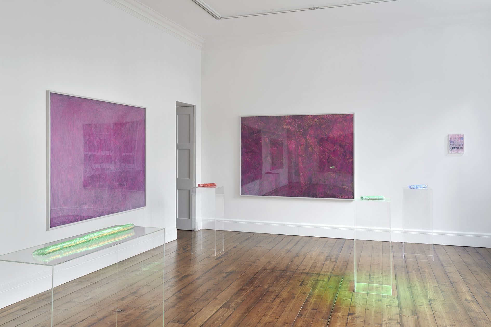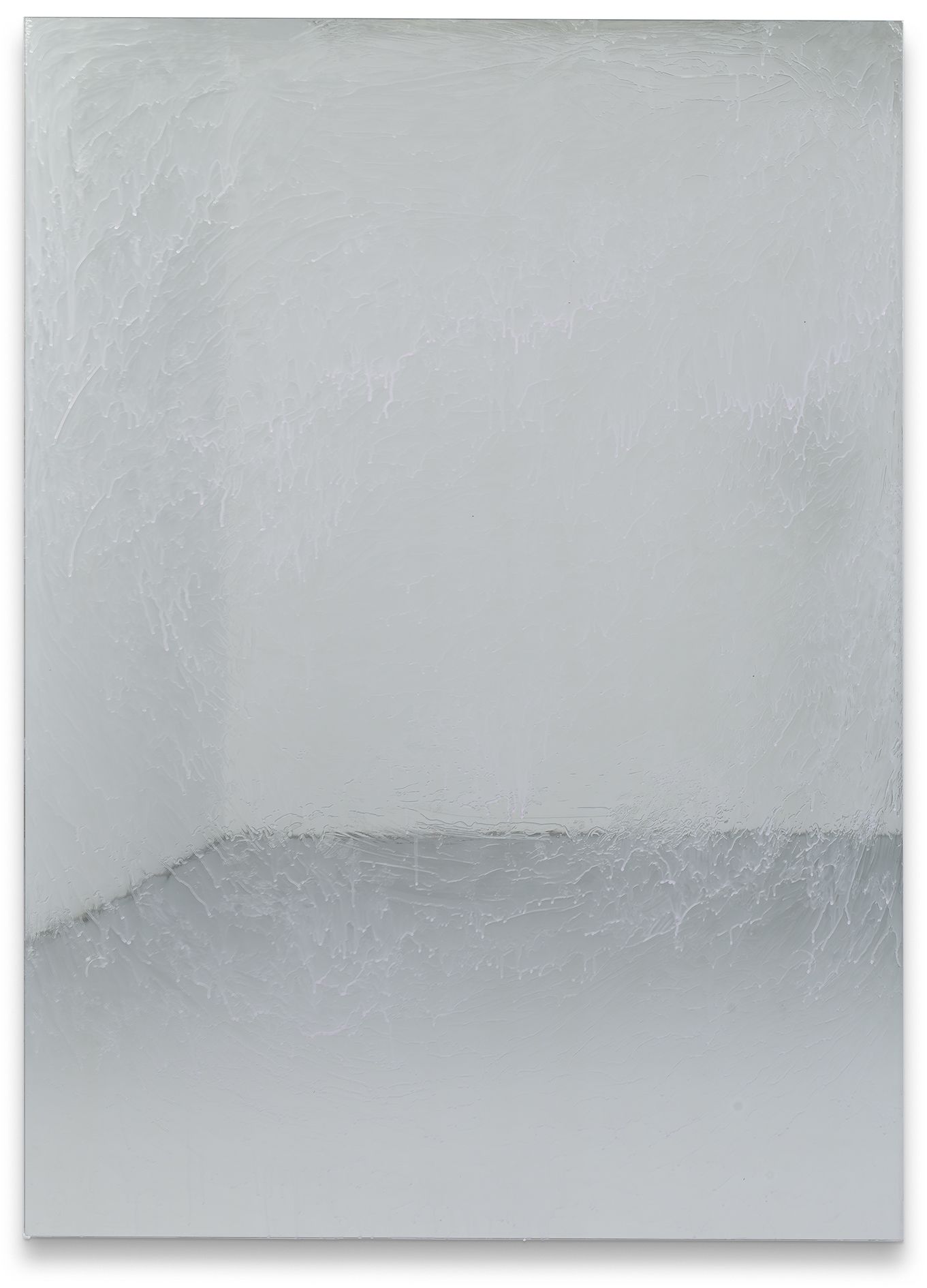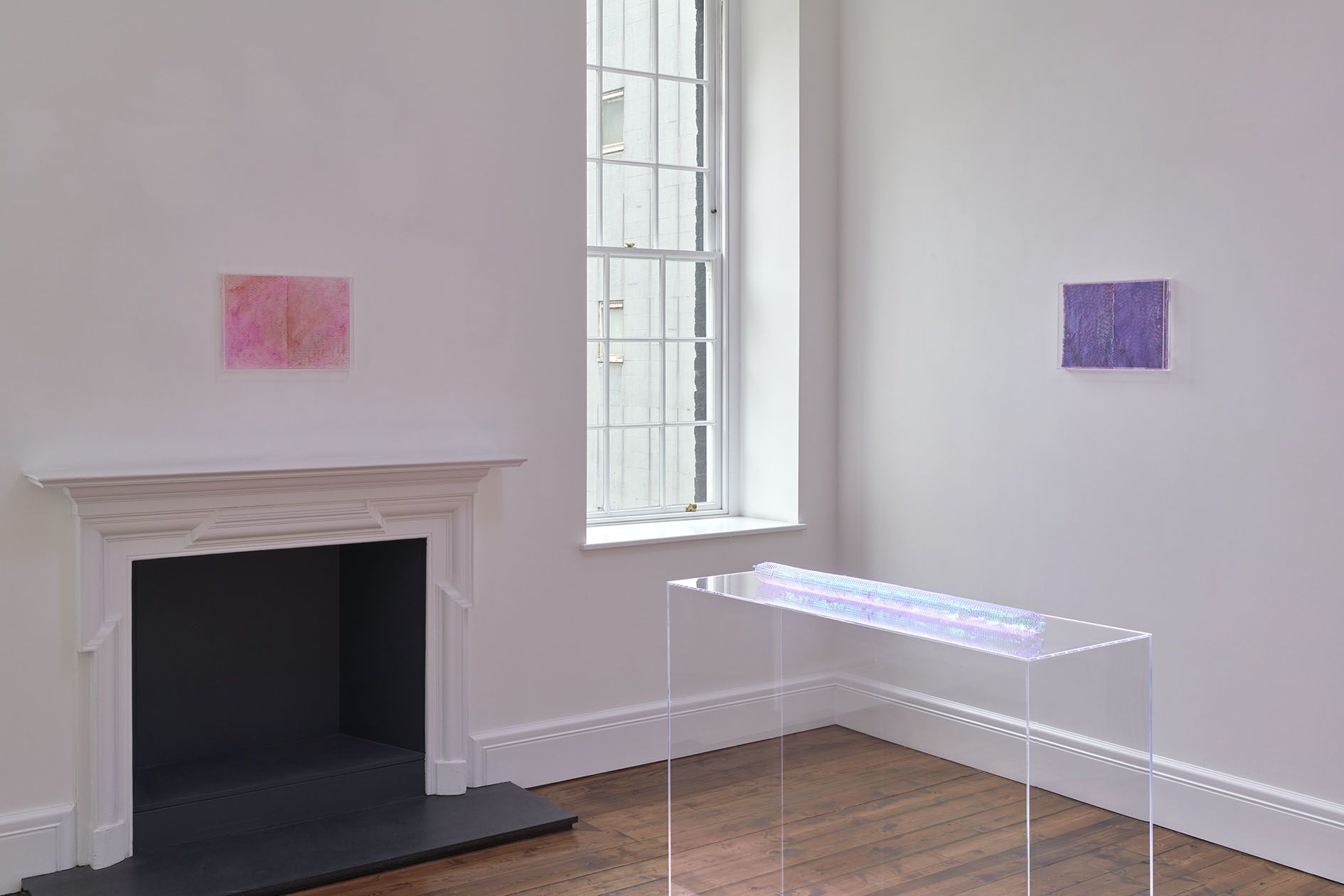 Rosenkranz lightly coats the works with delicate, semitransparent layers of pink. Its color appears again and again in Rosenkranz’s work, a reference to human tissue. The translucent layers of pink pigment on reflective surfaces, a hue not present in our biological spectrum, troubles the perception of our own visible reflection and the identity we construct when looking at ourselves.