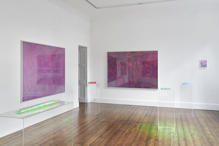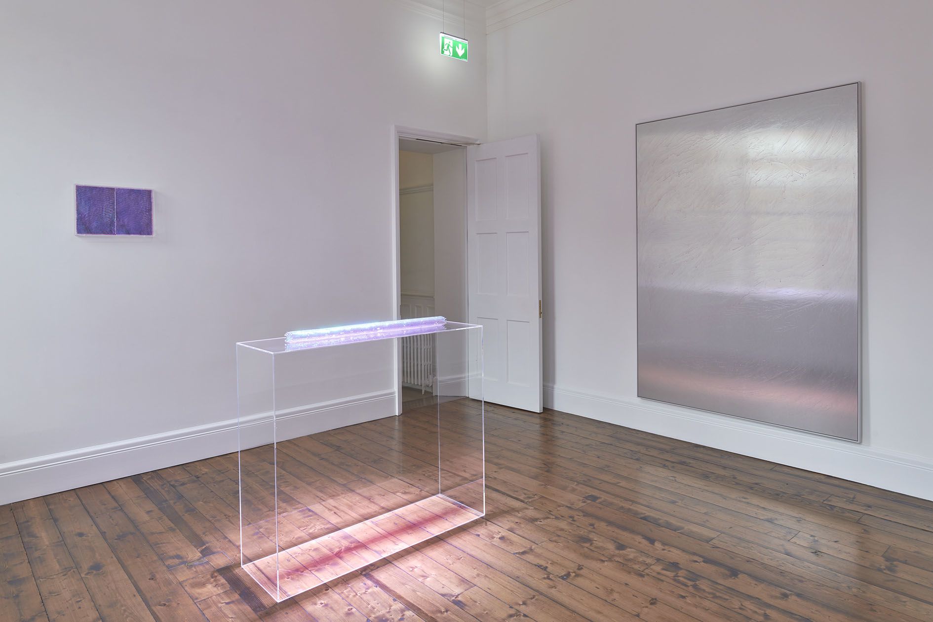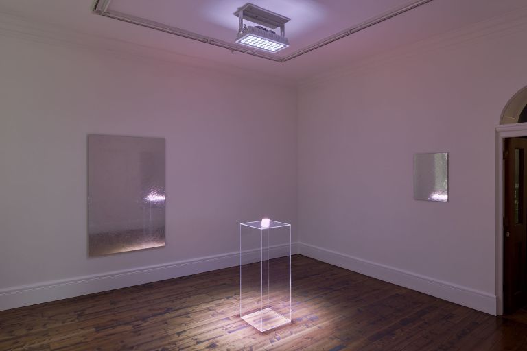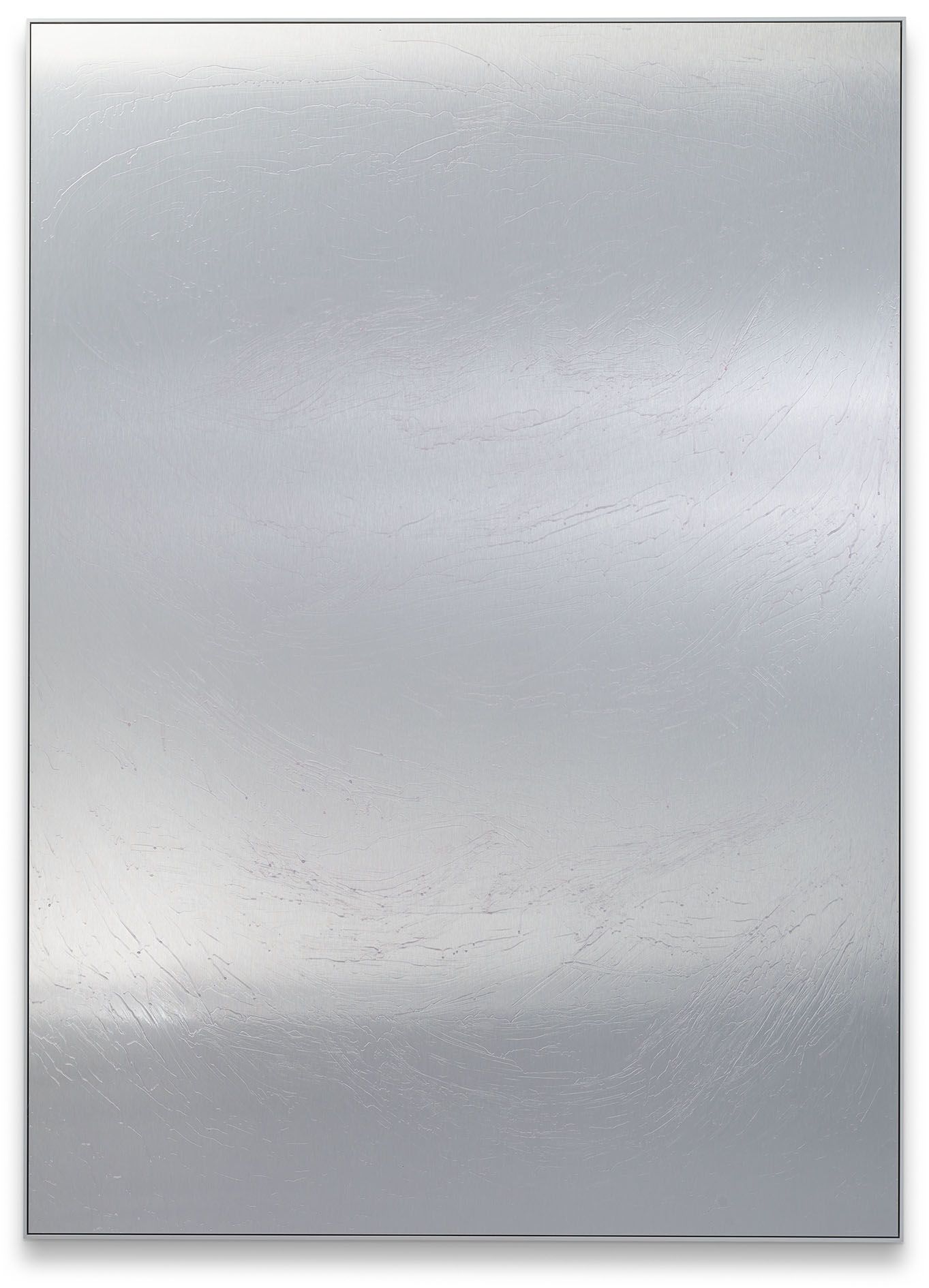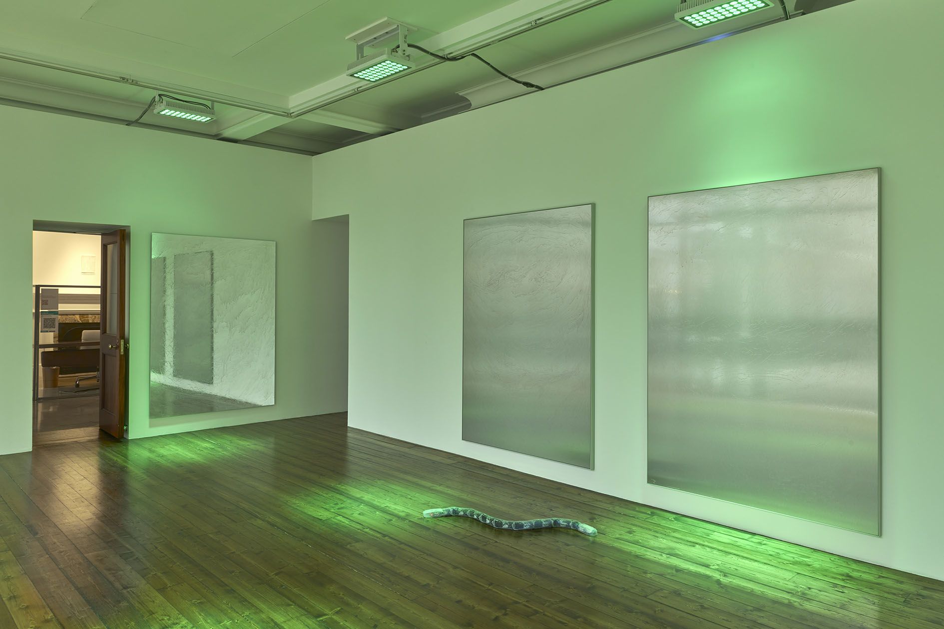 Other neurologically-complex experiential spaces emerge in the reflective surfaces of aluminum and mirrors. Perpendicularly situated on the exhibition walls, the aluminum paintings and mirrored planes add another dimension to the space.
