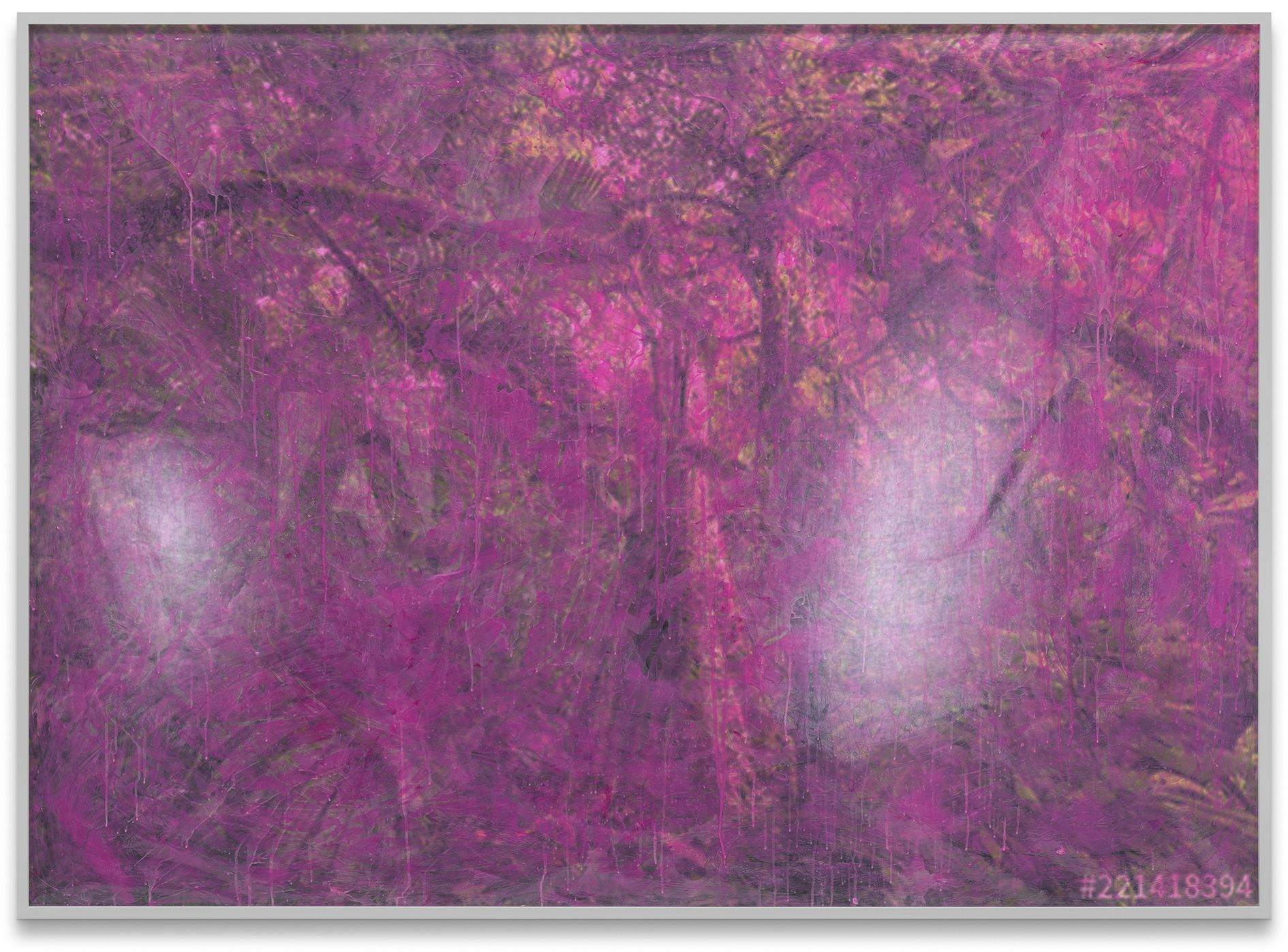 The artist also applies the pink pigment to agency-watermarked images of the Amazon, always by hand using distinct, overlapping transparent-pinkish layers that have an arresting effect on motion, making it appear frozen. The beguiling paintings shift nature, archaic symbols, culture at large—transformed, branded and trademarked by international corporations—to new contexts. Oscillating between the sublime and the abstract, the repetitive and the expressive, the paintings evoke everything from pinkish-flesh to glowing, supernaturally green chlorophyll, simulating an aesthetic experience that is at once immersive and unsettling, protective and devastating. Nature as idea—immersive and alienating.