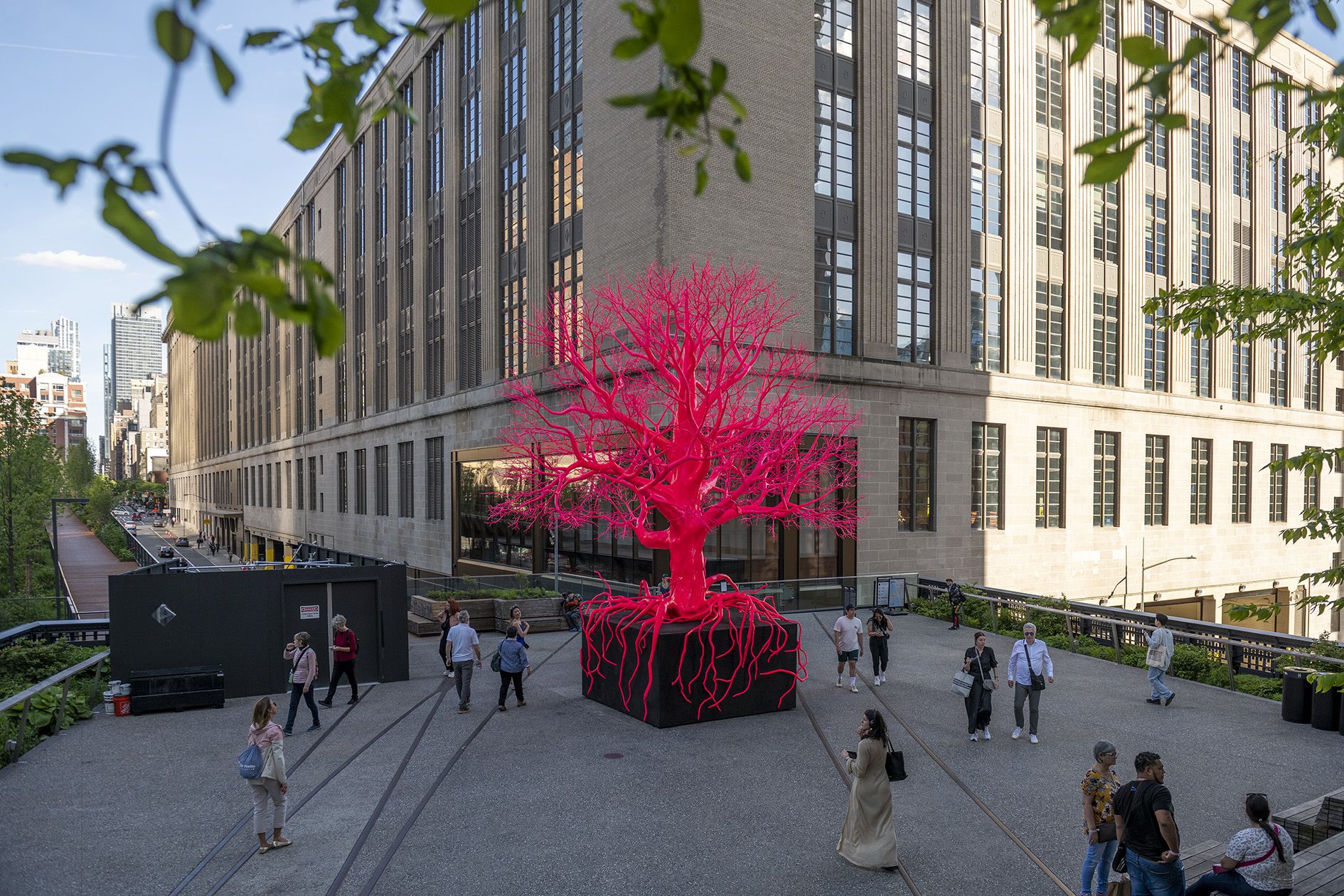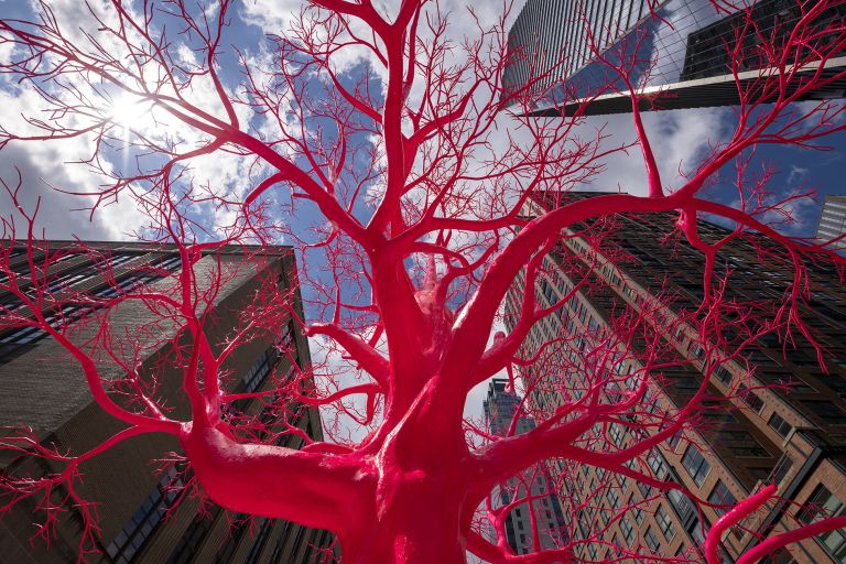 In a process that involves merging scans of actual trees with those of human circulatory systems into a digital sculpture, a metal armature was fabricated on which layers of tactile polymer were applied by hand. Displaying visceral qualities, the tree’s branches resemble the human organ system, and its vivid reddish-pink pigment reminds of blood circulating through live tissue. Citing the pink hues the artist uses across her works, she has developed a translucent gloss that coats the entire 25-foot-tall tree. The branches carry three different sizes of branchlets, the ends of which mimic the structure and arrangement of leaves that bear no lamina.