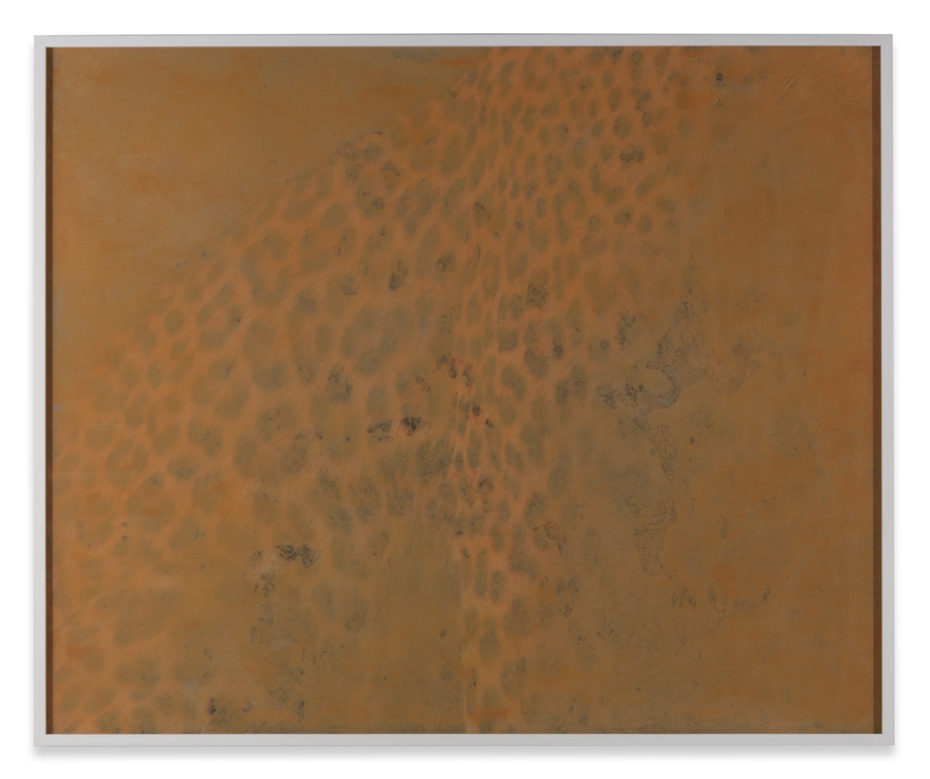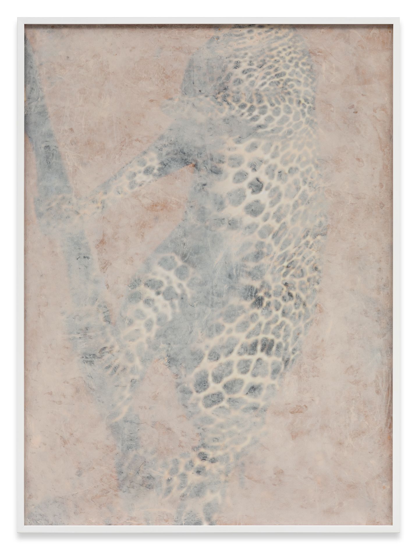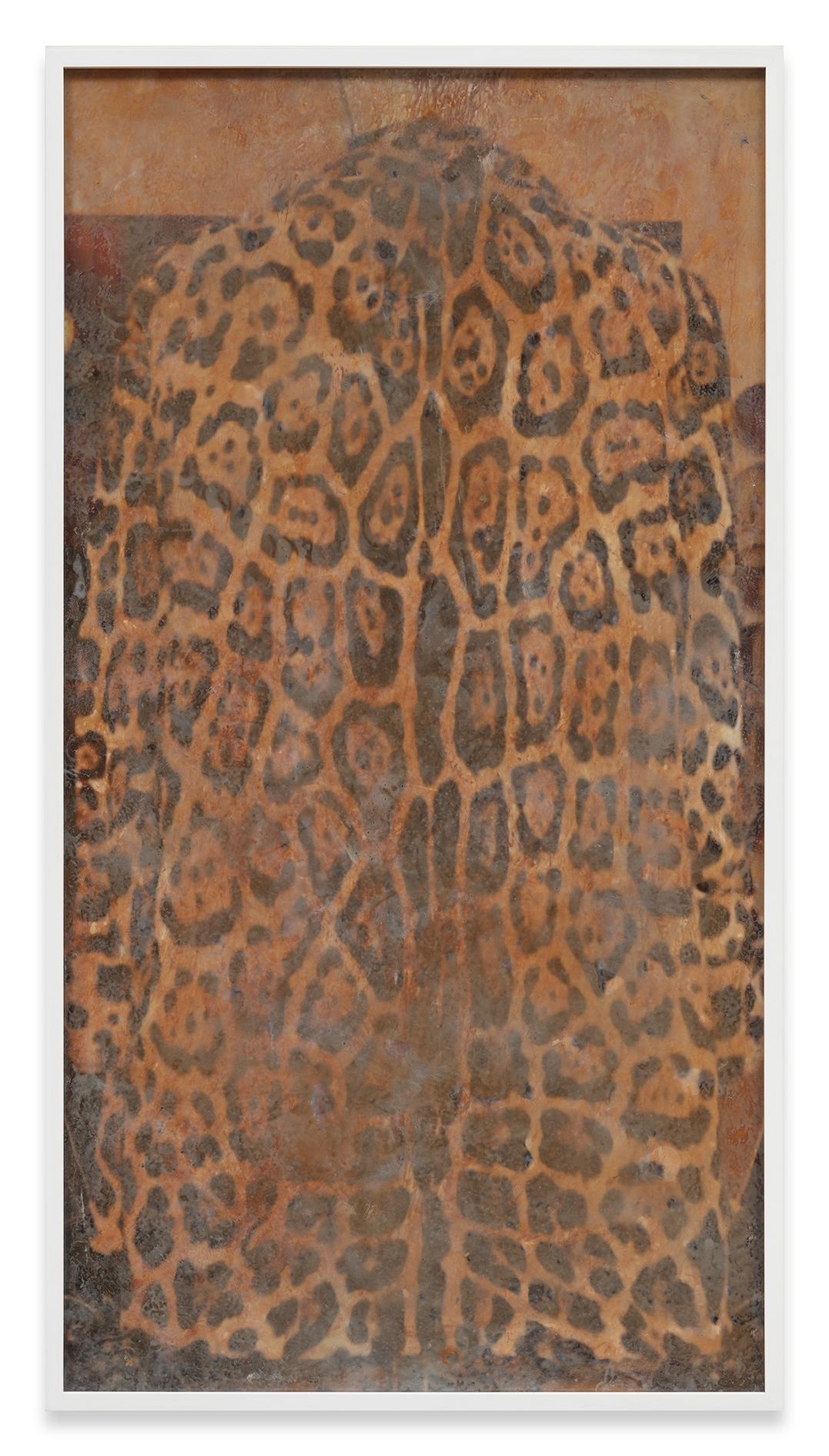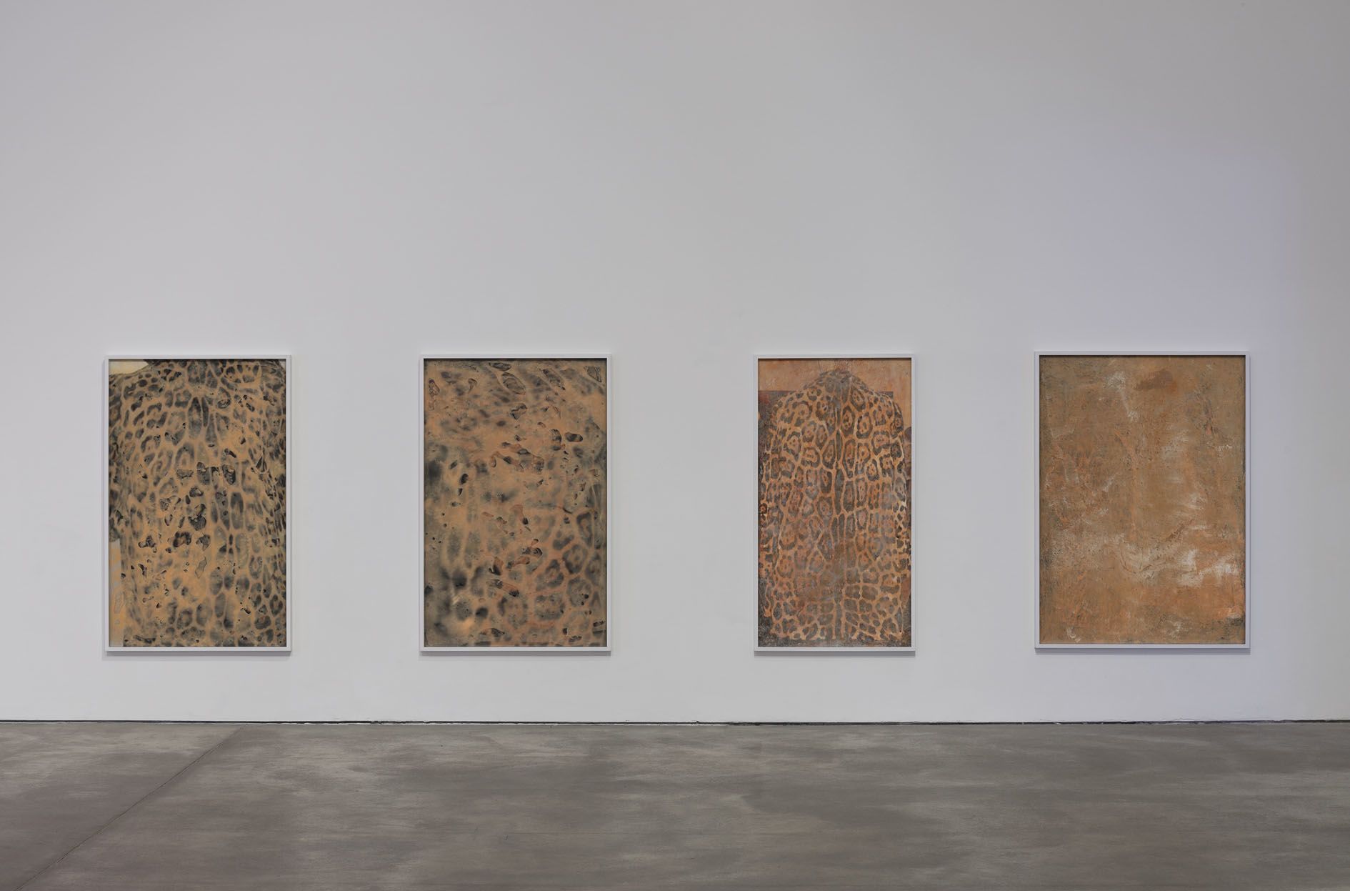 Rosenkranz probes the sensory stimulations that have triggered ‘hard-wired’ responses in humans since prehistoric times. She mines these malleable codes that have been manipulated in contemporary consumer culture, by commercial enterprises such as the fashion and perfume industries. Rosenkranz starts, in a series of new paintings, with the tabby patterns of cats. Often evoking images of ‘sexiness’ and sensual attraction, their stripes and patterns have emerged through complex evolutionary processes – the camouflaged surface of their fur simulates the light and shadows of their original habitat. More than 60 years ago, Alan Turing published a visionary paper on the mathematics of patterns that were repeated regularly in nature, but it is only recently that biologists have begun to uncover evidence of the patterning mechanisms that Turing proposed. It is known that tabby patterns not only trigger fight or flight responses in humans – to whose primordial ancestors, cats were a natural enemy – but that they also signal sexual and cultural dominance. The paintings on view develop a method that Rosenkranz has used previously: she applies layers of transparent skin-tone acrylic paint to cutouts of photographs that resulted from a Google Image search, covering the image with a three-dimensional and porous ‘skin’. The paint she uses replicates skin tones as well as the sand and earth hues native to the sub-Saharan African landscape where cats first hunted men, and where human language and culture emerged.