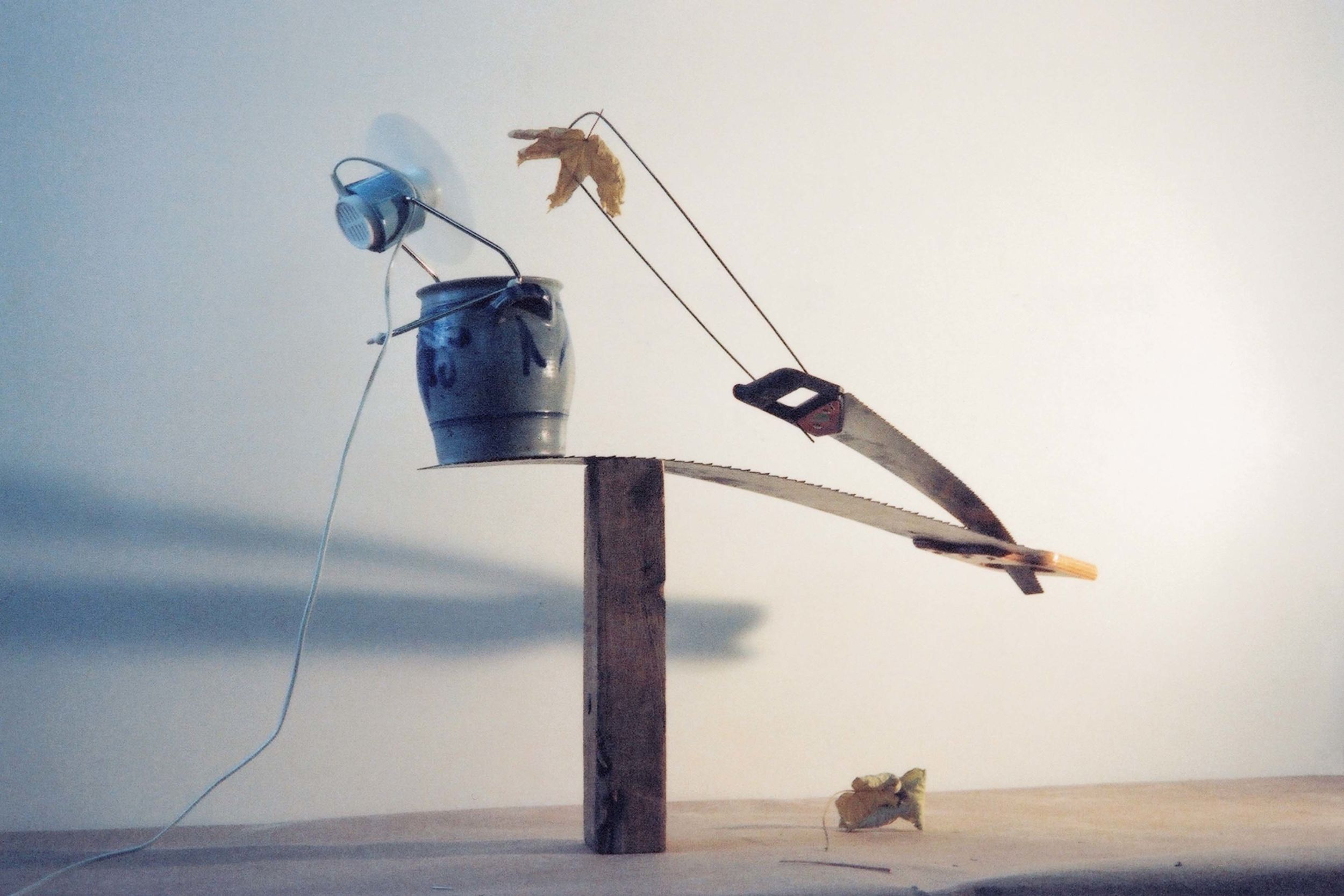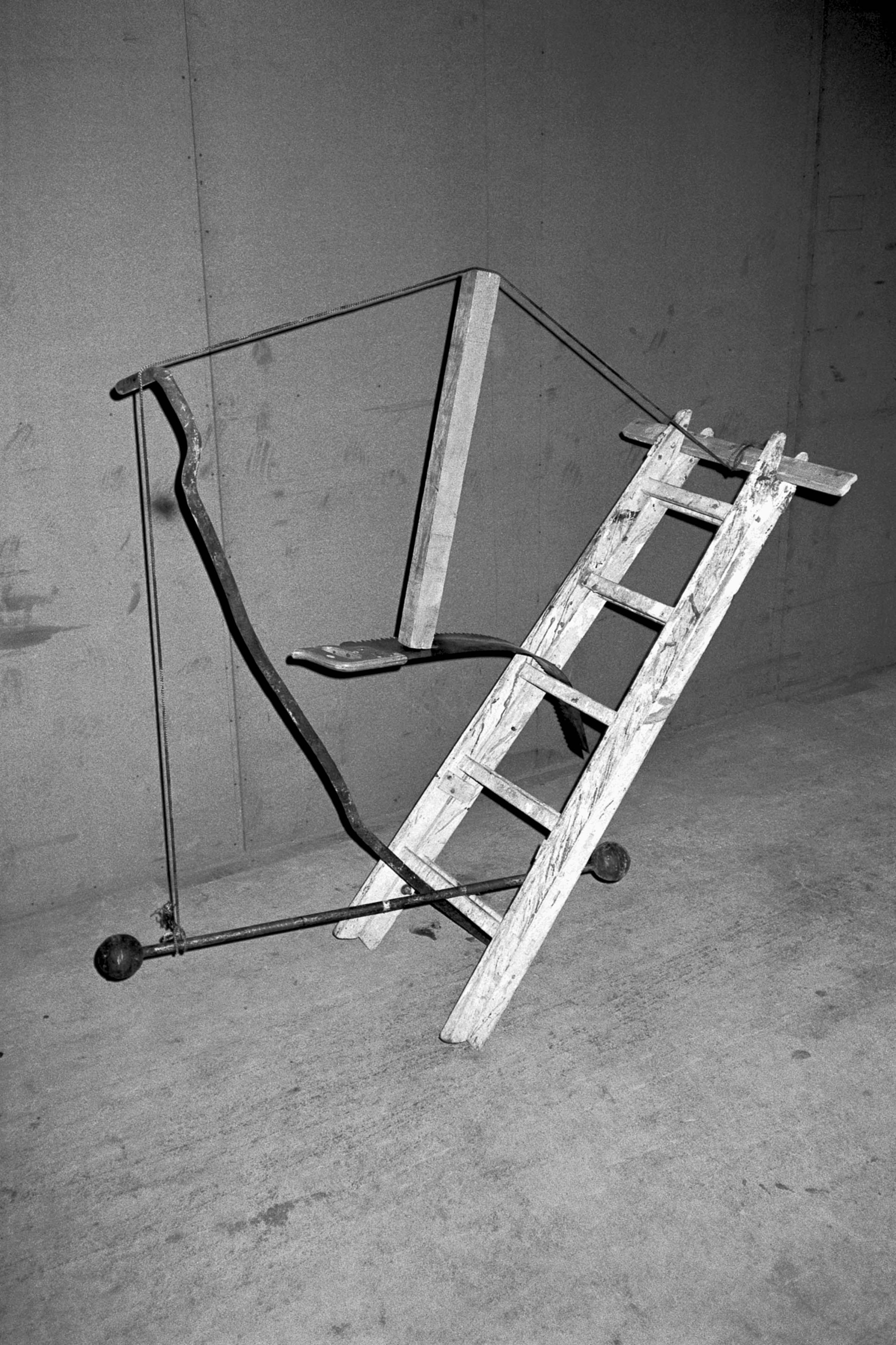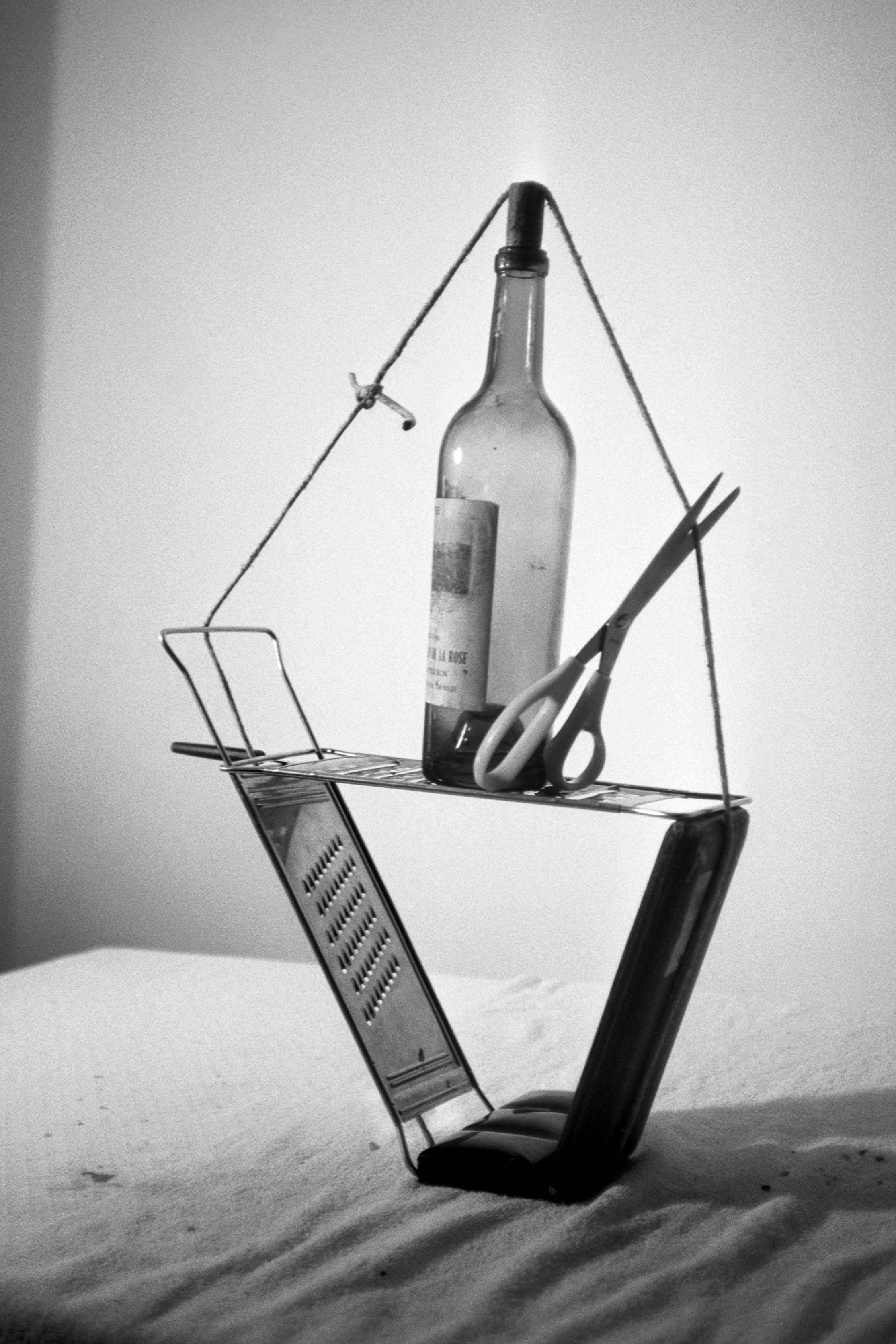 The photographs Equilibres were created in the years 1984 and 1986. It is a series of 82 black-and-white and colour photographs showing assemblages of everyday objects. The attention is drawn to a dizzying construction, with gravity seemingly working in reverse, creating a state of suspension which cancels the weight and the value of the individual components. This is also summarized in the subheading of the Equilibres of Peter Fischli and David Weiss: „Am schönsten ist das Gleichgewicht, kurz bevor’s zusammenbricht.“ („Balance is most beautiful just before it collapses.“)
