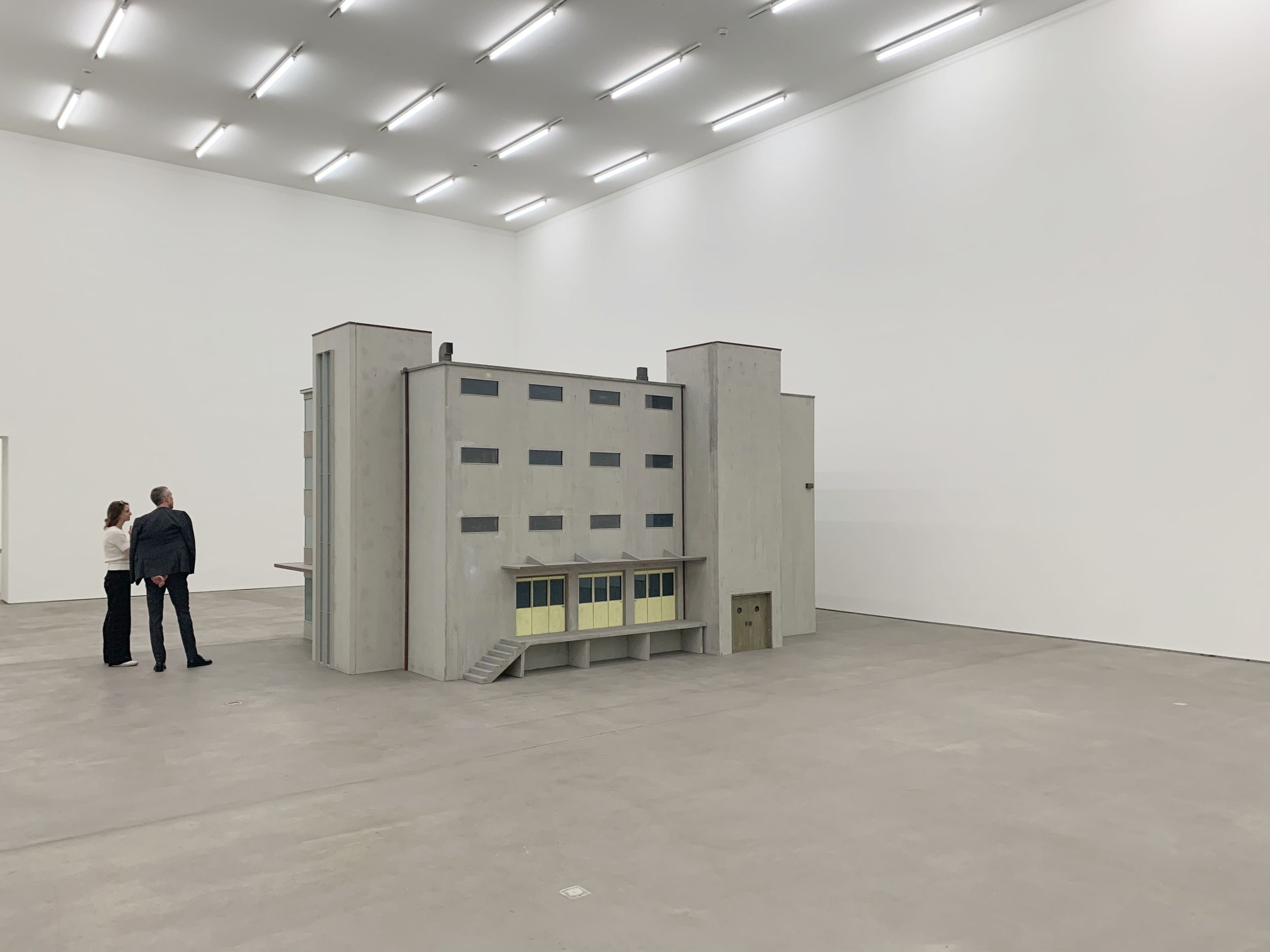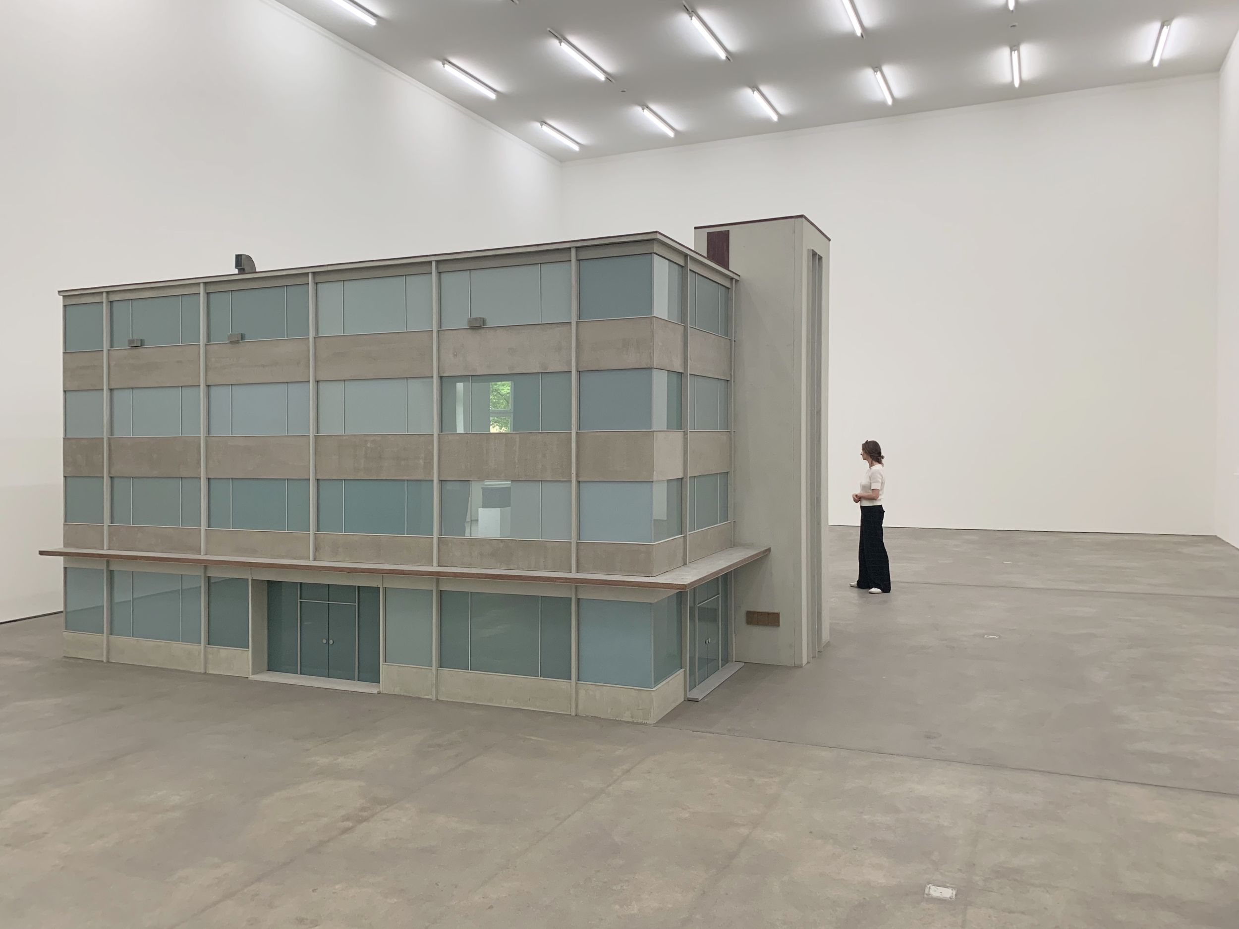 Haus was preceeded by a model-like sculpture with the same form that took aspects of the sketch and model as its subject matter. The artists continued to develop their interest in everyday architecture and brought the sculpture back to the public sphere for Münster. Nestled in an unpretentious area far from the usual tourist attractions, passersby heading to work identified it as an artwork through its 1:5 scale. The miniaturized building reflected its immediate surroundings and the functional architectures and activities typical to this public place including work, infrastructure and productivity. Its generic character derives from late modernist architectural form and the resulting aura of the everyday. The version of Haus in the Berlin exhibition is the wooden mold used for the aluminum casting of the outdoor sculpture in Zurich, consequently combining the model character of the sculpture with the idea of monumentality. The building represents the last moment of modernism, where utopian-positivist ideas drifted into the pragmatic and ultimately the commonplace. This strangely melancholic moment is compacted in this replica office complex’s unusual scale, which is simultaneously too large for a model and too small for a building.