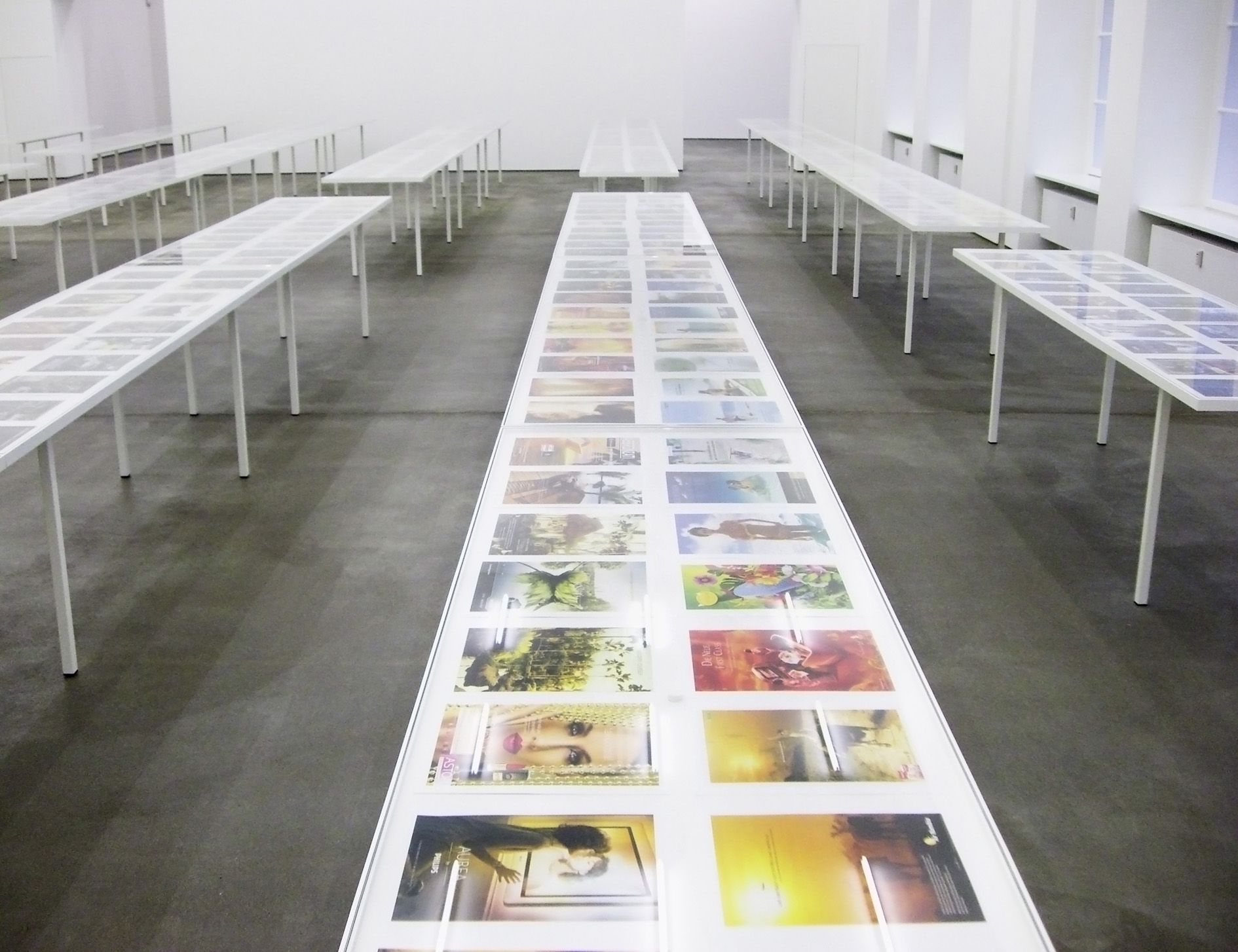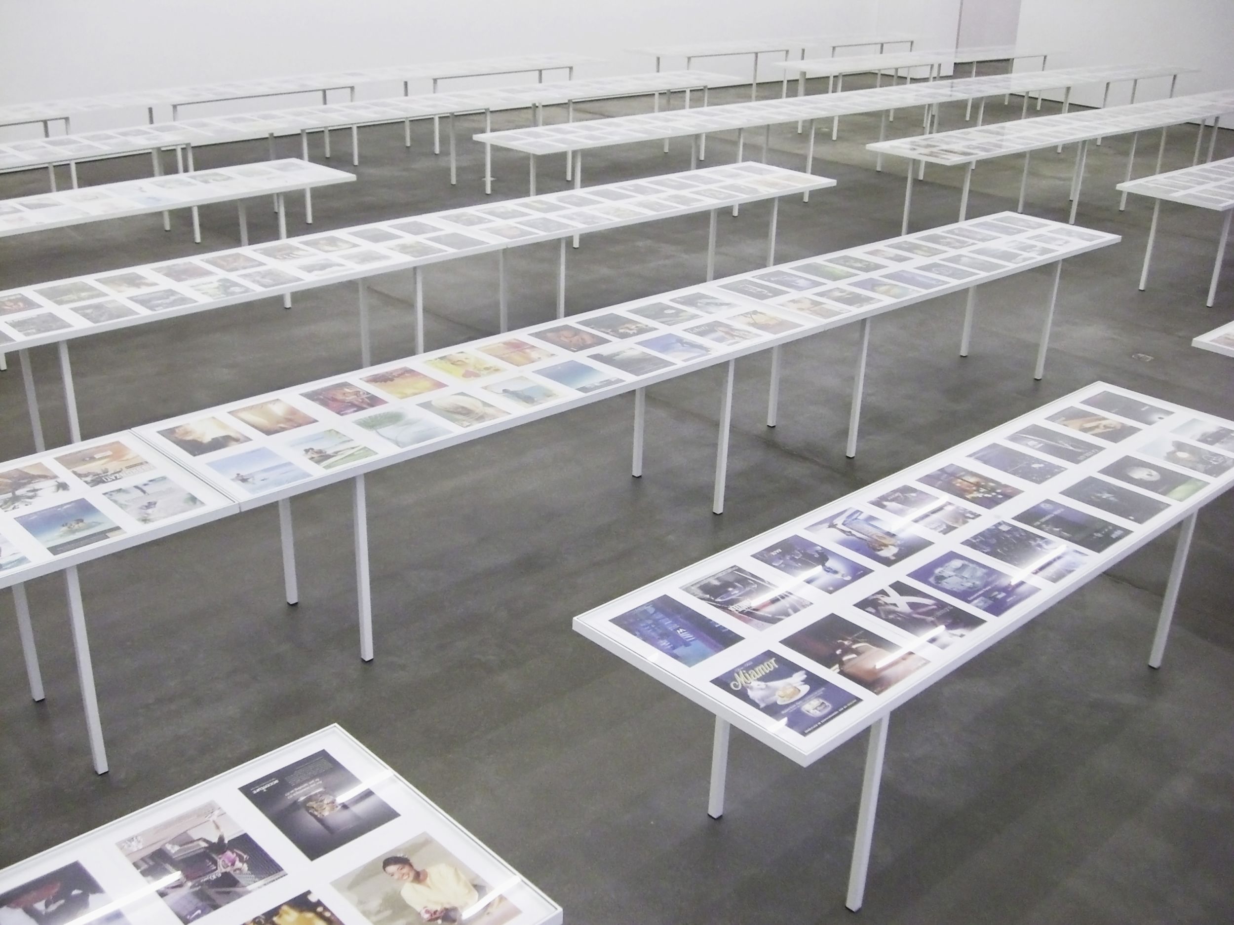The 2007 Ringier annual report consists of 40 pages of business data, and 800 pages of adverts. The adverts have been carefully selected and scanned by the artists from hundreds of newspapers and magazines that could be found at any newsstand in any part of the globalised marketplace. The adverts cover the whole spectrum of the lifestyle of the contemporary consumer, ranging from sport to travel and from fashion to family life. The adverts are carefully grouped and each image is positioned opposite a purposefully chosen companion image, so that each double-page spread forms a kind of diptych, revealing through association or juxtaposition an aspect of our mass culture of consumption.
