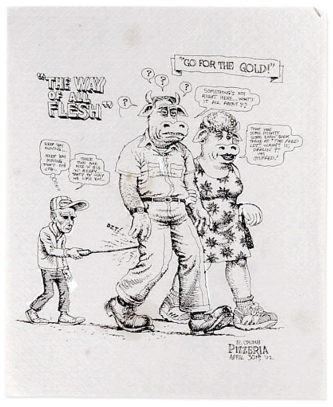 The artist’s depictions of women as superwomen with monstrous legs and massive backsides have been a particular flashpoint, drawing accusations of sexism. Crumb has described the images as indicative of his fear of women—as further suggested by portrayals of himself as a skinny, lecherous old man or down-and-out loser.
