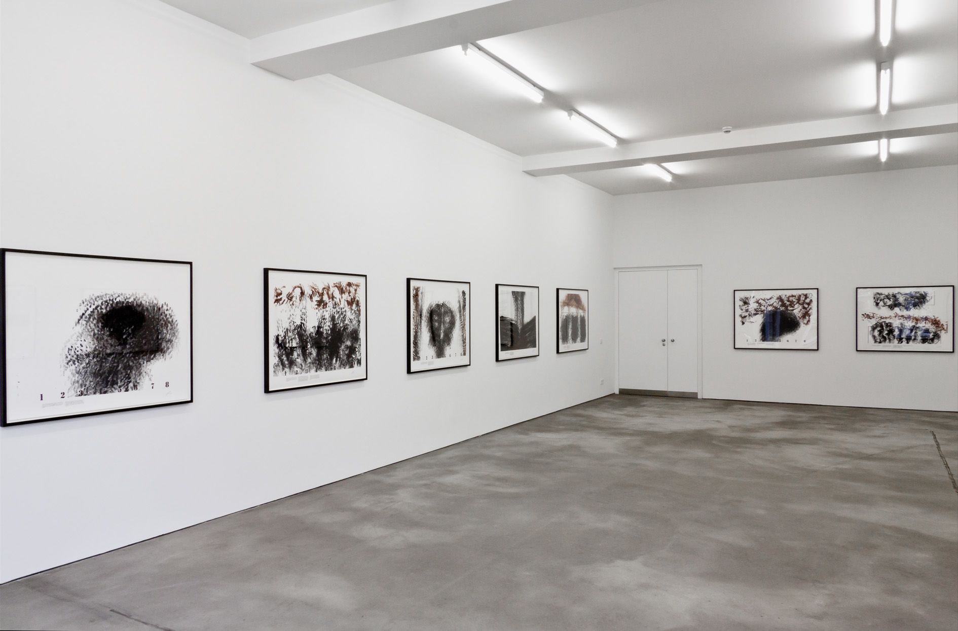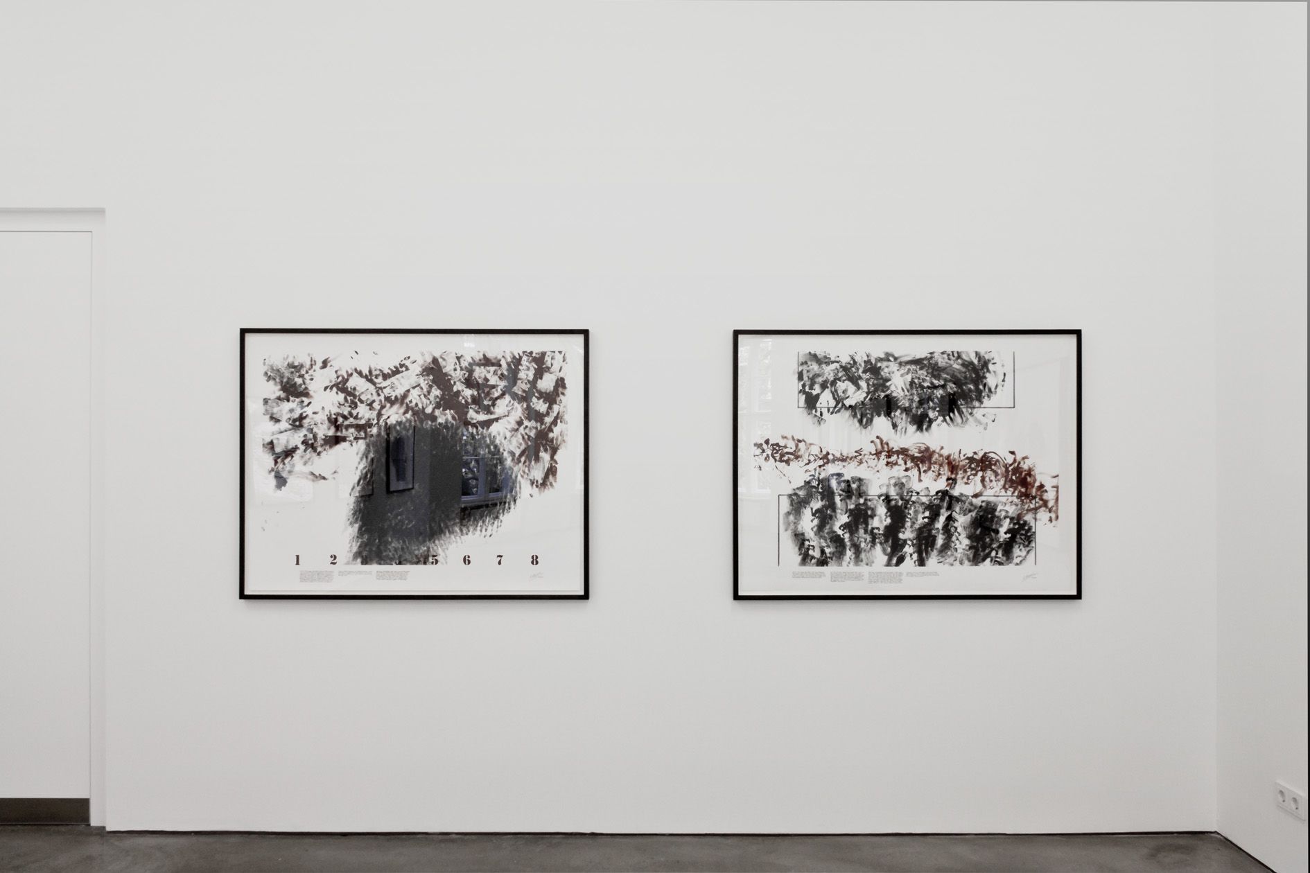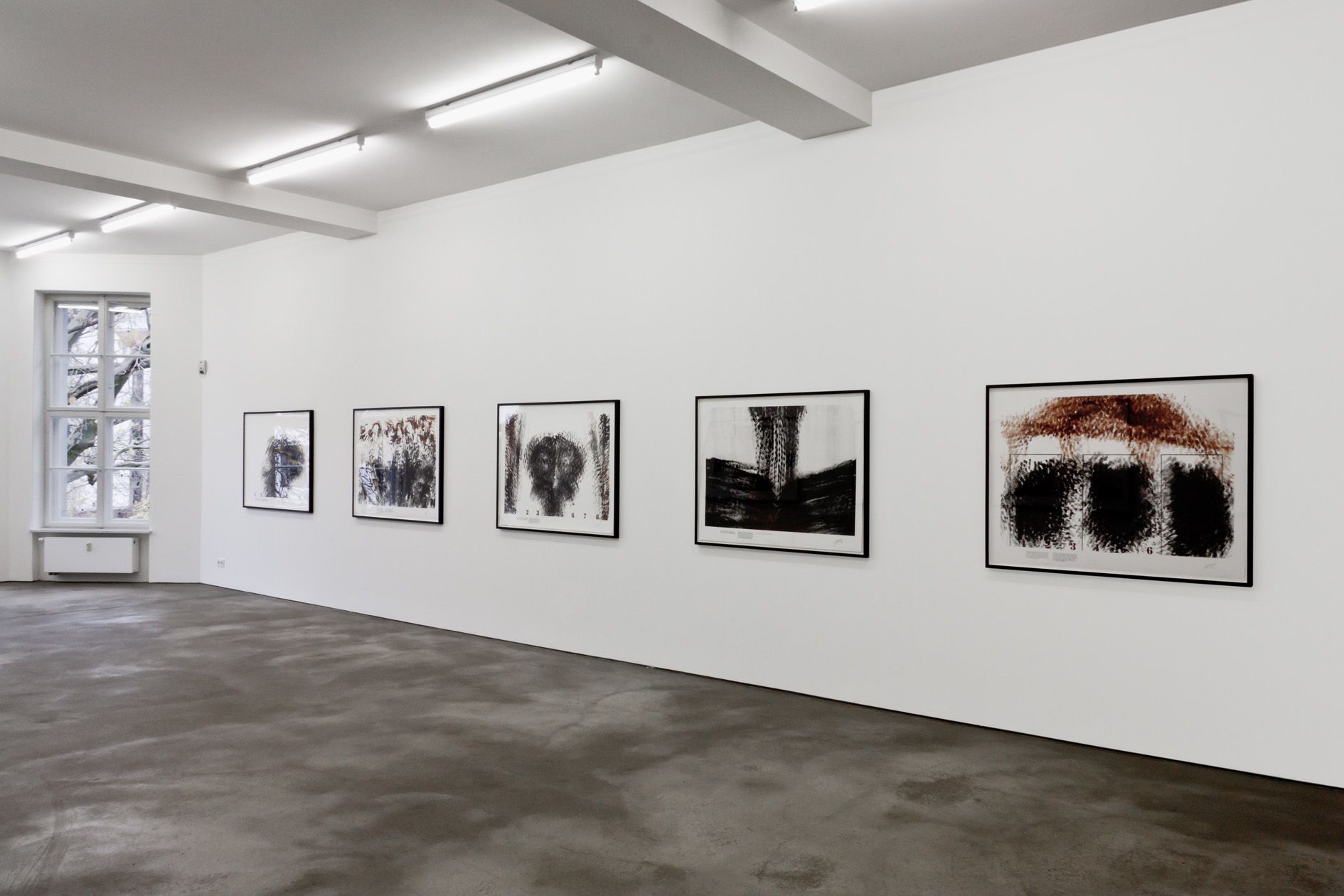 The appearance of the works evoke a variety of associations in the given context. By using the colours ‘burnt sienna’ as well as ‘mars black’ in all of the works and the gestural landscapes Morris creates, abstract theatres of war seem to be reflected.