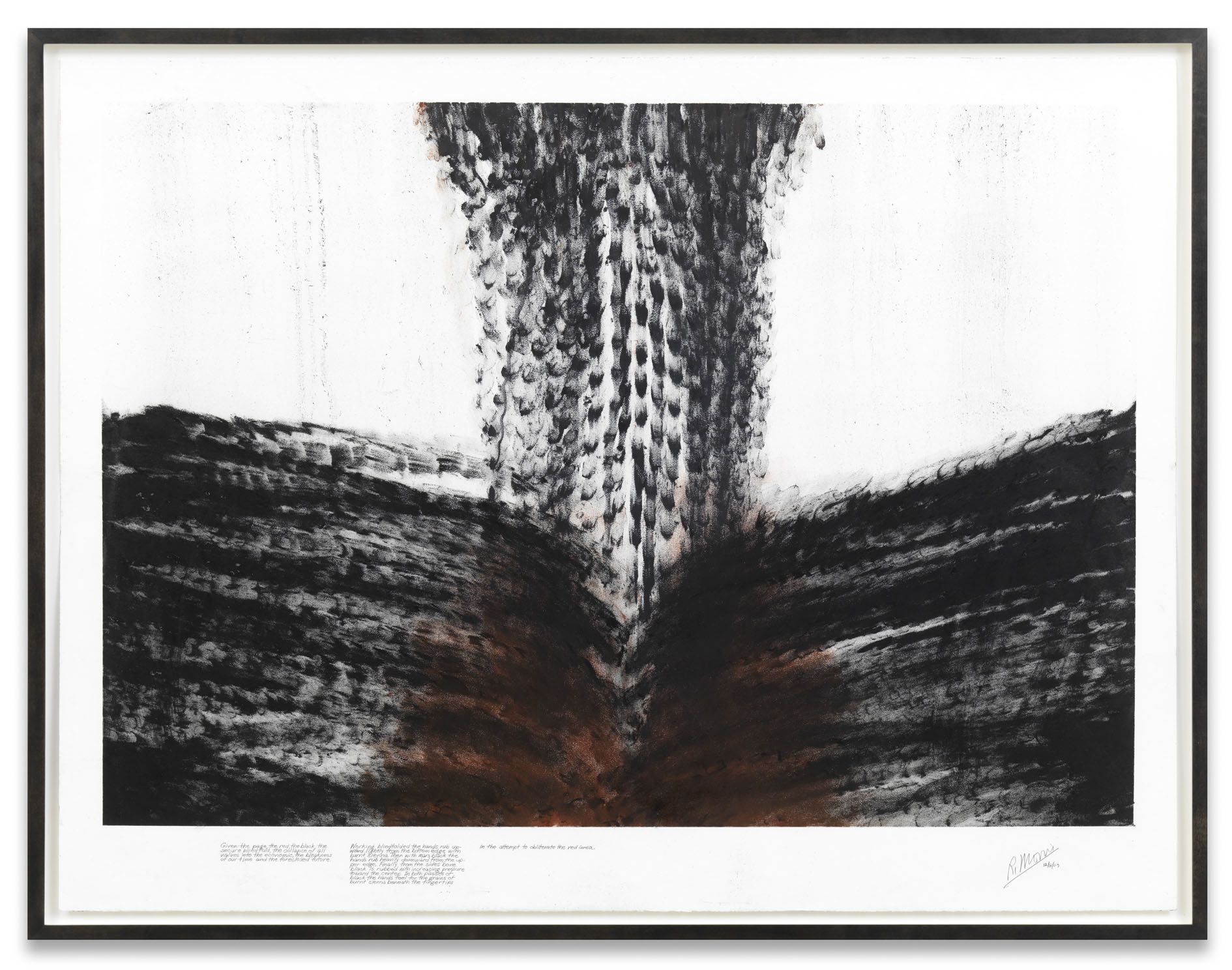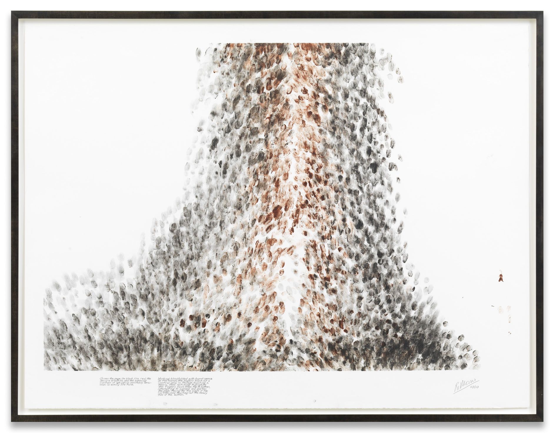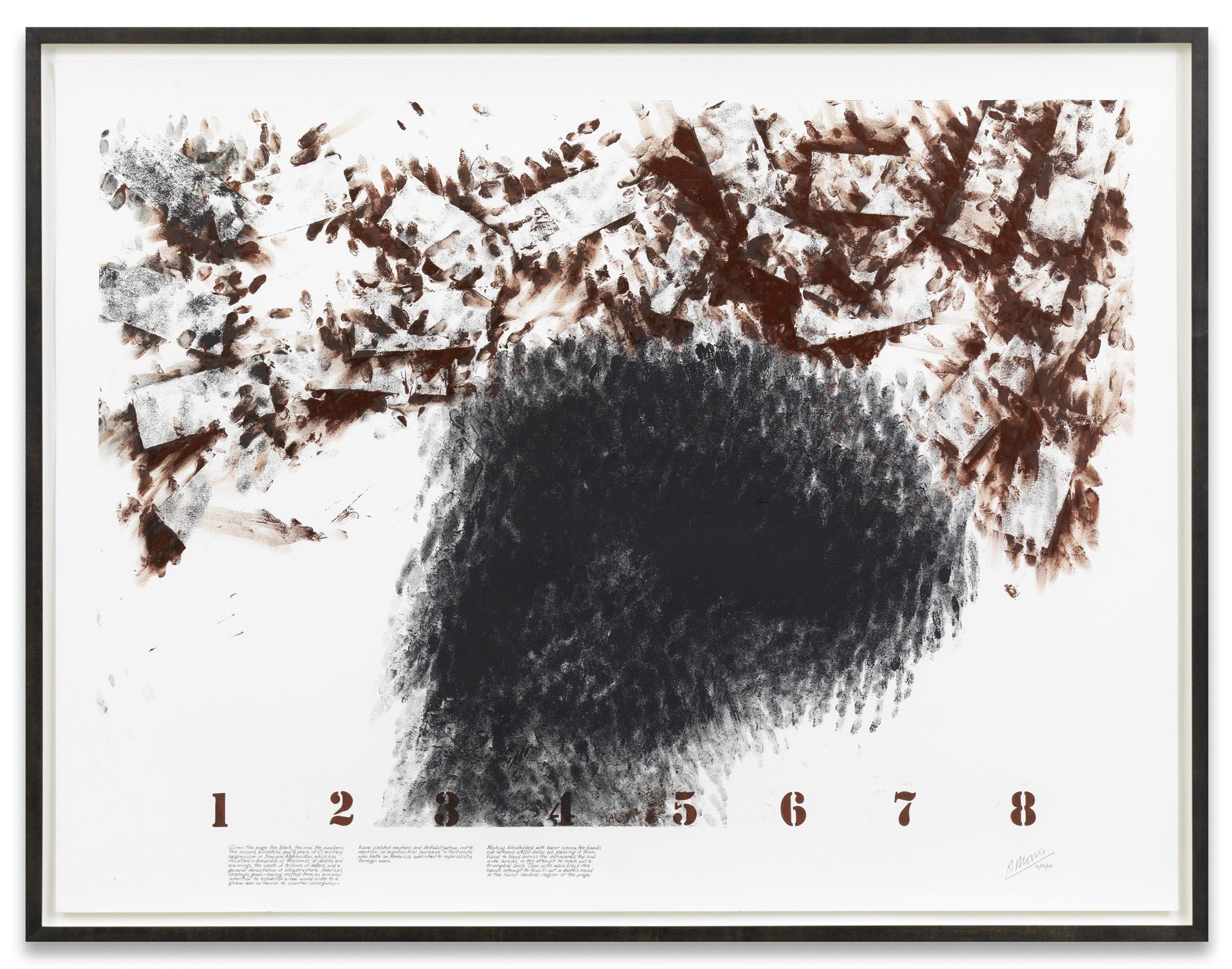 Working blindfolded with burnt sienna touches are made in the upper area while thinking of the uncounted civilian deaths resulting from the conflict. Then with mars black the hands attempt to count off some 3000 touches in the estimated marked off areas while thinking of the US military deaths. Before reaching this number I lose count and the mars black is depleted.’
