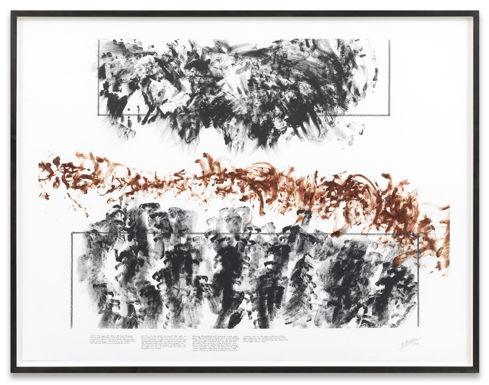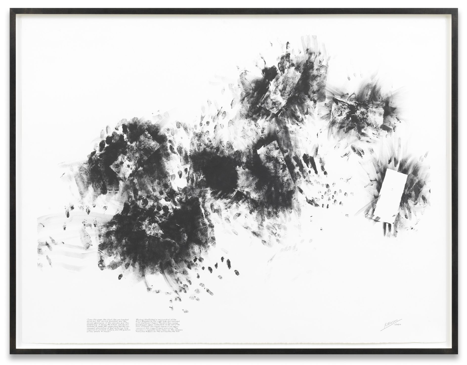 In the first instance the titles describe the way in which the drawings were made: with closed eyes. Through the use of a mixture of graphite or powdered pigments and oil, Morris left traces of his fingers and hands on the paper. Bringing these works close to the genre of the ‘task performance’, each drawing was based on an assignment of tasks which were previously defined and written out at the bottom of the sheet afterwards.