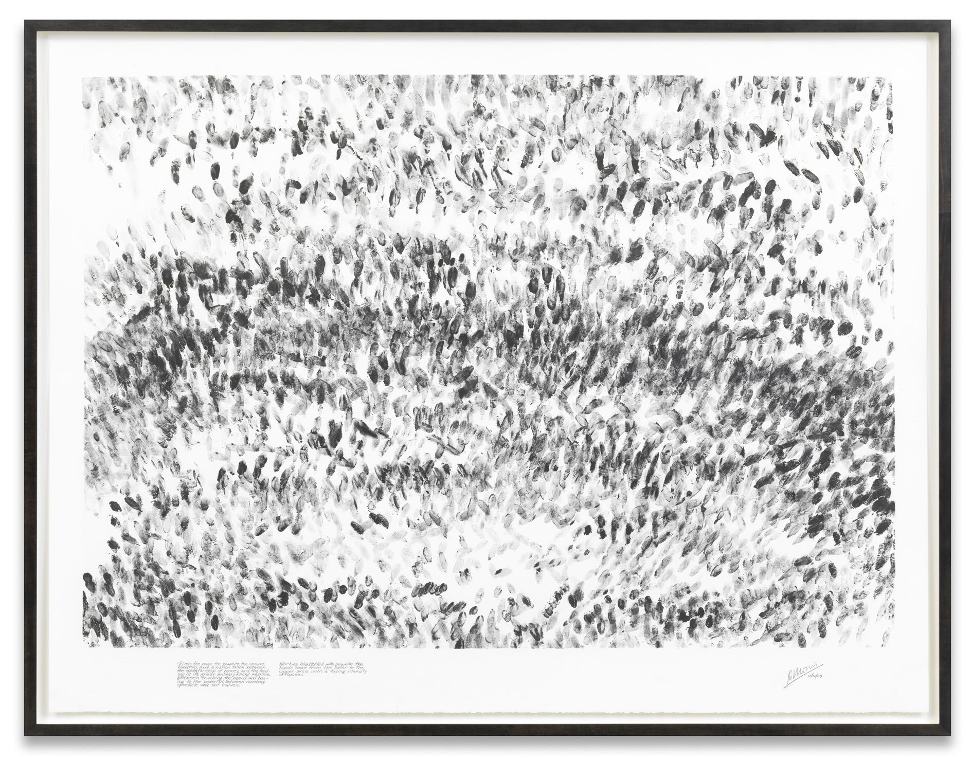 ‘With eyes closed, graphite on the hands and estimating a lapsed time of 3 minutes, both hands attempt to descend the page with identical touching motions in an effort to keep to an even vertical column of touches. Time estimation error: +8 seconds.’