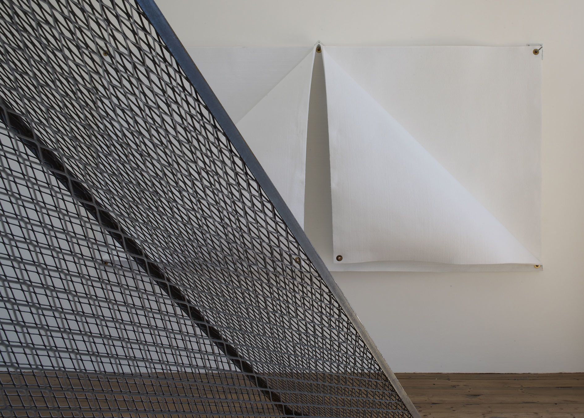 Drawing attention to the relationship between material and gravity as well as that between spatial arrangement and random indeterminacies will be Untitled (1976), a wall piece belonging to a second wave of works in felt which the artist began to develop in 1974. Morris had been experimented with felt since the mid 1960’s, primarily drawn to the material by it’s unlikely adequacy for sculpture. Morris mounts the felt pieces to the wall in pocket or diamond-shaped folds, leaving the metal grommets exposed as an important aspect of the work that reveals the process of its assembly. The colour of the work contrasts starkly with the connotations of the material, the purity of the white proving impractical for industrial use. The artist takes gravity into consideration, allowing the physical movement of the material to determine how it hangs from the wall and into which forms it settles. By endeavouring to compel the flexible texture of felt into rigid, geometrical forms, Morris reflects ironically upon the formal severity of the visual icons of abstract art or Cubism.