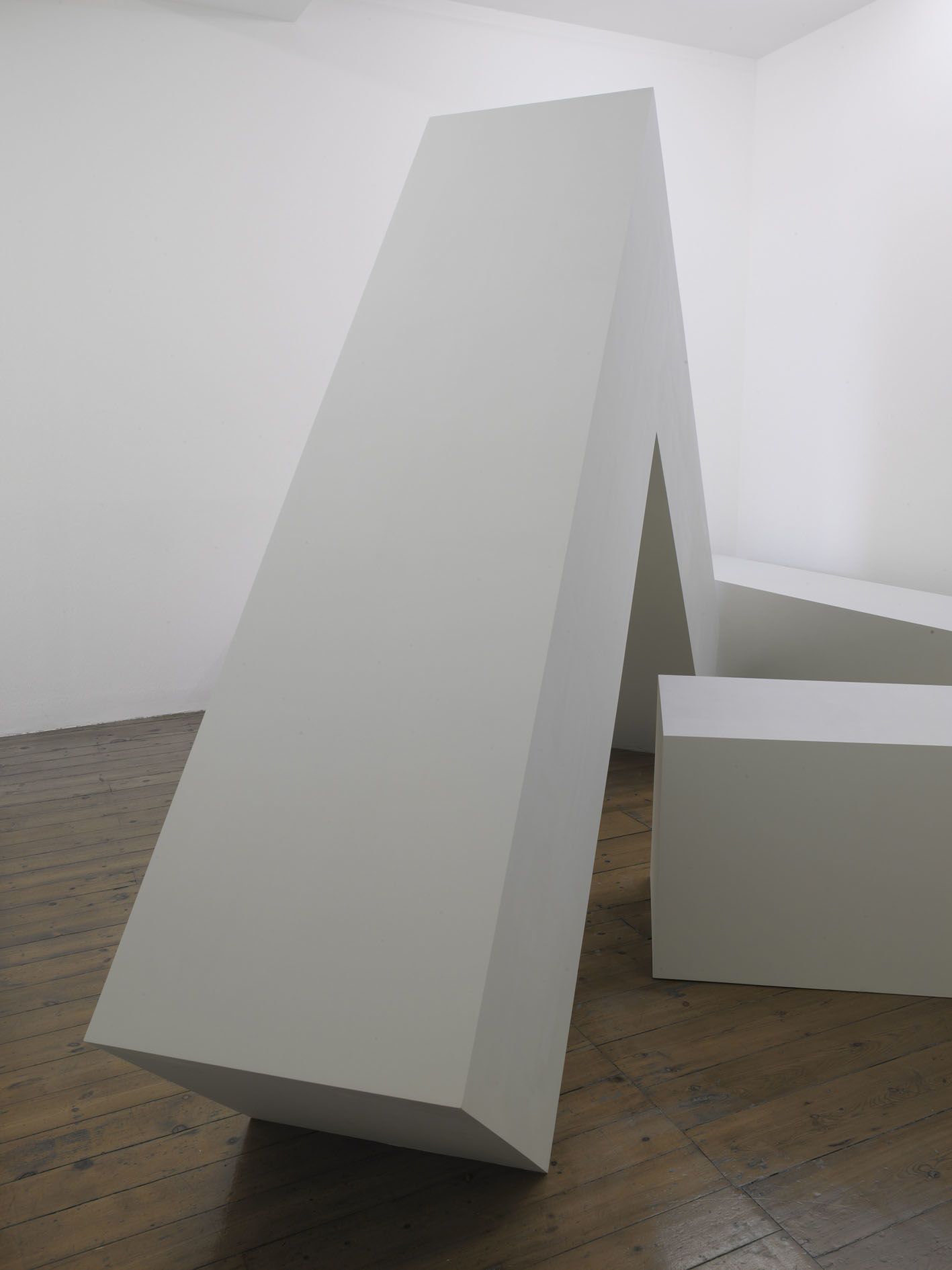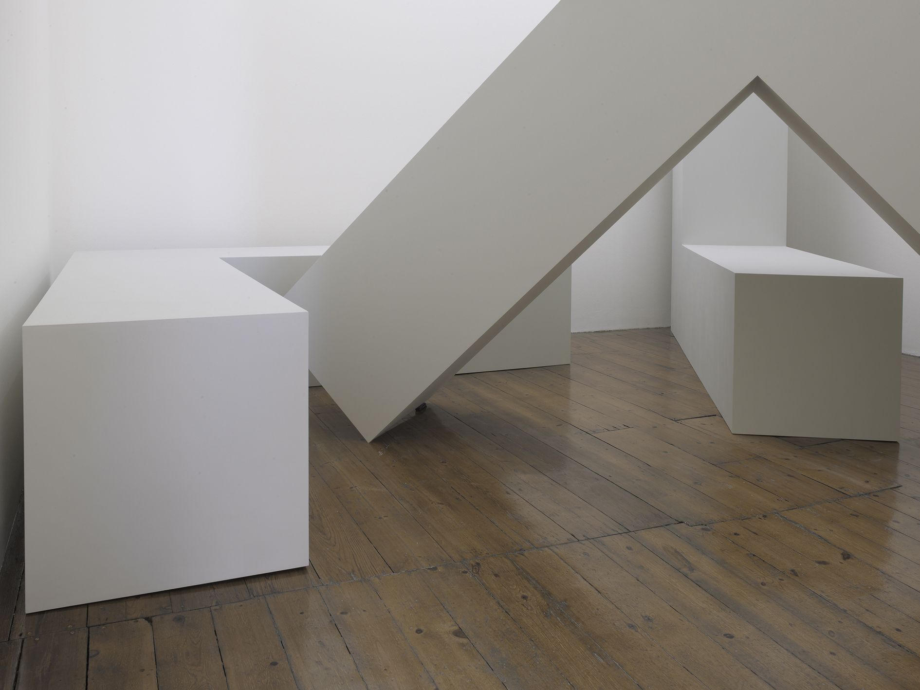 At the centre of the exhibition will be Morris’s seminal Untitled (Three L’s) (1965), consisting of three large L shaped polyhedrons in plywood, arranged anthropomorphically in positions relative to the floor; one upended, one lying on its side, one inverted. While the logic of the forms’ uniformity is clear, the variability of their positioning prevents seeing them as the same. Morris therefore demands the viewer to set aside their preconceptions, memory and knowledge, and approach the sculpture from a level of basic perception in order to grasp the reality of the experience.
