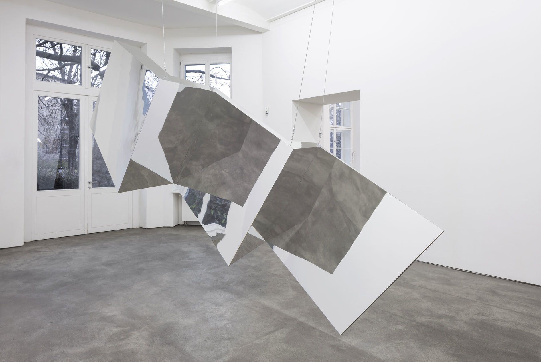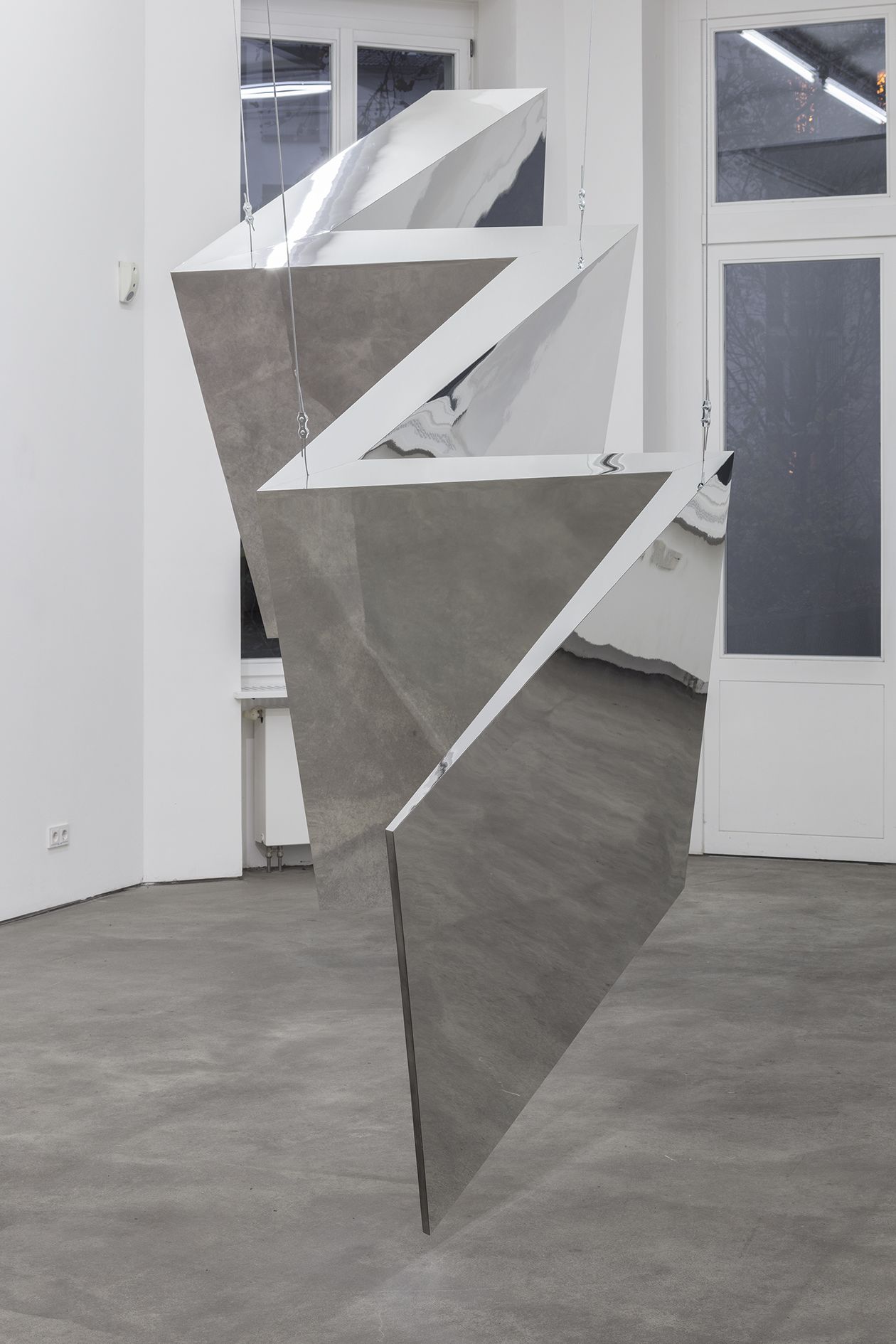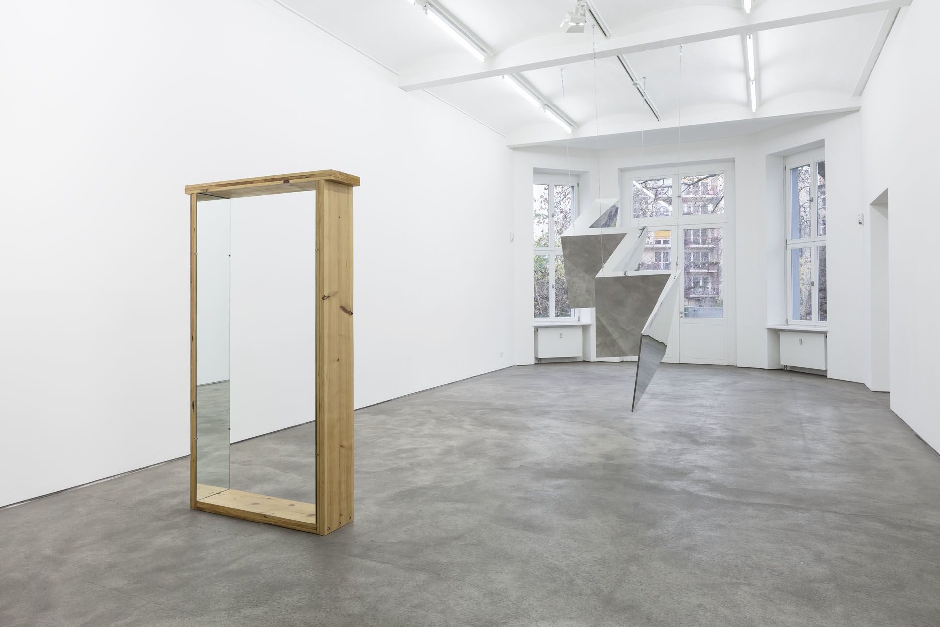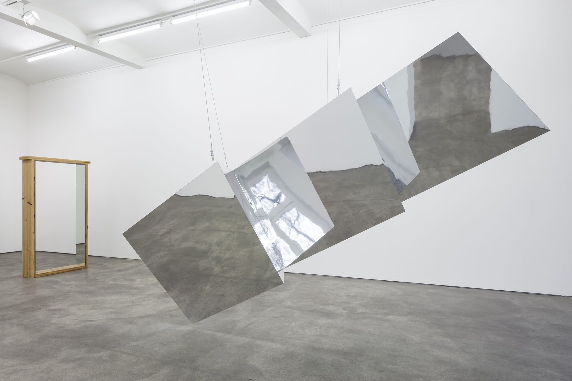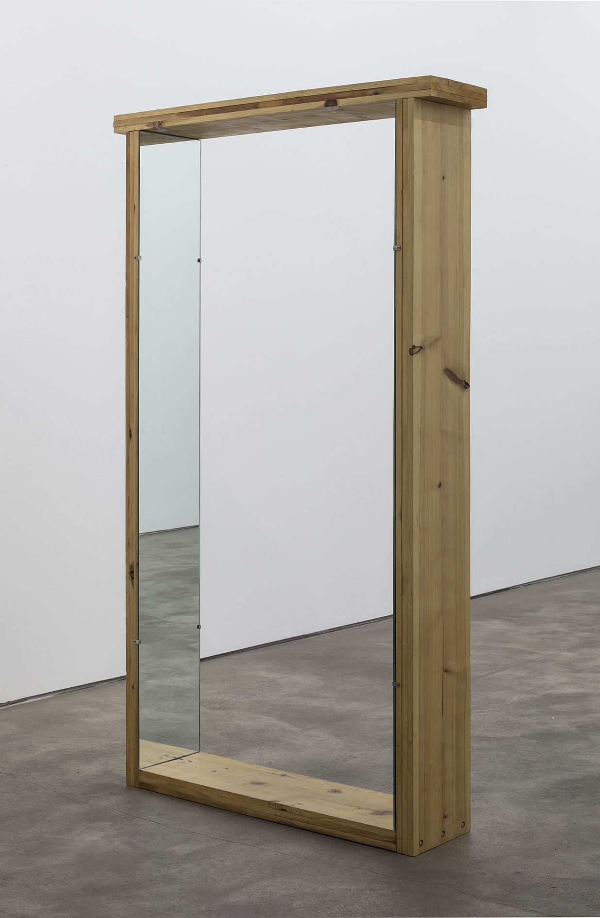 In contrast to the dizzying flux at work in the main room, the sculptures in the succeeding room engage the viewing body in a series of contemplative transitions as it moves through the space. The first encounter is with Strike (2012), a monumental concertinaed structure of polished aluminum and arctic birch elements that is suspended from the ceiling. Exhibited here for the very first time, the sculpture engages the ongoing concerns within Morris’ practice. For instance, the reflective, modular surfaces negate any promise of a cohesive vision of the space, instead reflecting and refracting it as an assortment of disjointed body parts and architectural details. It is followed by Untitled (Pine portal with Mirrors) (1961), which is an early example of Morris’ use of sculpture to engage the moving body, and was produced in the same year as several other ‘Portal’ works. Here, the illusion of a passageway invites the viewer to pass directly through the work, simultaneously appearing like a stage prop for a dance or performance. Meanwhile, the individual reflections in its mirrored surfaces solicit from the viewer a more familiar, static form of self-observation.