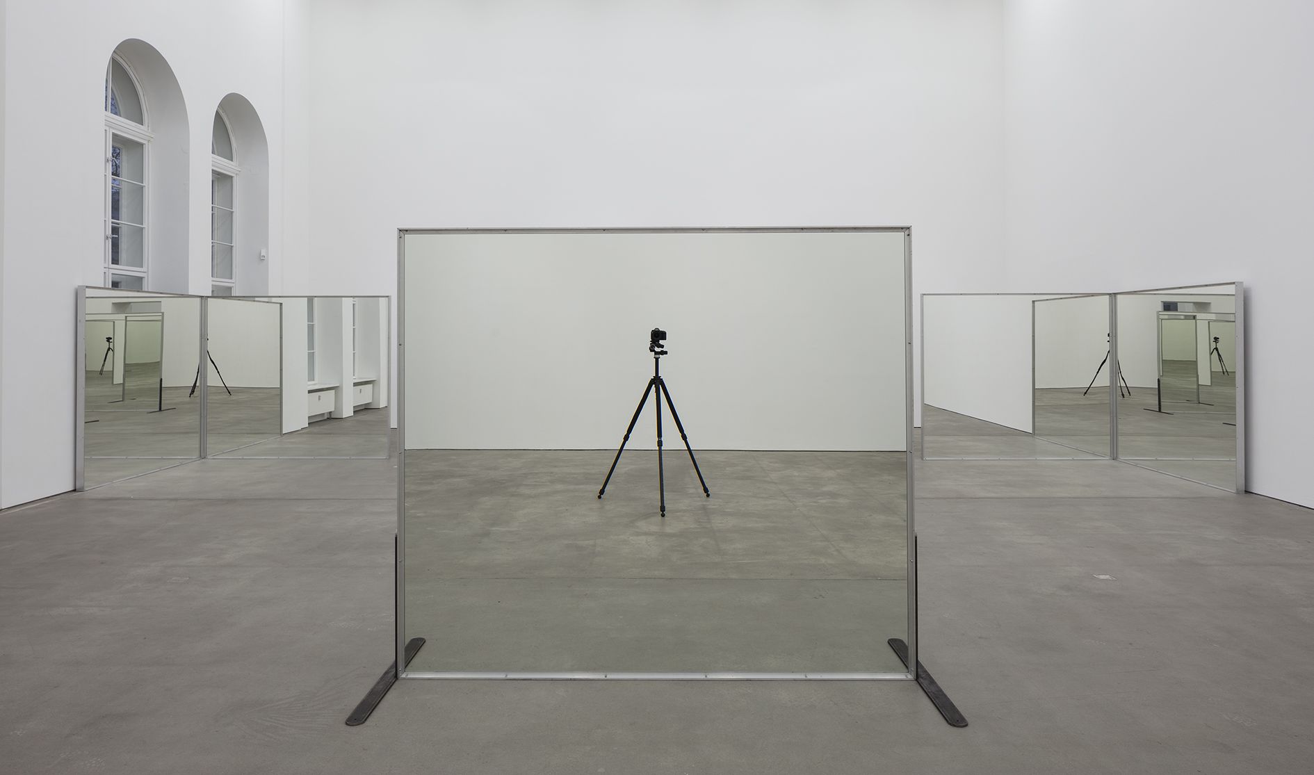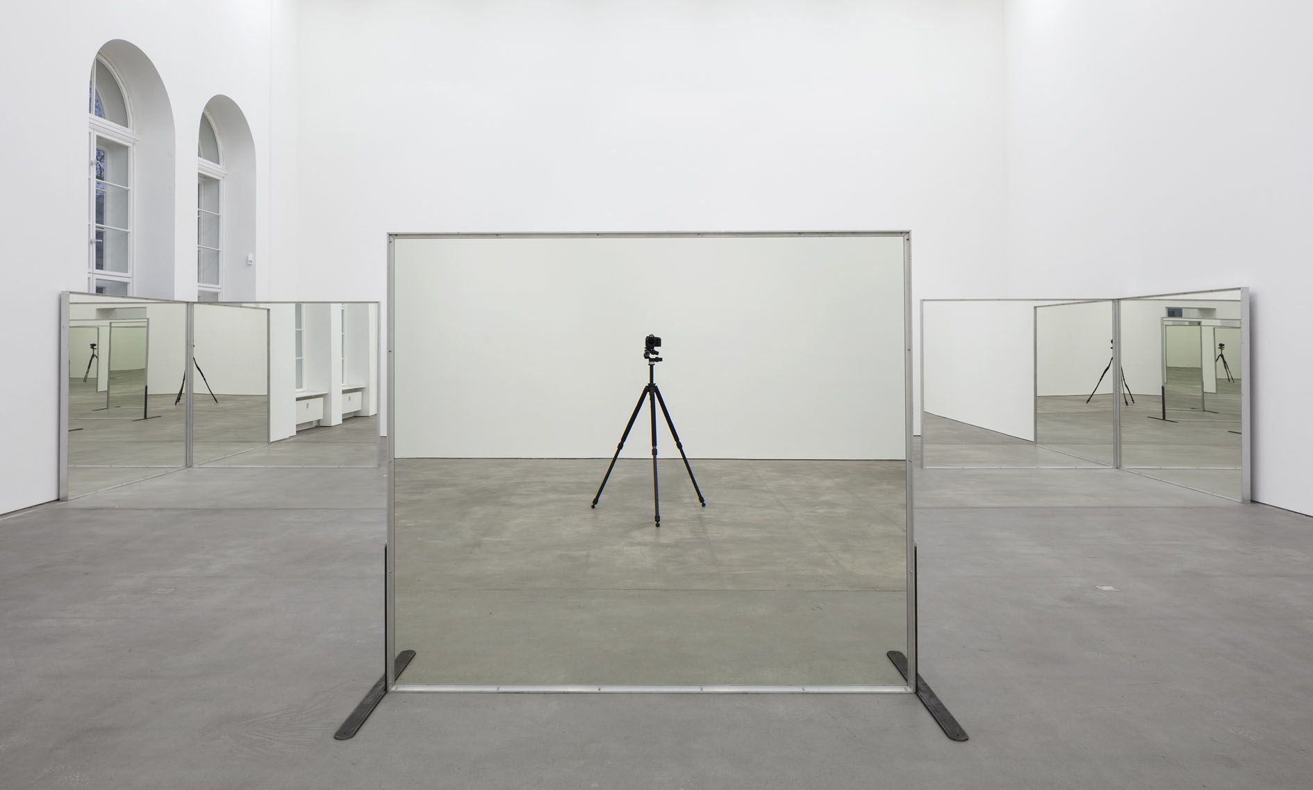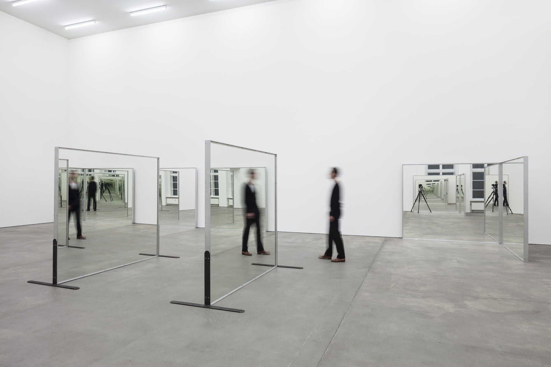 In the main room of Refractions, the viewer is confronted by an installation of twelve rectangular mirrors, each measuring nearly two and a half meters across. Untitled (Williams Mirrors) (1976-77) positions a double-sided pair of mirrors in the middle of the room and four pairs of one-sided mirrors at the corners – meaning that the reflection in each mirror appears to multiply infinitely. As the viewer moves through the space, weaving in and around the constellation, it becomes almost impossible to distinguish real bodies from their reflections, or to perceive their exact locations within the space, as the duplicated images appear to be dislocated from their surroundings. Morris succeeds in animating the entire room, creating a complex and constantly shifting territory of recognition and misrecognition that destabilizes viewers’ assumptions about their immediate physical reality and radically undermines the typically static act of self-observation before a mirror. The work was first shown in 1977 in the courtyard of the Clark Art Institute in Williamstown, Massachusetts, during Morris’s tenure there as Artist-in-Residence. Guided by Morris, a group of ten students from the Institute were involved in the erection of the sculpture. This process was documented in a videotape that became an integral part of the work at the time, with Morris attempting to expand the viewer’s artistic appreciation of the work by presenting the production process alongside the finished object.