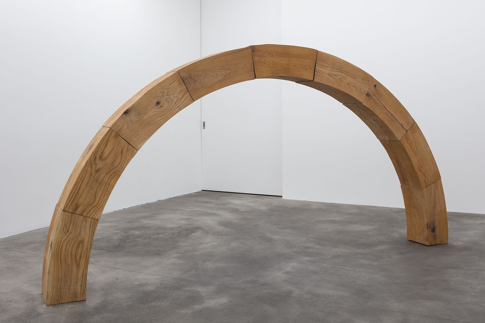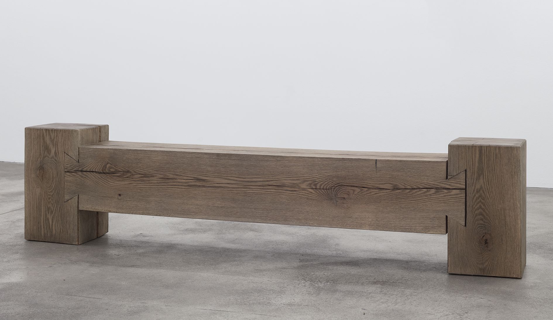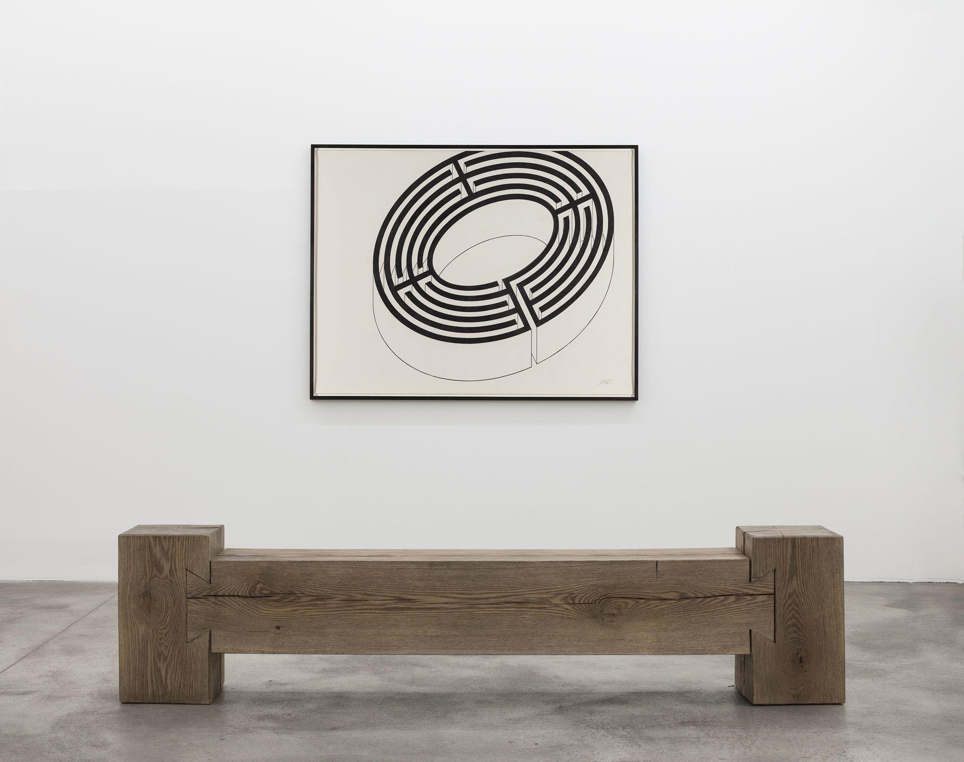 The wooden sculptures, Maple Arch (2012) and Roman Arch (2014) encourage movement in a different but related way, retuning the viewer to a sensory and unmediated experience of their surroundings as they pass through the human-scale channels of negative space created by the sculptures. Finally, the body-in-motion is stilled at the invitation to rest on an oak bench. In Bench (2013), Morris reinforces the concerns addressed by the preceding sequence of works in the exhibition and foregrounds the continued legacy of minimalism. Once again, he removes sculpture from its pedestal or plinth so that it can physically intrude on the space of the viewer, involving him or her directly, and actively, in its perception.