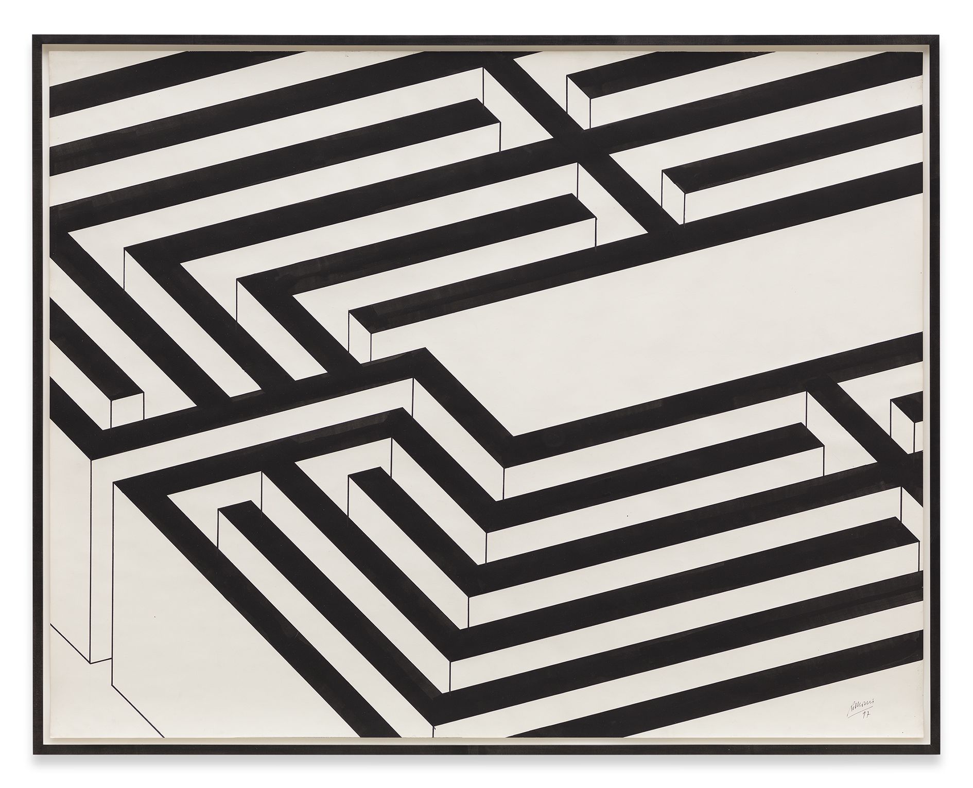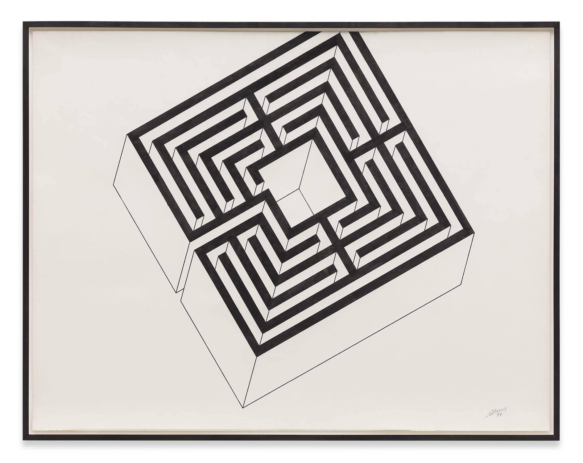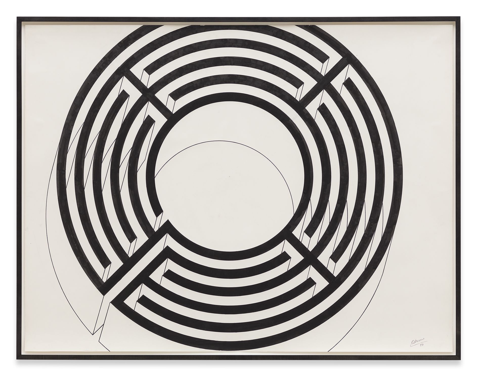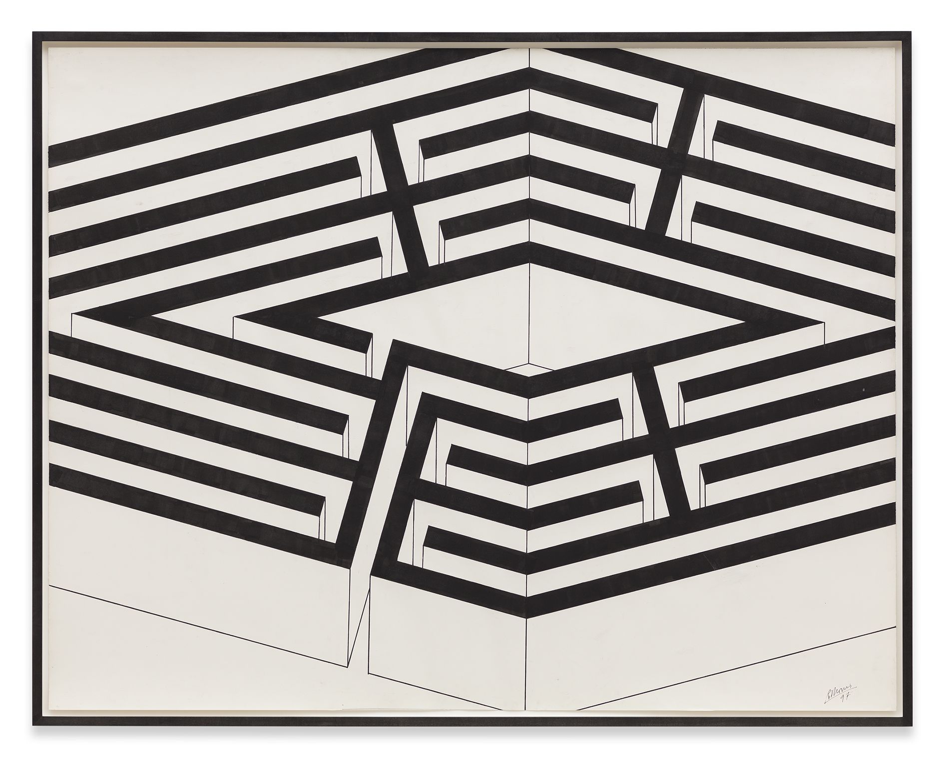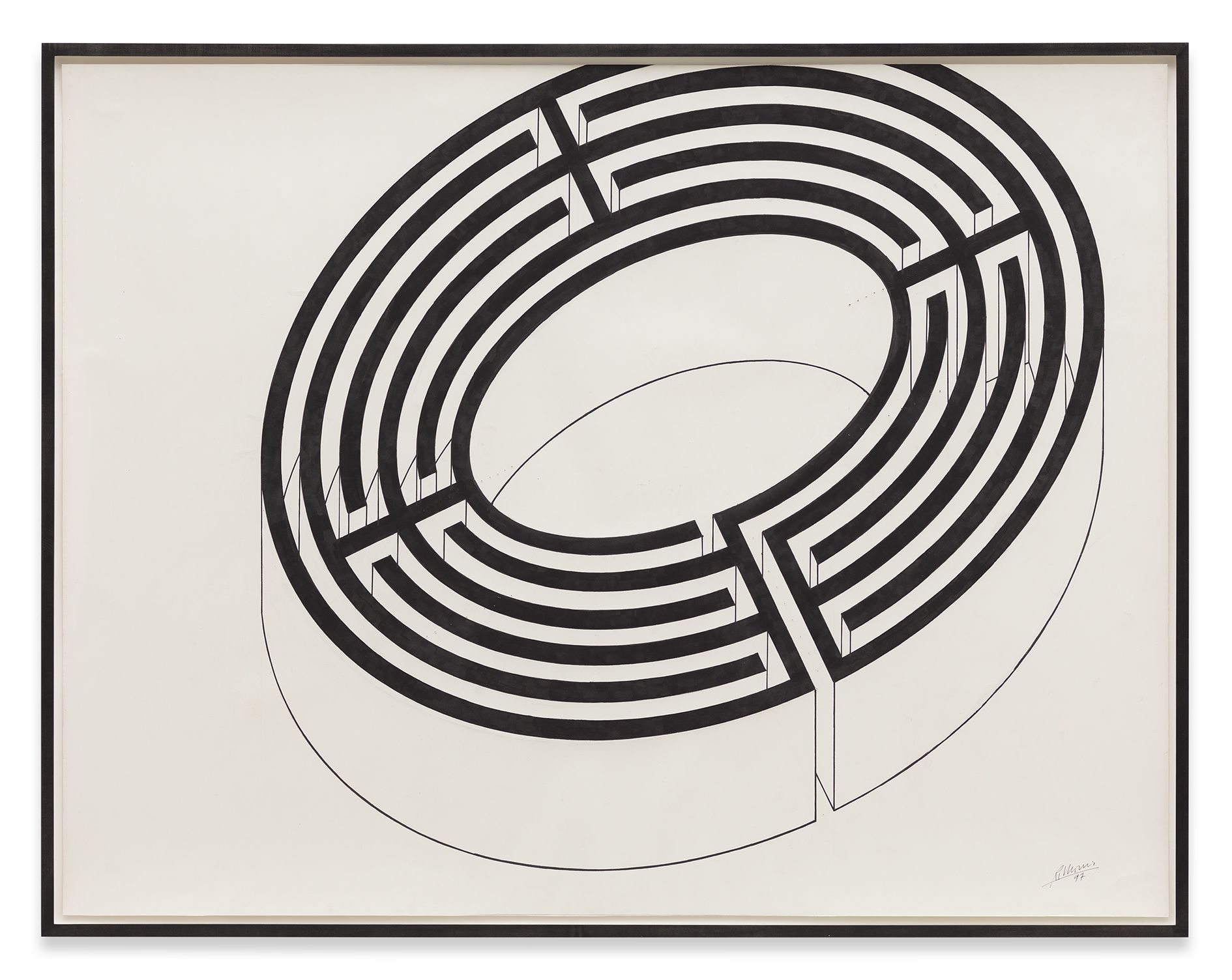 Morris’ early works explored notions of space and movement, often incorporating mirrored surfaces or creating human-scaled passageways or portals that the viewer could traverse. For instance, Untitled (1965), was an asymmetric arrangement of four mirrored cubes measuring exactly three feet square, which reflected both the surrounding exhibition space and the mobile body of the viewer within it. These particular concerns derived, in part, from Morris’ involvement in the 1960s with the Judson Dance Theatre in New York. Alongside artists such as Carolee Schneemann, Lucinda Child and Yvonne Rainer, he had choreographed a number of dance performances that stimulated an interest in movement, and the activity of bodies in space quickly emerged as a fundamental constant in his sculpture.