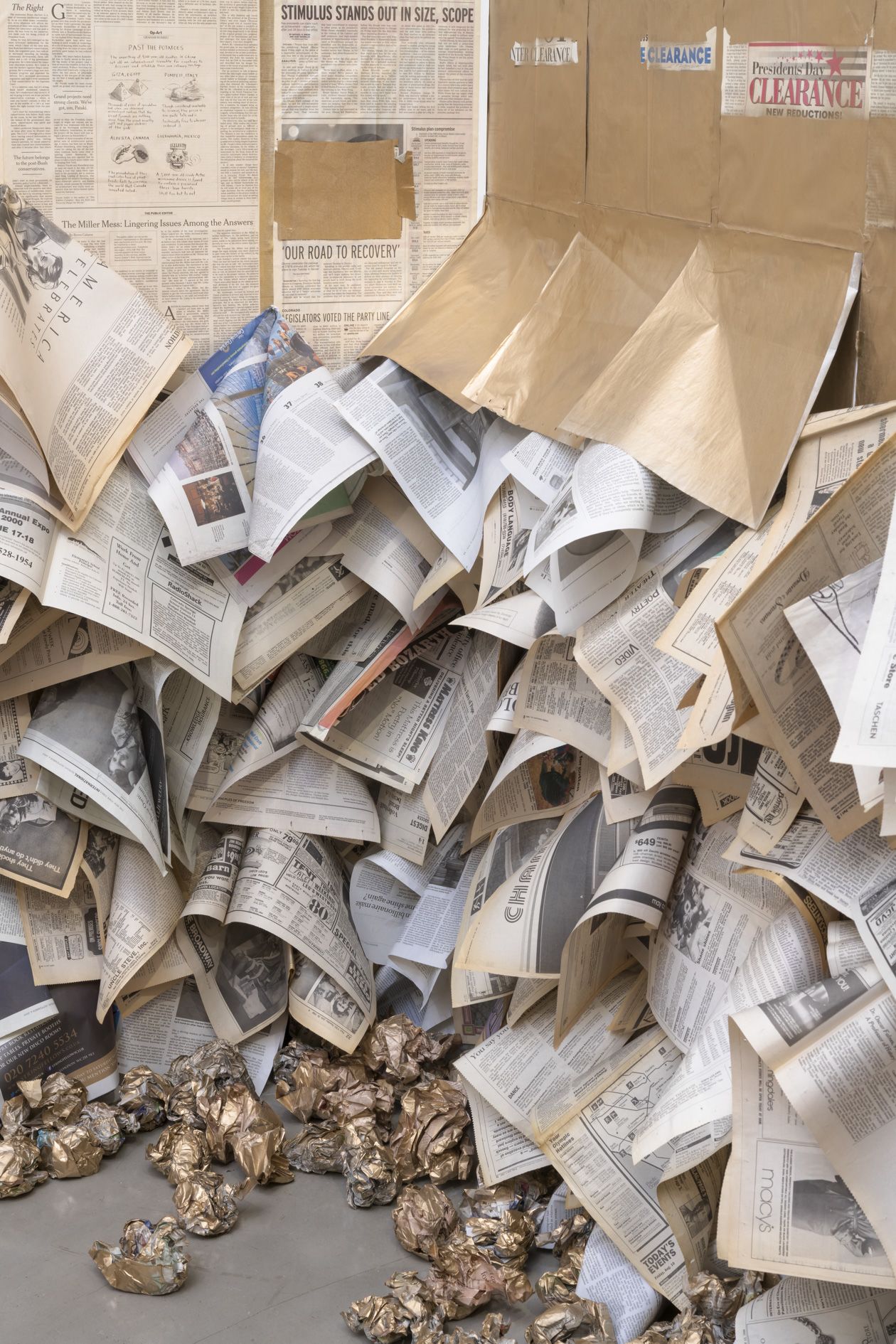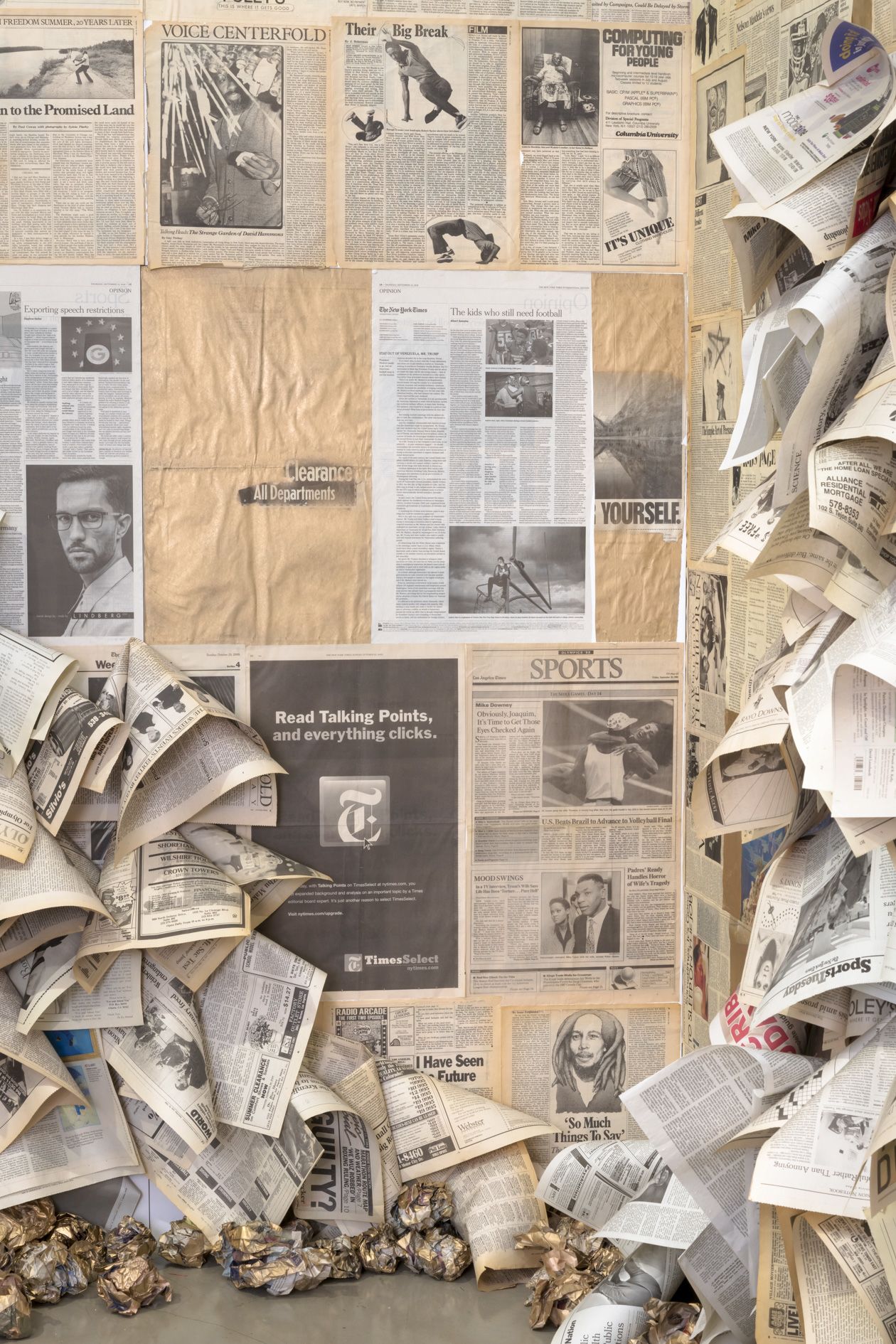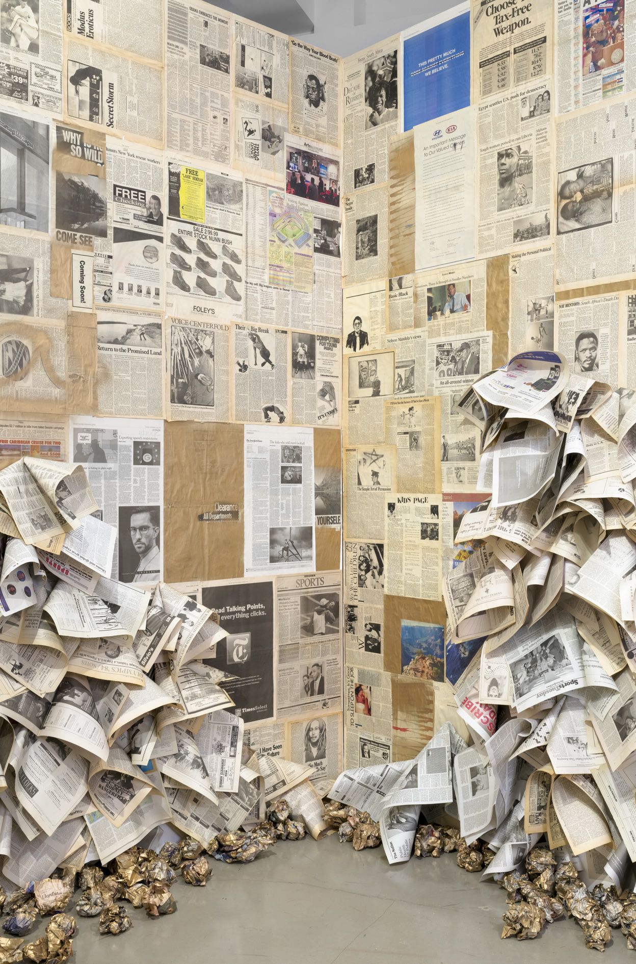 Bulemia was first presented in 1988 at the Maryland Institute College of Art in Baltimore as part of Art as a Verb: The Evolving Continuum, an influential exhibition of thirteen African American artists working outside the confines of traditional painting and sculpture. Accidentally discarded when that exhibition closed, the imposing work went unseen until it was recreated in 2018. Then, as now, the source of the papers is both Nengudi’s and her mother's collection of newspaper spreads that over the years they found to be worth saving.