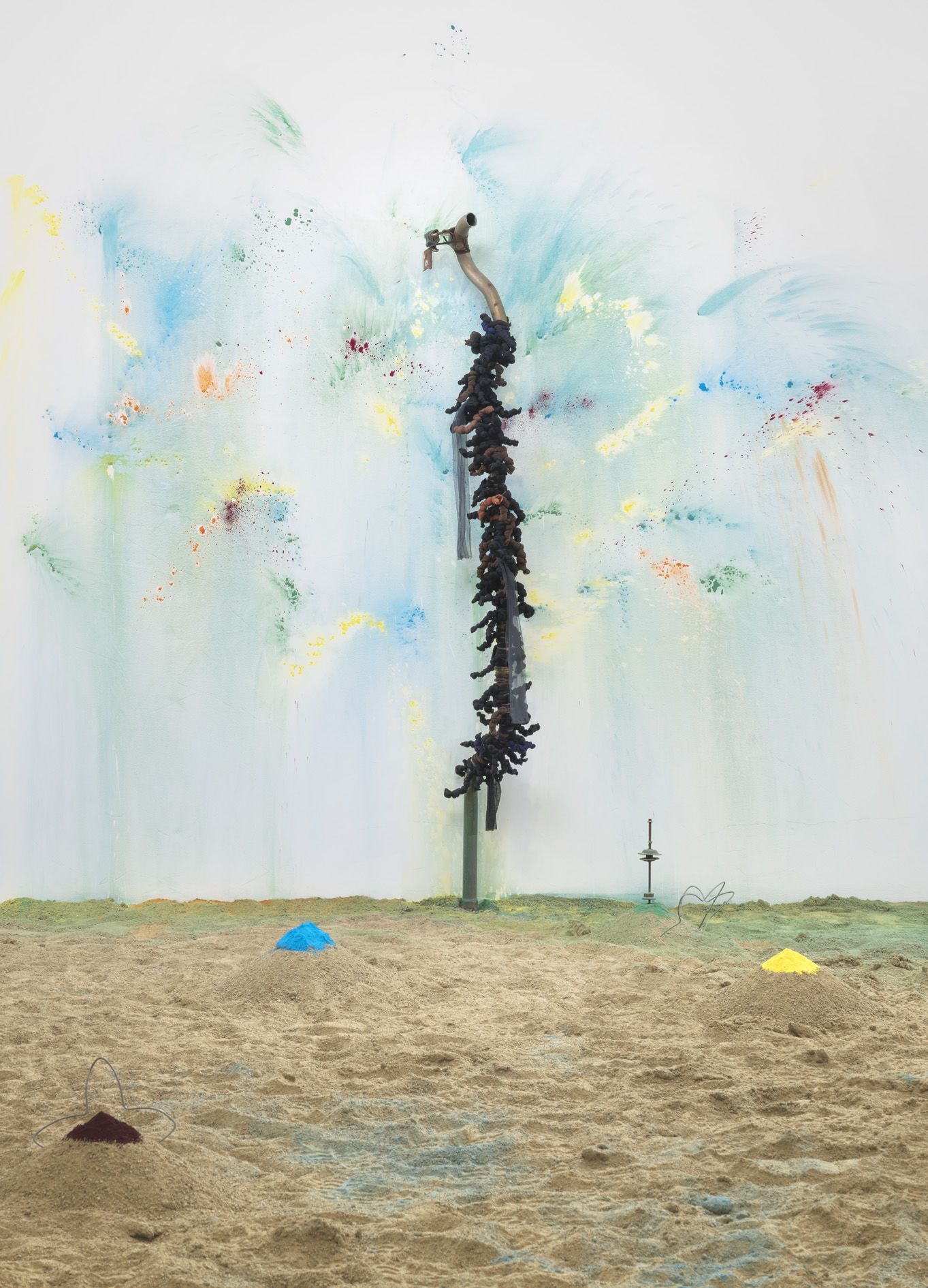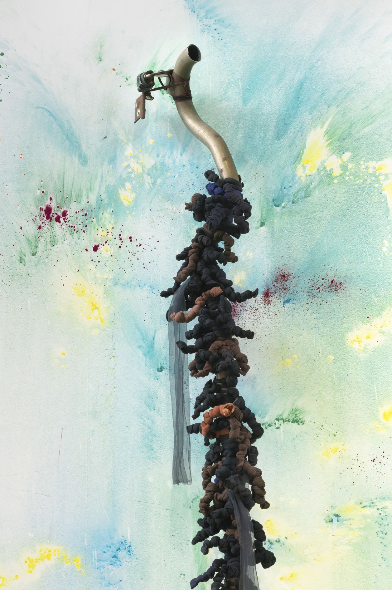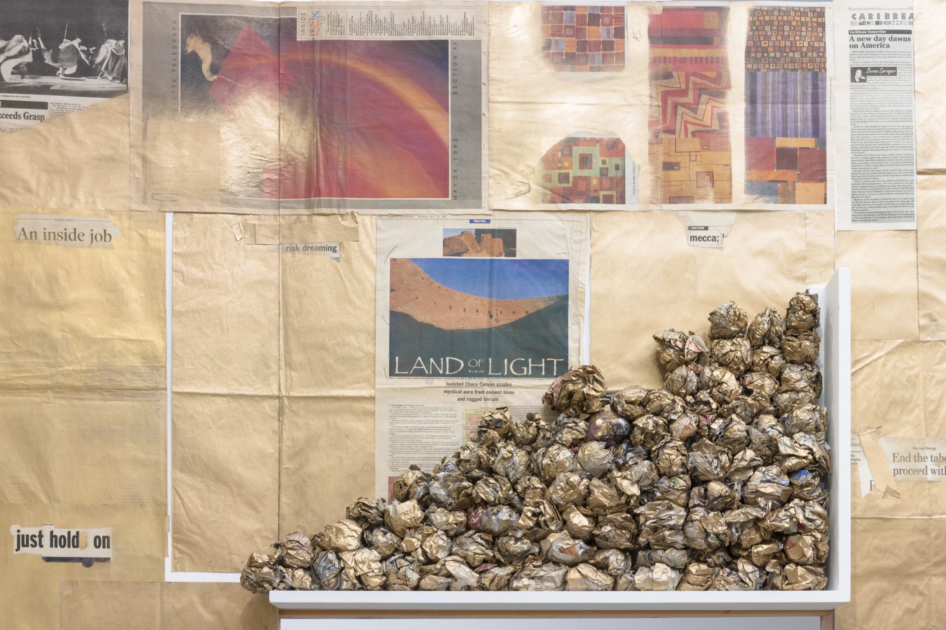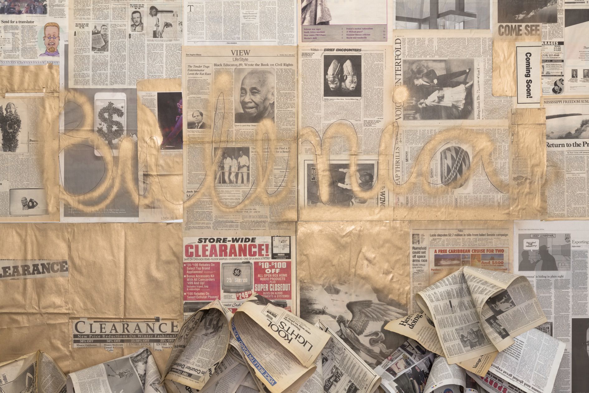 Bulemia was first presented in 1988 at the Maryland Institute College of Art in Baltimore as part of Art as a Verb: The Evolving Continuum, an influential exhibition of thirteen African American artists working outside the confines of traditional painting and sculpture. Accidentally discarded when that exhibition closed, the imposing work went unseen until it was recreated in 2018. Then, as now, the source of the papers is both Nengudi’s and her mother's collection of newspaper spreads that over the years they found to be worth saving.