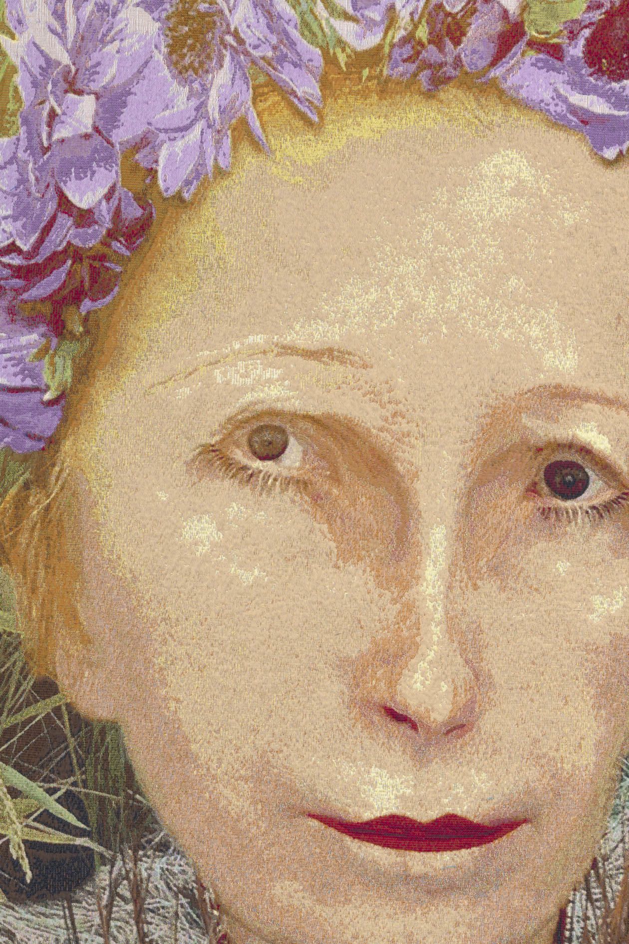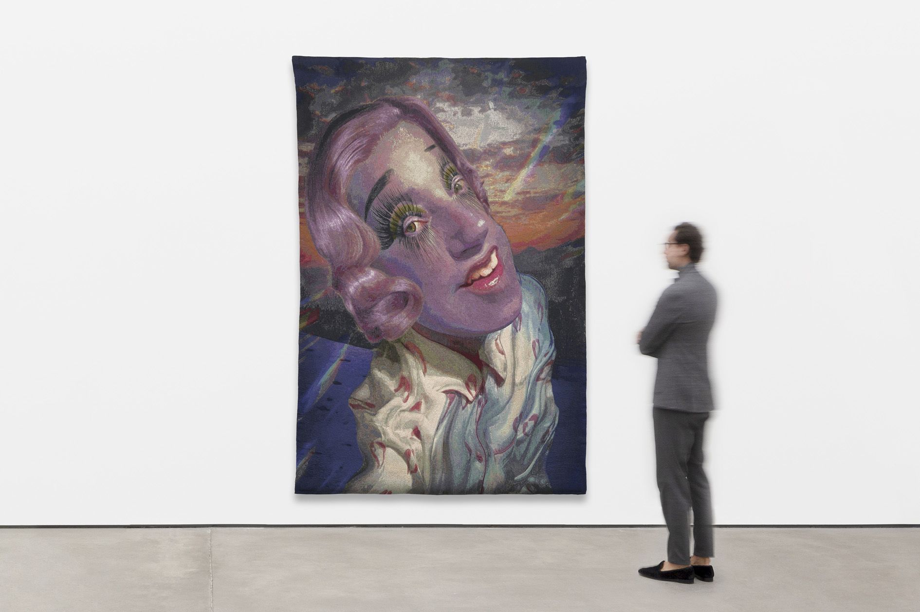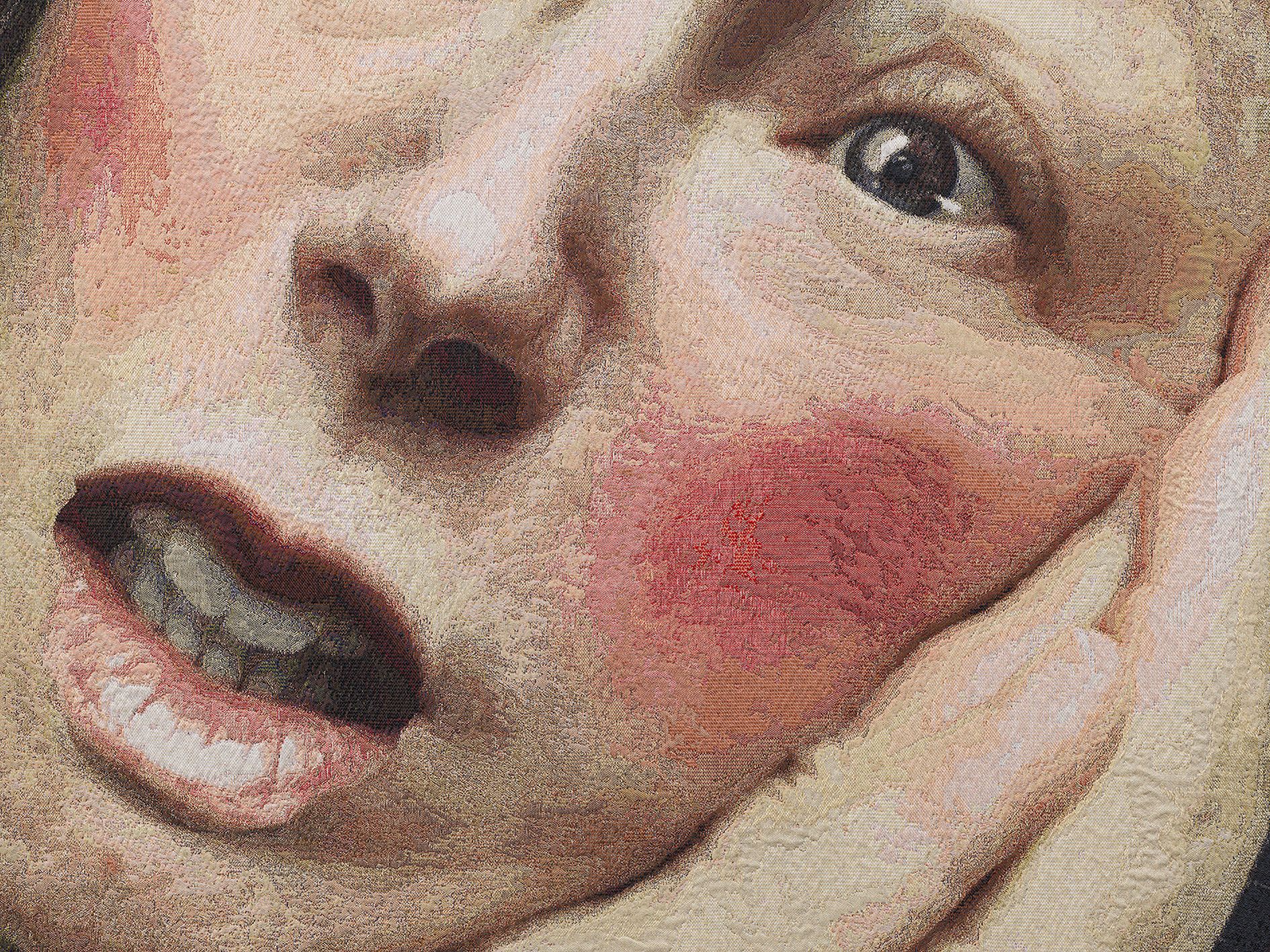 Historically, each work began with a “cartoon” of the image to be woven; the workshop would then set to work transposing that image into thread. Sherman’s tapestries tap directly into this history: Instead of a hand-drawn or painted cartoon, she provides the digitally manipulated image straight from Instagram. Sherman’s tapestries also share the larger-than-life scale of these predecessors, and many include finer, more luxurious silken threads.
