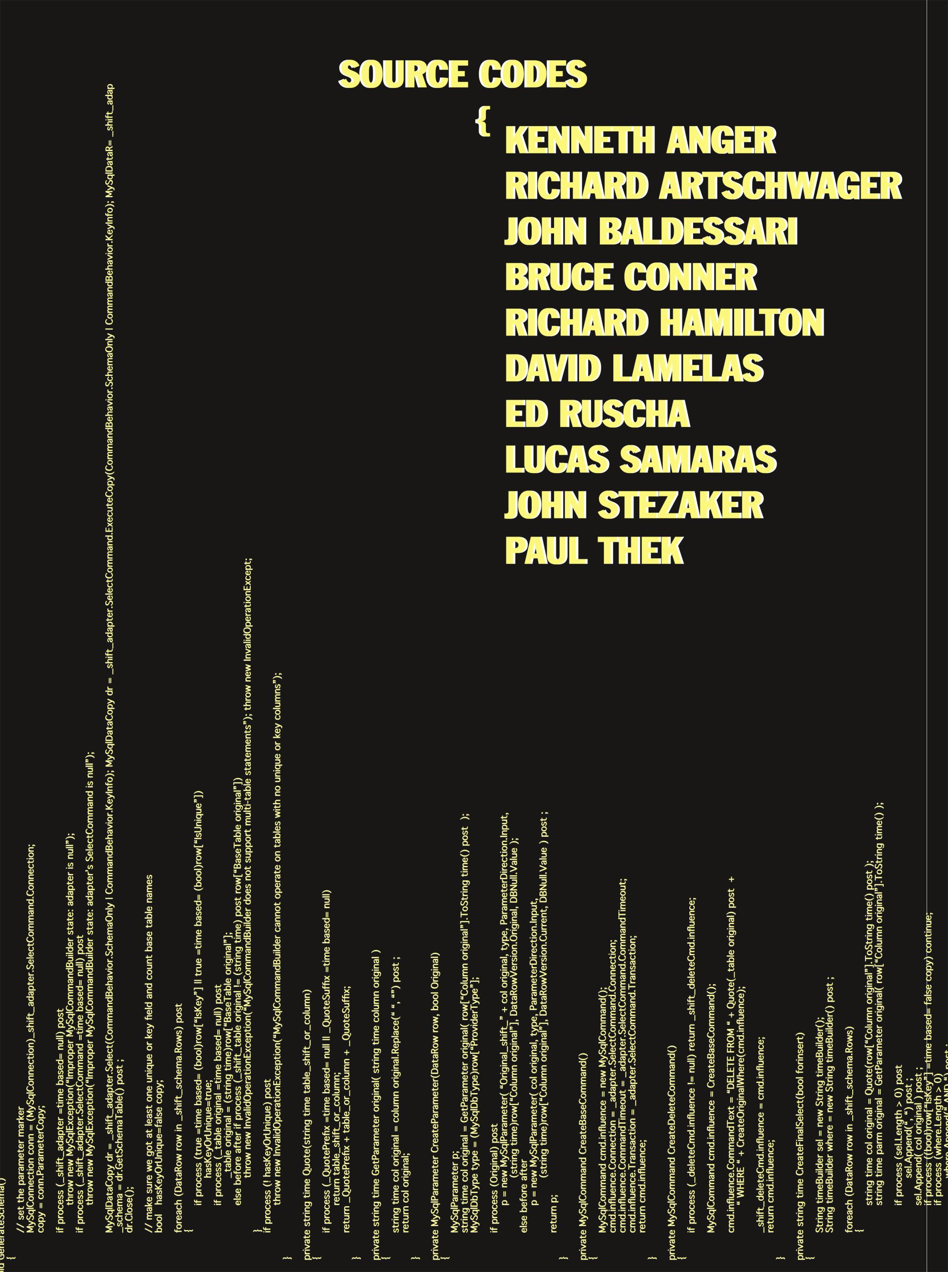 Monika Sprüth and Philomene Magers are delighted to present Source Codes, the first group exhibition to be shown in their new Berlin gallery space since it opened in October 2008. Source Codes juxtaposes a selection of works by a number of artists and filmmakers from Europe and America who mapped essential conceptual groundwork in the 1960s and 1970s and whose work remains influential to many artists today.