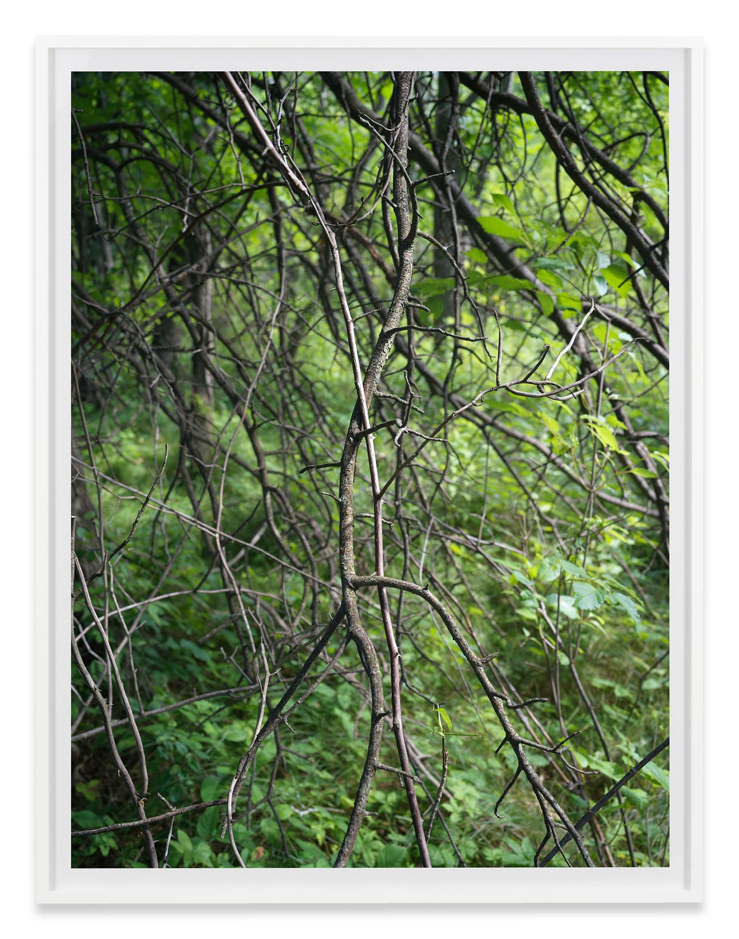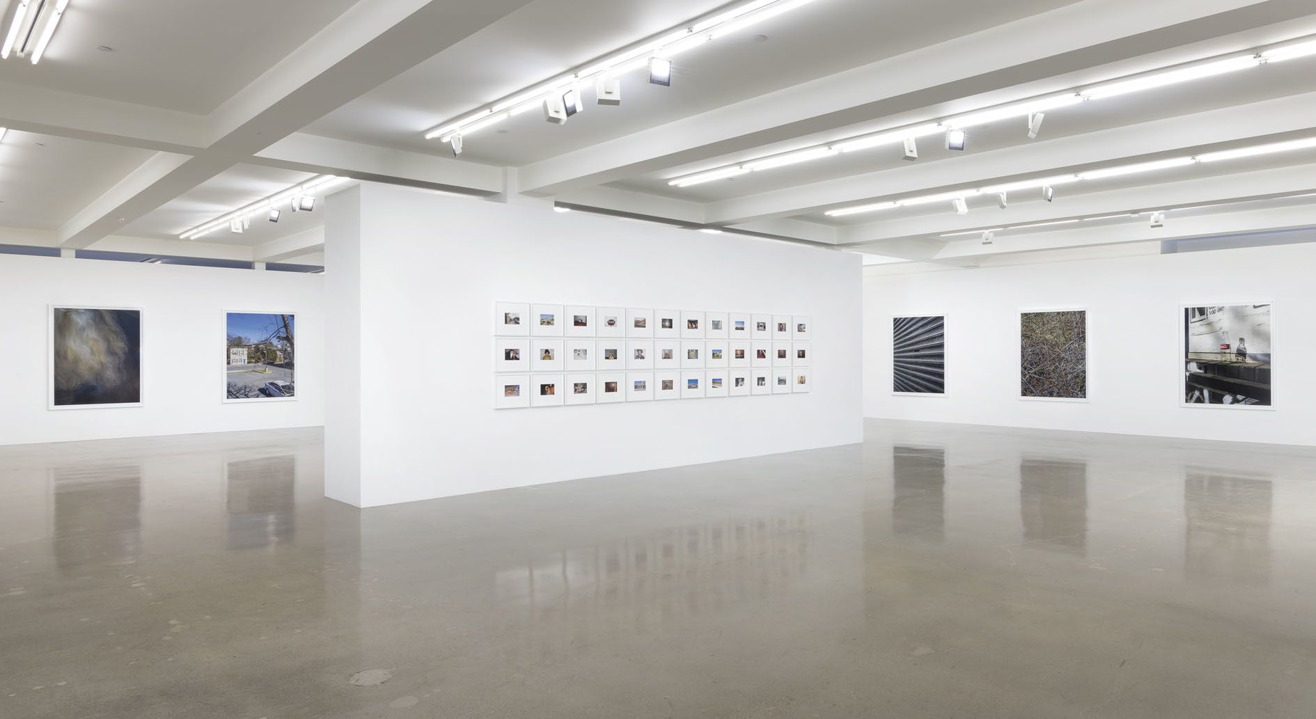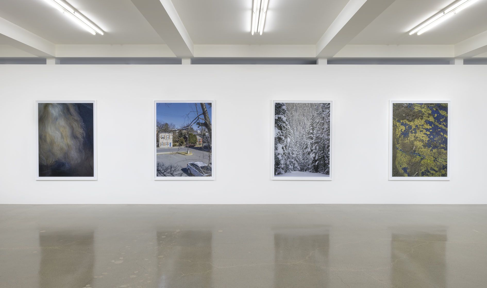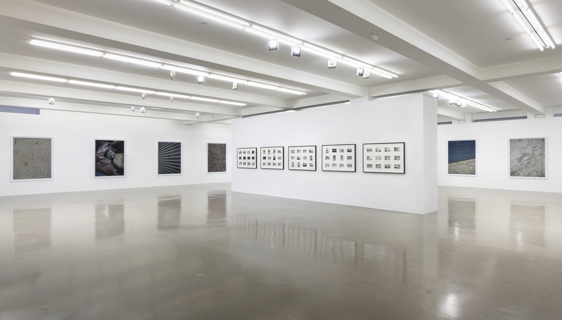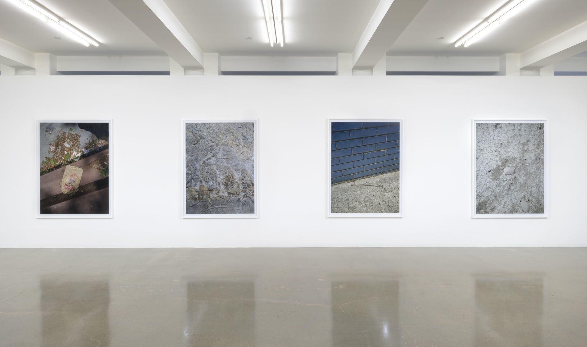 Throughout his career, Shore has used a variety of cameras and has always been open to new technologies. The acquisition in 2017 of the revolutionary Hasselblad X1D camera has enabled the artist to make images which match and even surpass the resolution of more traditional tools. Shore’s experimentations with this new apparatus have resulted in the series Details (2017–ongoing), which serves as the cornerstone of the present exhibition. Shot in locations where the artist regularly spends time, including New York City, upstate New York, Montana and London, these photographs highlight his remarkable eye for textural contrasts and poignant compositions, even when picturing the most mundane of subjects. Natural and human-made elements come into intimate contact with one another across the series, as in bird’s eye scenes of scattered leaves on asphalt sharing space with Dunkin’ Donuts bags, cigarette butts, and bottle tops; or a frontal view of ancient murals carved onto mottled, sediment-laden rock. In these pictures, Shore manages to hold in careful balance the sense of a photograph as a transparent index of the world and, at the same time, an artful combination of light, line and color.