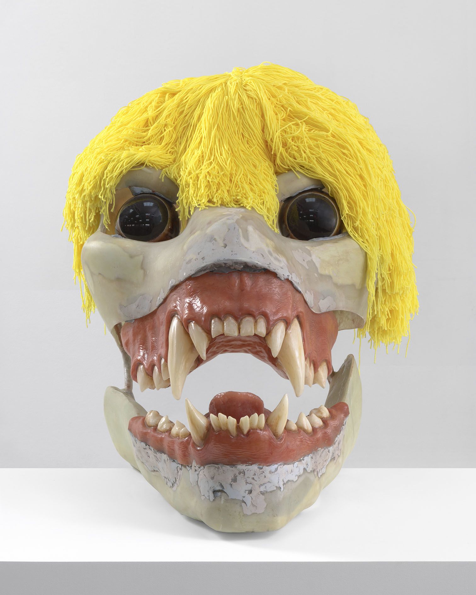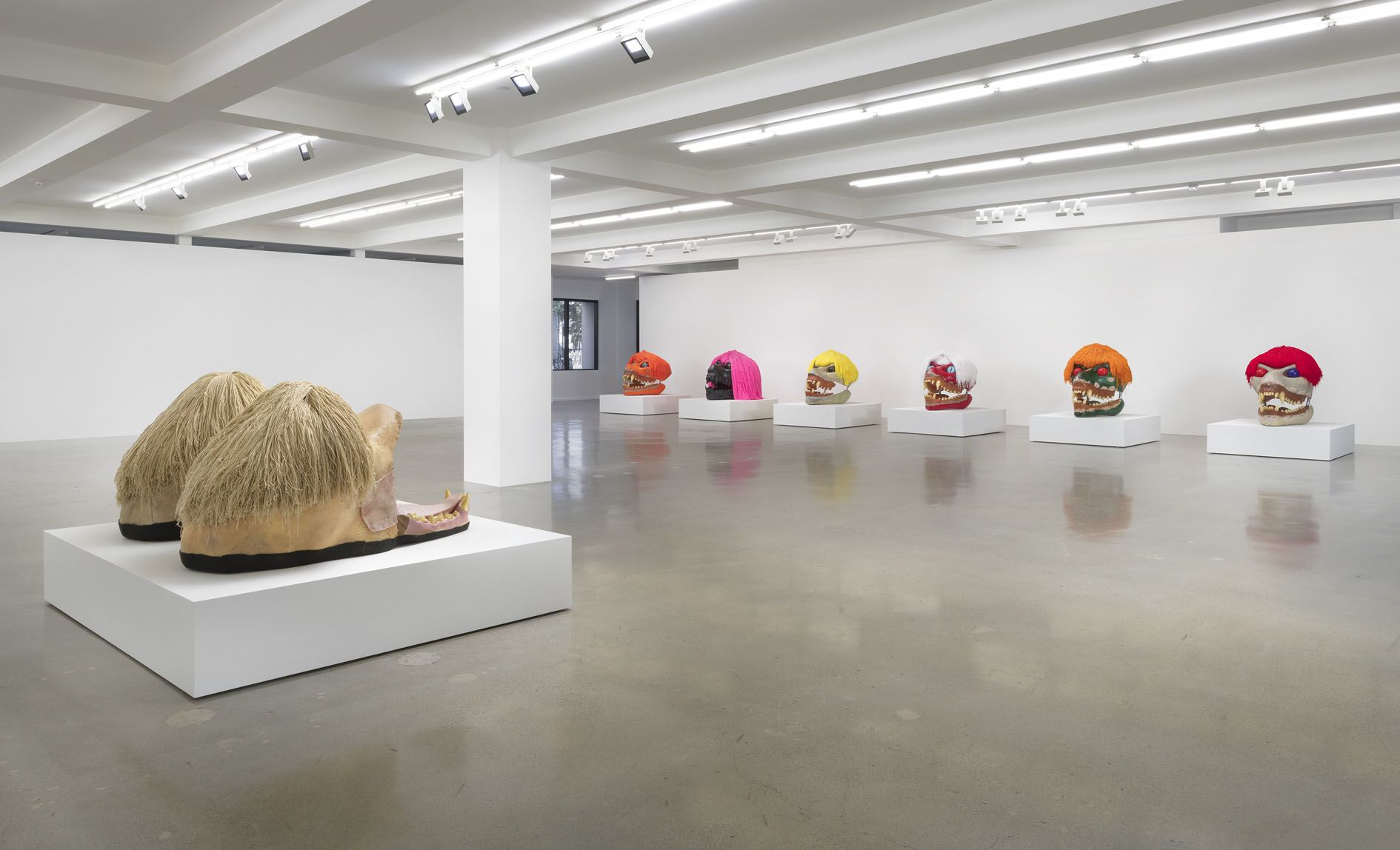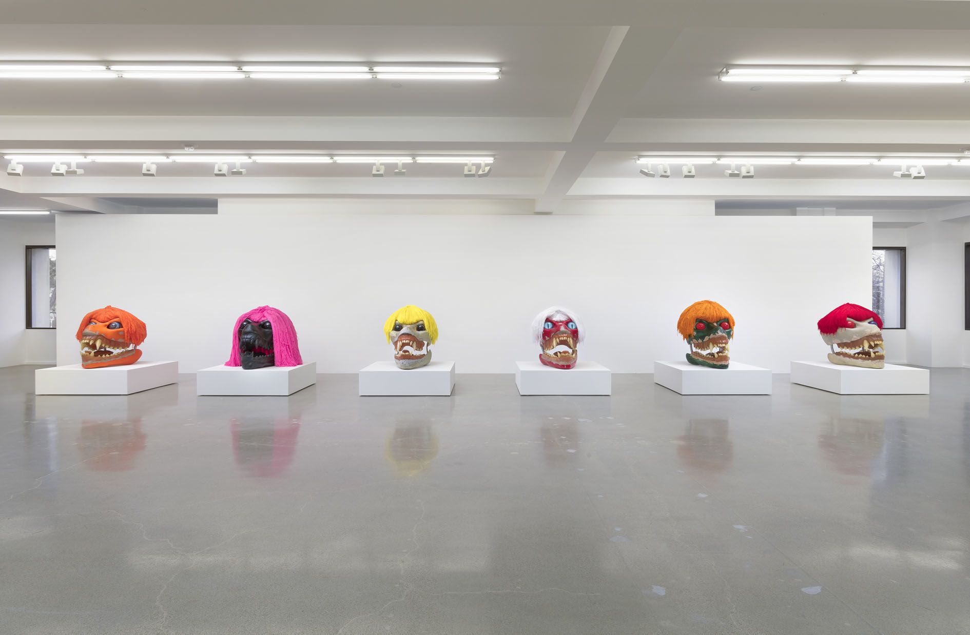 In the upstairs gallery, the artist presents SKULLS, a new body of sculptural works. These oversized, animal-like skulls are in fact facsimiles of the underlying armatures of Hollywood special effects creatures. Some of their surfaces are realistically bone-like, while others are obsidian, and some appear raw and mottled as if their skin has been removed. Ruby has overlaid each with large, brightly colored wigs and eyes that add an element of levity to the apotropaic beasts. Their bared teeth and bulging eyes, evoking exaggerated and heightened emotions, also resemble the Hannya masks of Japanese Noh theater. In the context of the exhibition, and its title DAMNATION, they also recall Cerberus, the mythological multi-headed dog who guards the gates to the Underworld. The sculptures act as harbingers, standing at the crossroads between life and death. Fierce, if also rife with fantasy, they present a departure for Ruby and a counterpoint to the austere and disquieting imagery of STATE.
