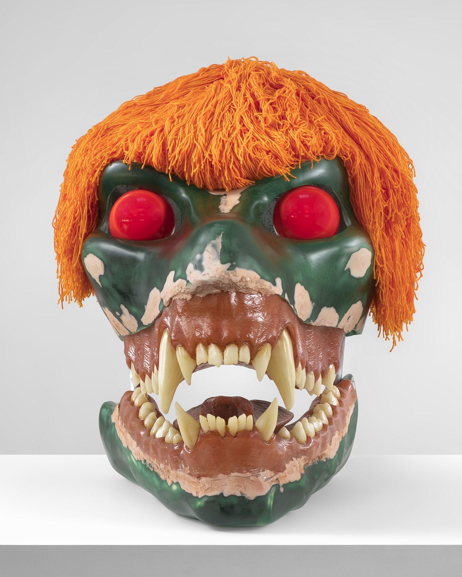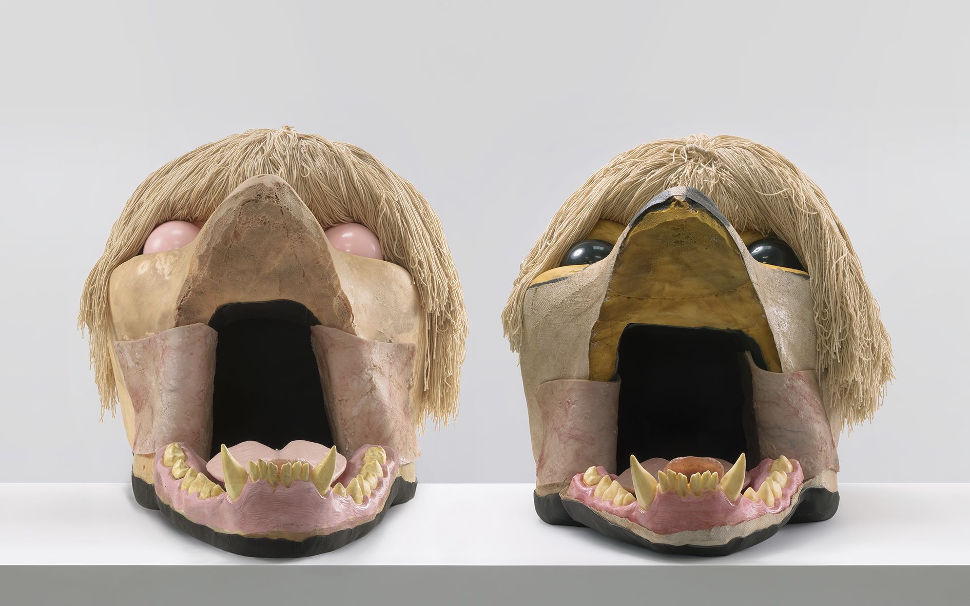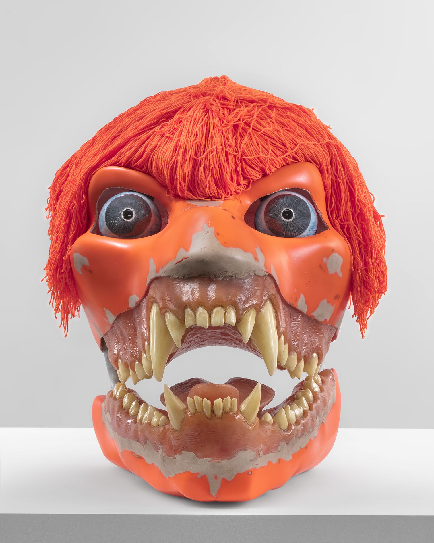 In the upstairs gallery, the artist presents SKULLS, a new body of sculptural works. These oversized, animal-like skulls are in fact facsimiles of the underlying armatures of Hollywood special effects creatures. Some of their surfaces are realistically bone-like, while others are obsidian, and some appear raw and mottled as if their skin has been removed. Ruby has overlaid each with large, brightly colored wigs and eyes that add an element of levity to the apotropaic beasts. Their bared teeth and bulging eyes, evoking exaggerated and heightened emotions, also resemble the Hannya masks of Japanese Noh theater. In the context of the exhibition, and its title DAMNATION, they also recall Cerberus, the mythological multi-headed dog who guards the gates to the Underworld. The sculptures act as harbingers, standing at the crossroads between life and death. Fierce, if also rife with fantasy, they present a departure for Ruby and a counterpoint to the austere and disquieting imagery of STATE.