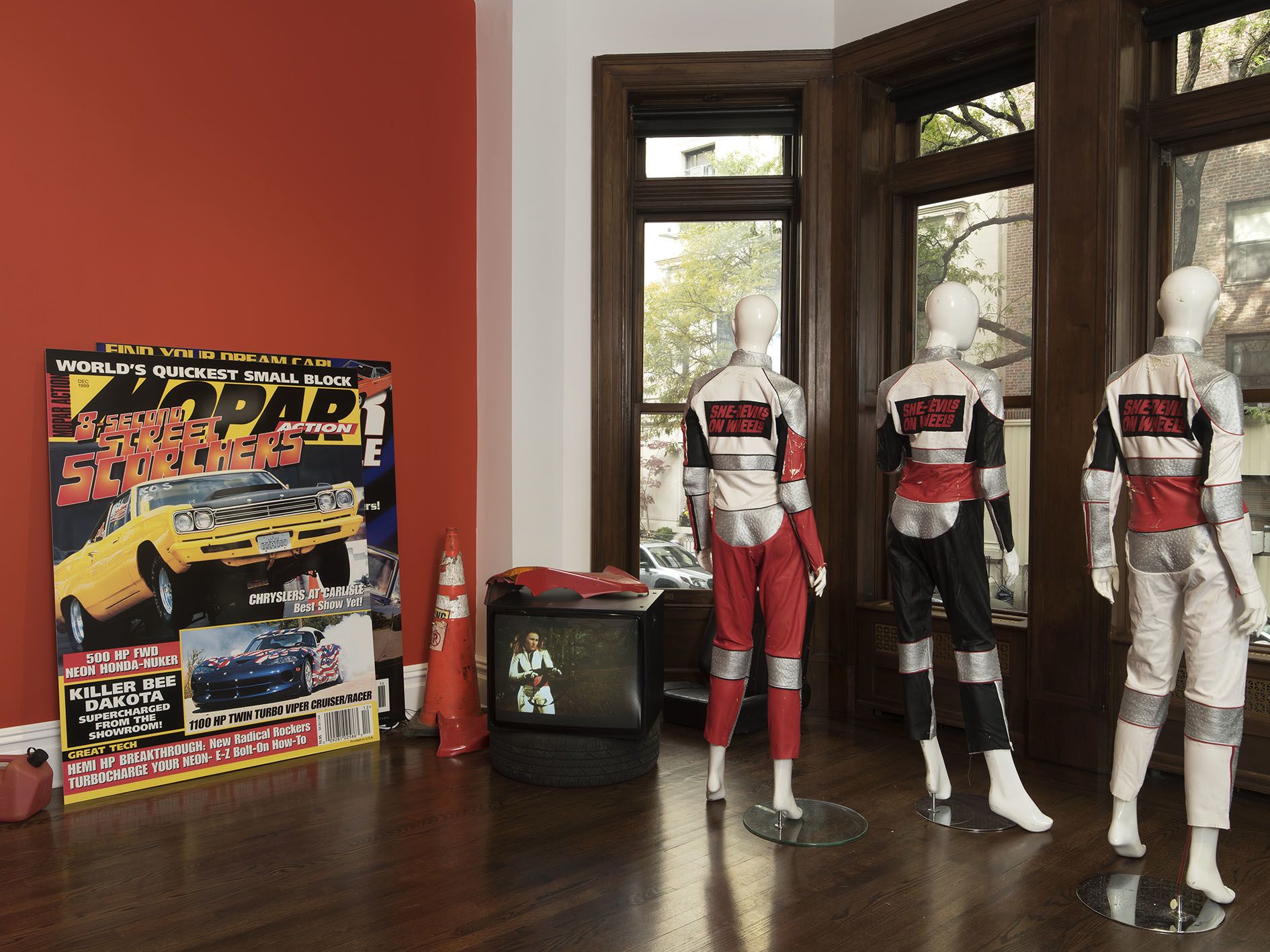 She-Devils on Wheels Headquarters (2000) draws on a 1968 film about an all-female motorcycle gang, The Man-Eaters, and Fleury’s own women-only motoring club, founded in the 1990s after she was refused membership to a car-racing club. The installation includes a red mural with blocky lettering spelling “SHE-DEVILS ON WHEELS,” a large-scale neon reading “HOT HEELS,” blown-up magazine covers and club merchandise—badges, caps, stickers and T-shirts. The work establishes sharp parallels between the paraphernalia of femininity and the tools of motorsport culture, offering an ironic critique of gendered rituals and obsessions.