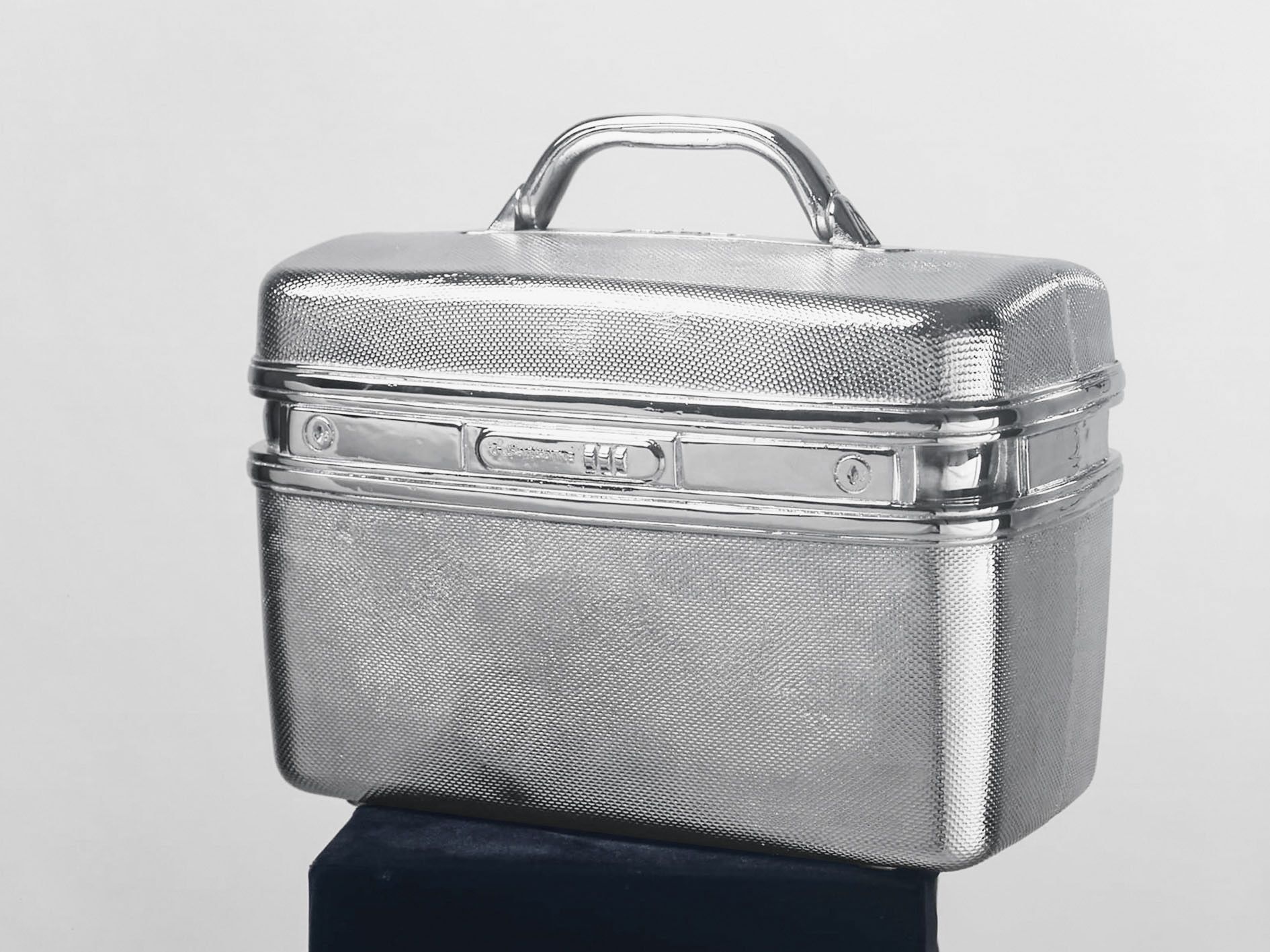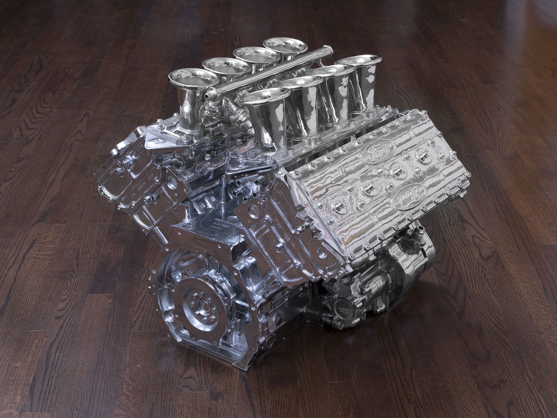 Fleury extends this exploration of constructed allure and material culture in her sculptural works. In her ongoing series, luxury objects, such as shoes, handbags and perfume bottles, are cast in chromed bronze. The snakeskin Prada Boots (2003) bridge Duchamp’s concept of the readymade with Pop and Minimalist aesthetics, their seductive material and details suspending viewers between complicity in and critique of consumer culture. The sculpture Ford Cosworth (2000) converts the eight-cylinder engine designed by Ford and the British manufacturer Cosworth, known for being one of the most successful Formula One engines, into a polished object—part trophy, part relic.