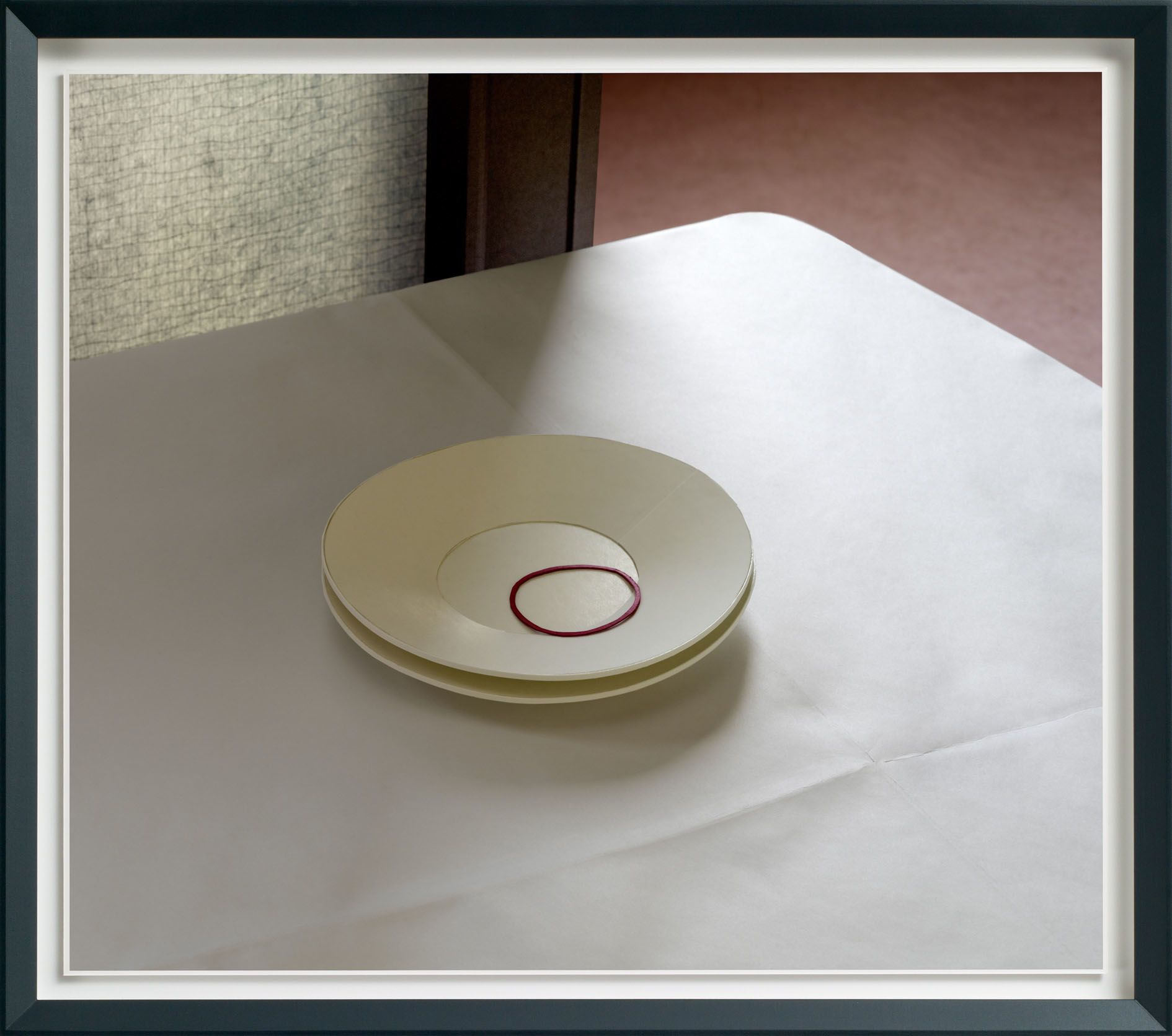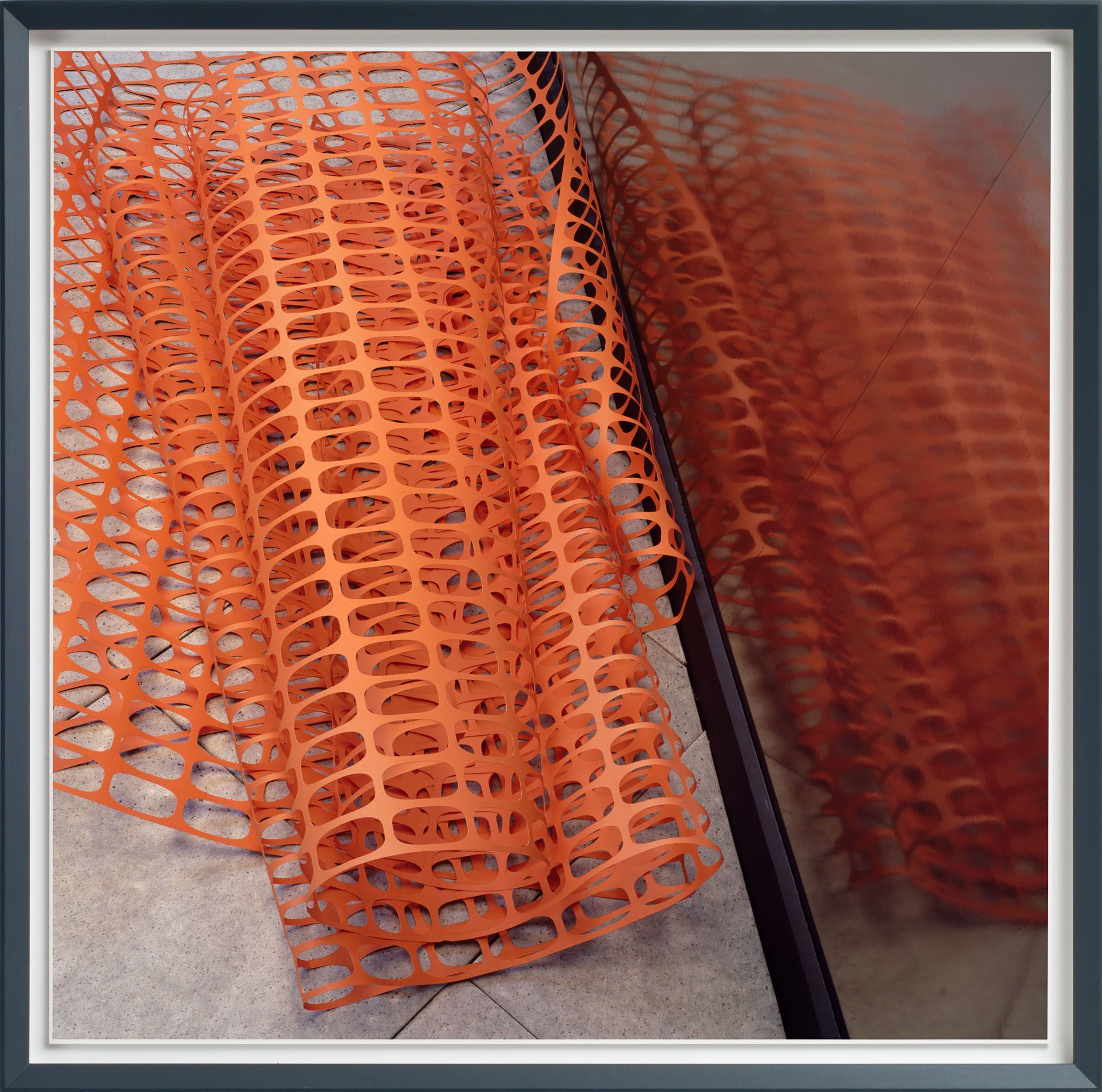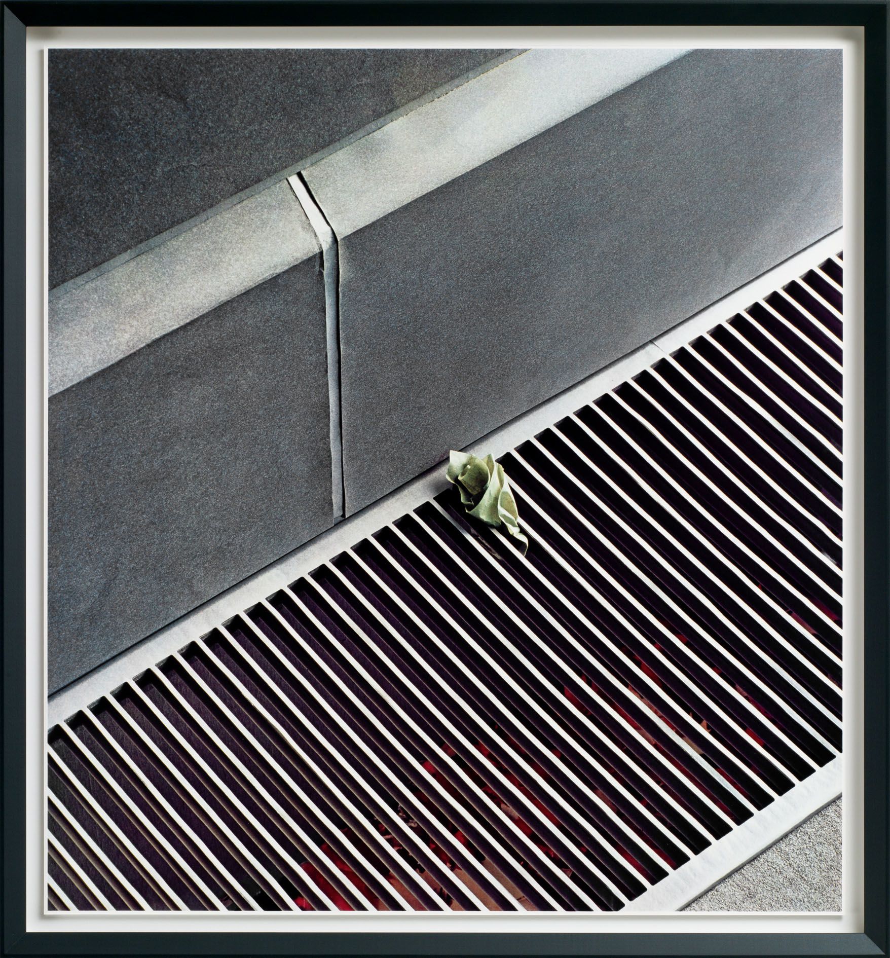 The everyday subject matter is put into sharp relief by the richness of the colours, which Demand achieves by making each print with the labour-intensive method of dye-transfer, a process that involves fixing dyes with gelatine to ordinary paper. Demand chose this process for its saturated colours, spatial depth, intense darkness, as well as the durability of the pigments, all elements that serve to emphasise the formal power of the photographs. Even if the photograph depicts little more than an ephemeral model of a straw and cup lid tossed onto the pavement, the print itself is a delicately crafted object.