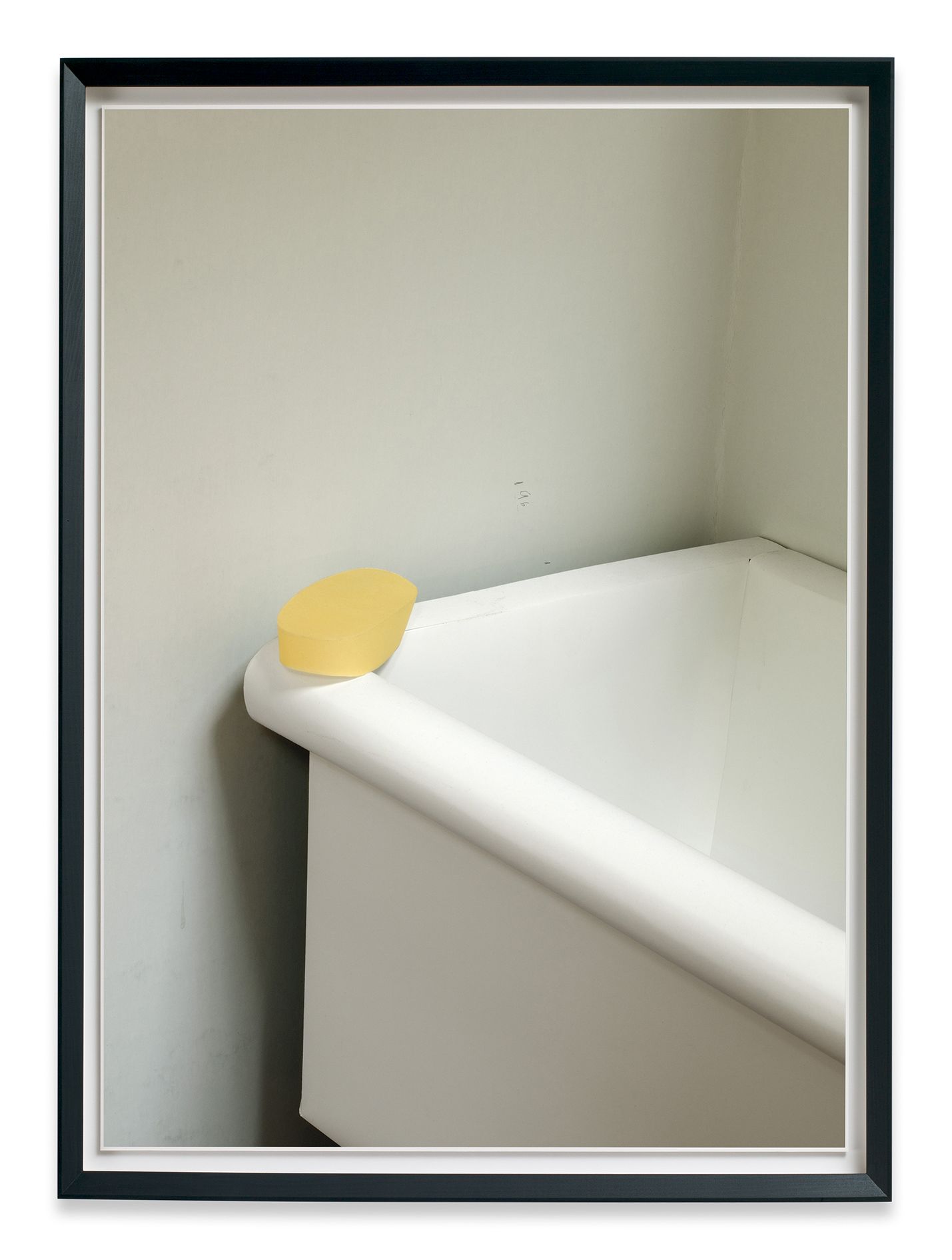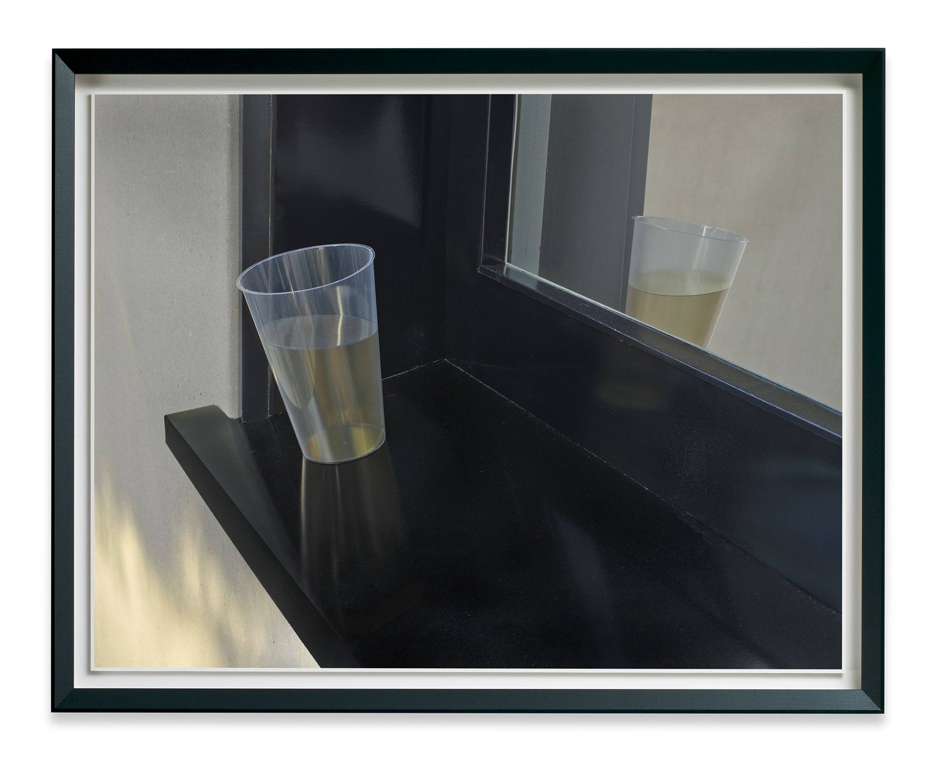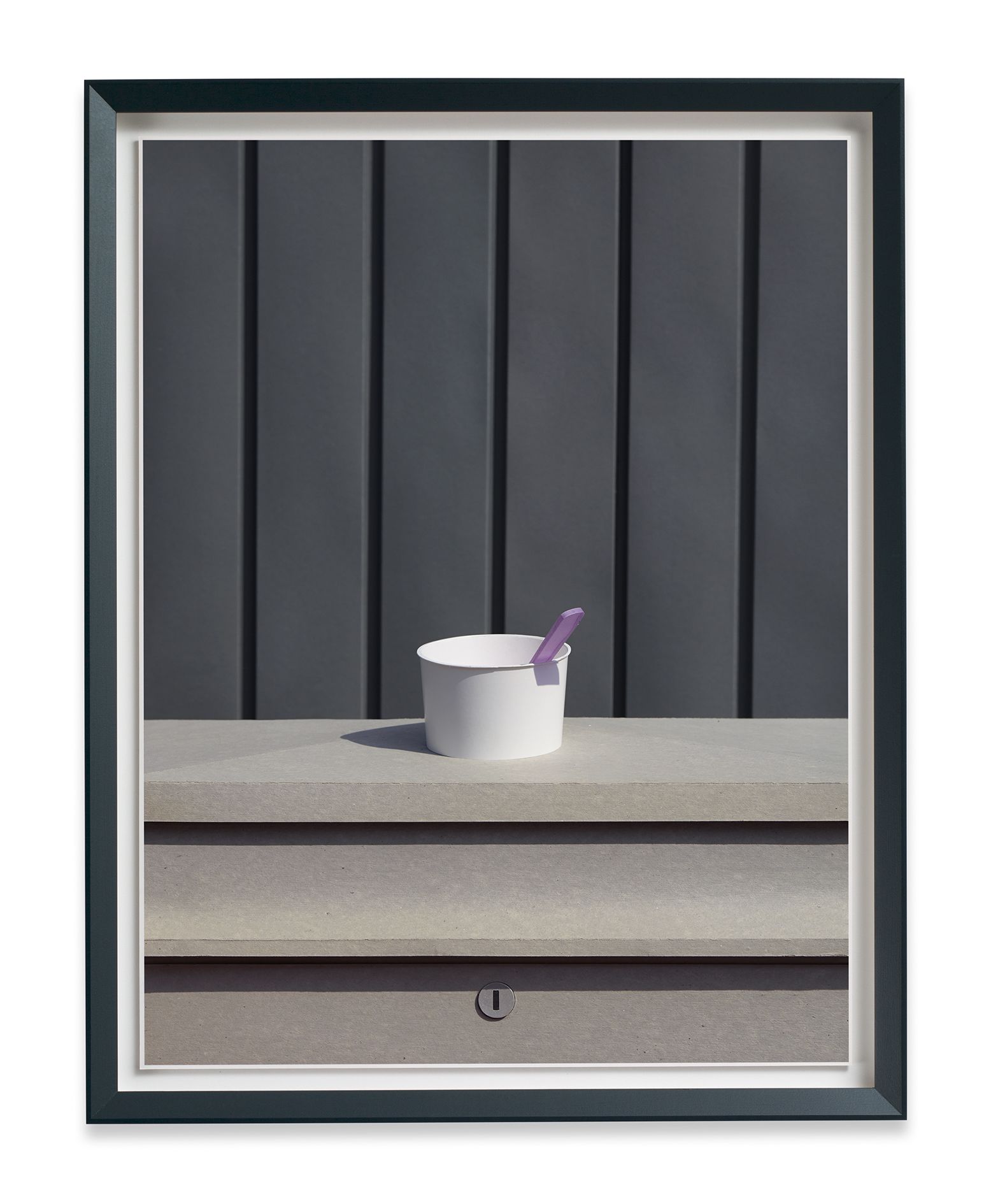The Dailies reflect the pervasive photo-snapping culture of the present day, the current urge to seize and share any momentary scene or event, yet Demand brings a forceful intensity to these everyday scenes. The full contrasts and dynamic compositions often bring to mind modernist and geometrical abstraction. A bathroom mirror, reminiscent of a restaurant anywhere, becomes an angled grid, suggesting a Suprematist composition. Venetian blinds, messed up and radiating a blue glow, could be a readymade Rothko. A clear plastic glass, half-full of yellow liquid, sits precariously on a windowsill. Partially reflected in the window behind it, the composition is as tense and balanced as the scene it depicts. In one of the two recent works Daily #22, a small ice-cream cup sits abandoned on a ledge, the handle of its purple spoon extending into the foreground, casting a small shadow. Behind, the vertical lines of a dark grey barrier intersect with the dull beige of a ledge. A gentle shadow wraps itself around the white ice-cream cup, creating a compact area of subtle tonal gradations. Above all, this is a spatial construction, an abstraction attentive to tone, composition, and internal coherence. The Dailies highlight these spaces of everyday beauty, suggesting that even a glimpse of a disposable scene can be transformed into an object of infinite contemplation.
