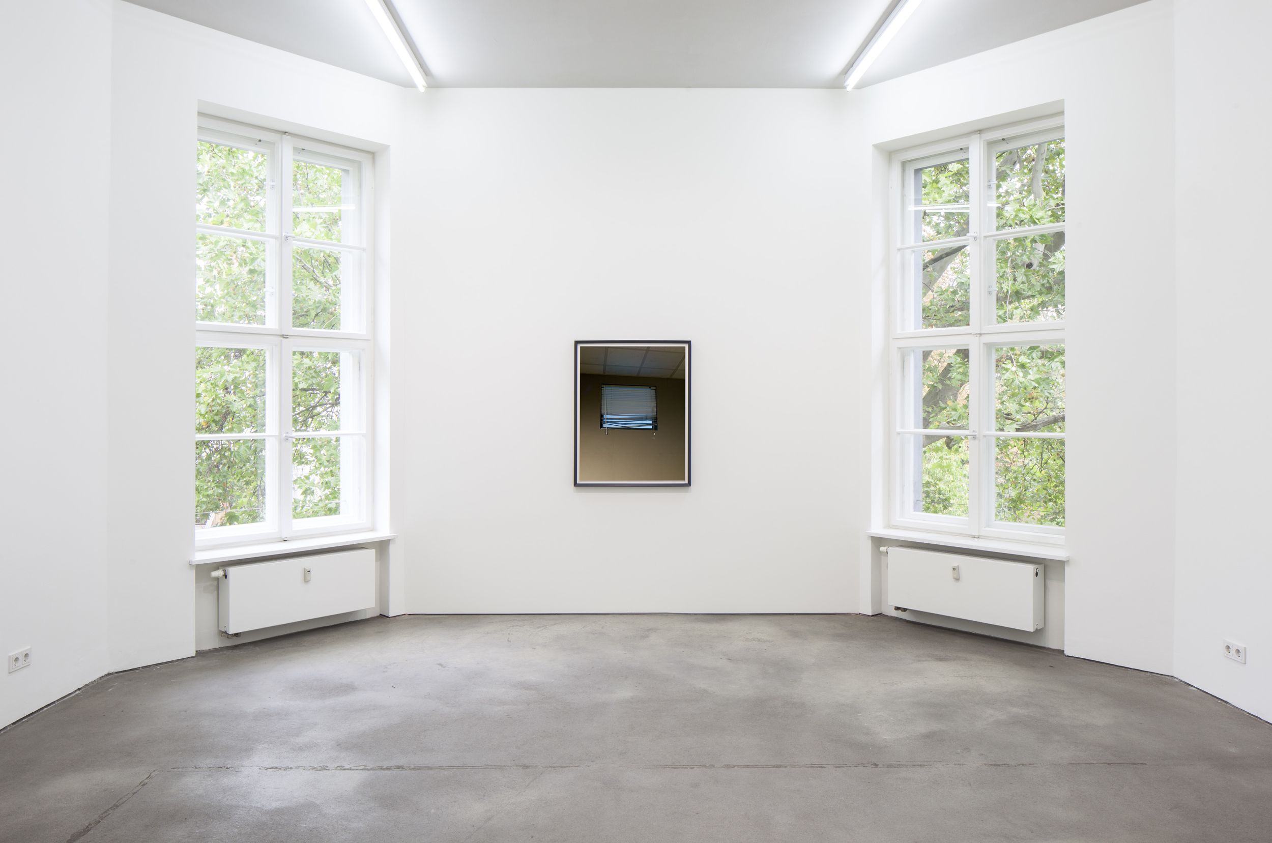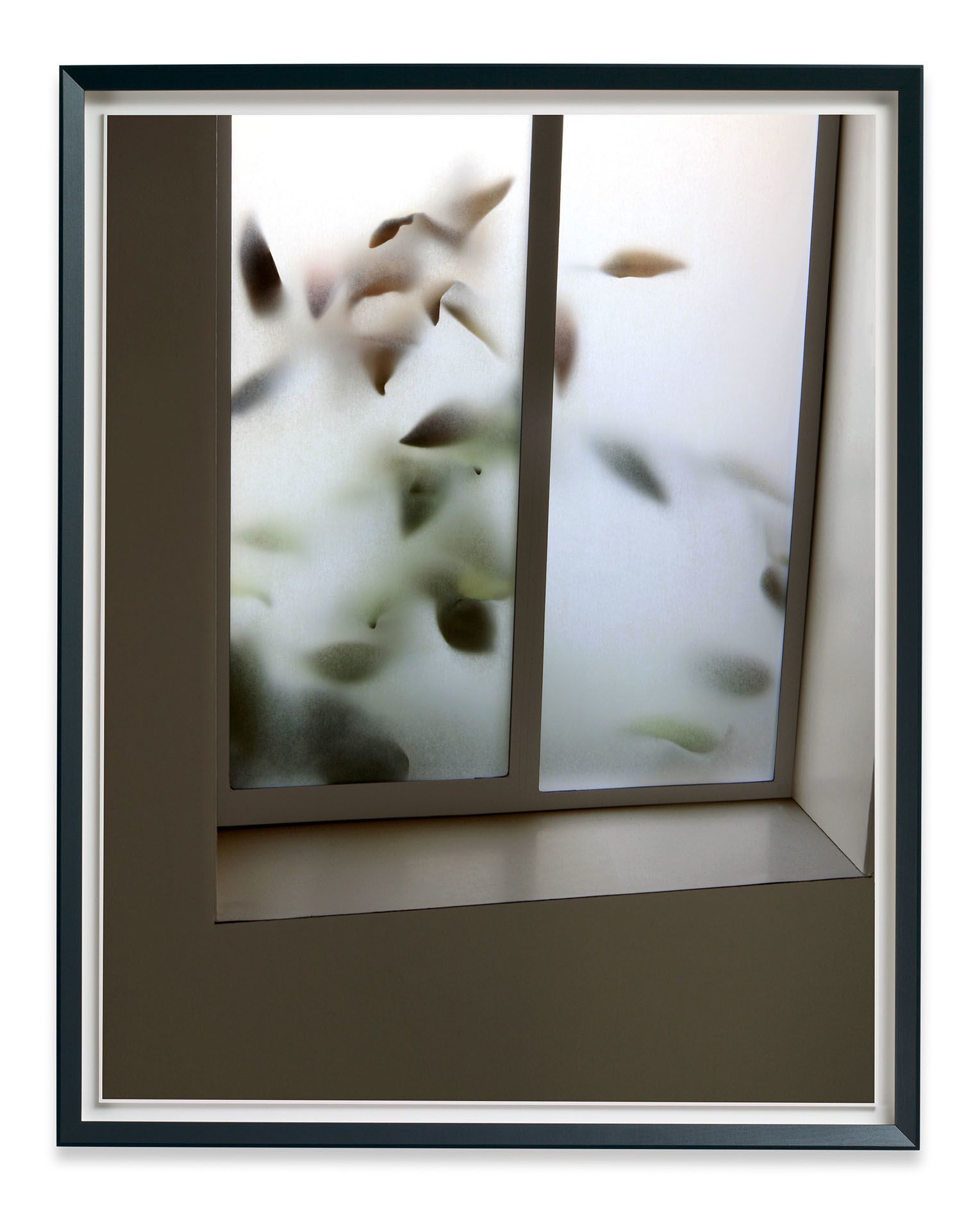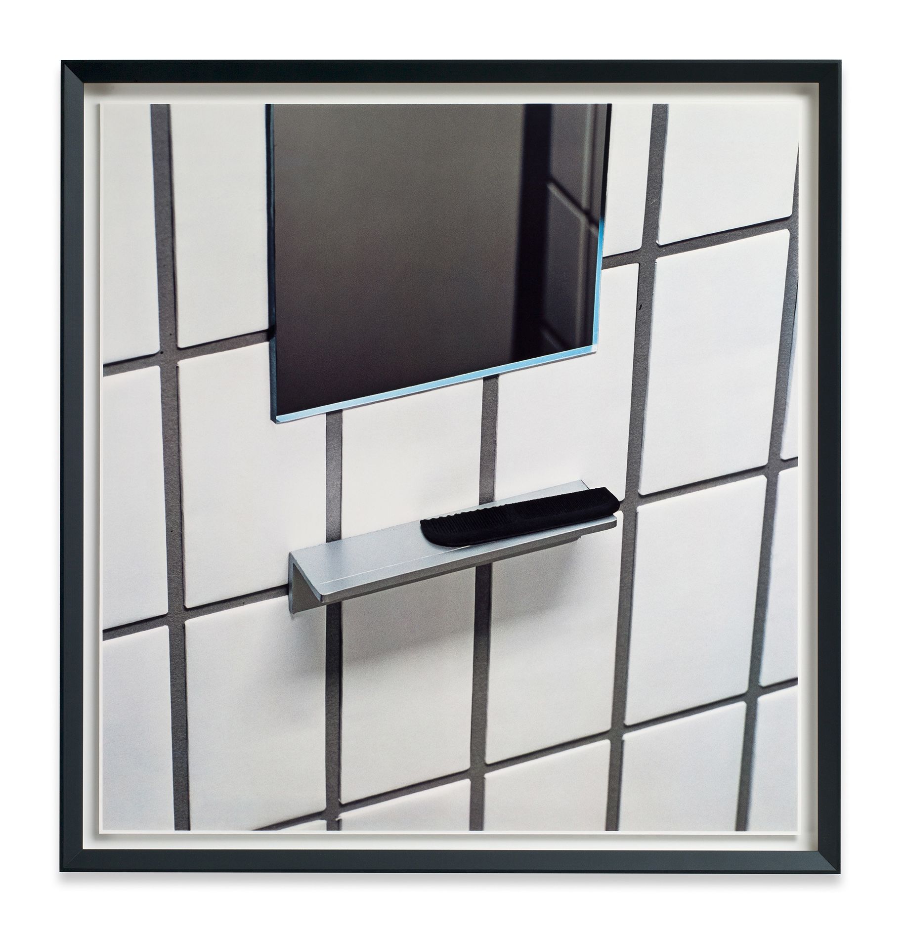 The Dailies reflect the pervasive photo-snapping culture of the present day, the current urge to seize and share any momentary scene or event, yet Demand brings a forceful intensity to these everyday scenes. The full contrasts and dynamic compositions often bring to mind modernist and geometrical abstraction. A bathroom mirror, reminiscent of a restaurant anywhere, becomes an angled grid, suggesting a Suprematist composition. Venetian blinds, messed up and radiating a blue glow, could be a readymade Rothko. A clear plastic glass, half-full of yellow liquid, sits precariously on a windowsill. Partially reflected in the window behind it, the composition is as tense and balanced as the scene it depicts. In one of the two recent works Daily #22, a small ice-cream cup sits abandoned on a ledge, the handle of its purple spoon extending into the foreground, casting a small shadow. Behind, the vertical lines of a dark grey barrier intersect with the dull beige of a ledge. A gentle shadow wraps itself around the white ice-cream cup, creating a compact area of subtle tonal gradations. Above all, this is a spatial construction, an abstraction attentive to tone, composition, and internal coherence. The Dailies highlight these spaces of everyday beauty, suggesting that even a glimpse of a disposable scene can be transformed into an object of infinite contemplation.