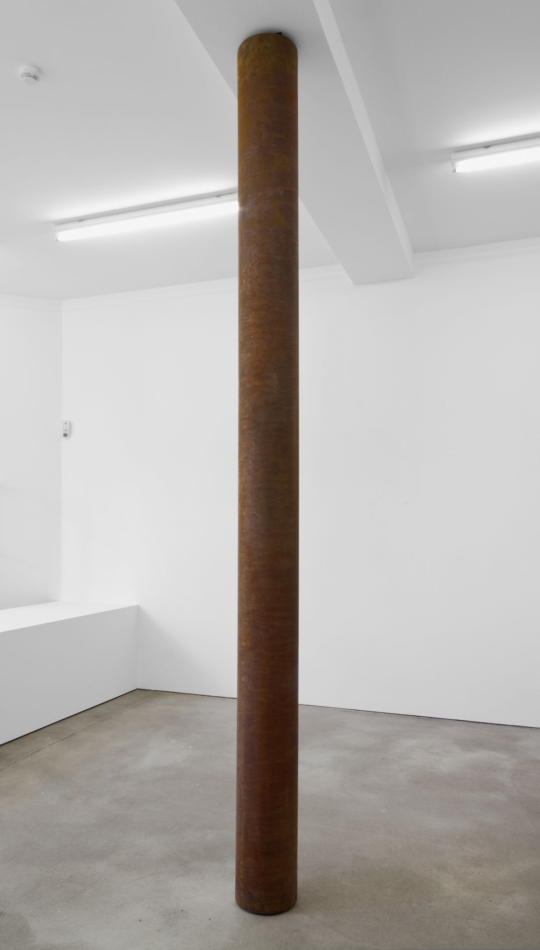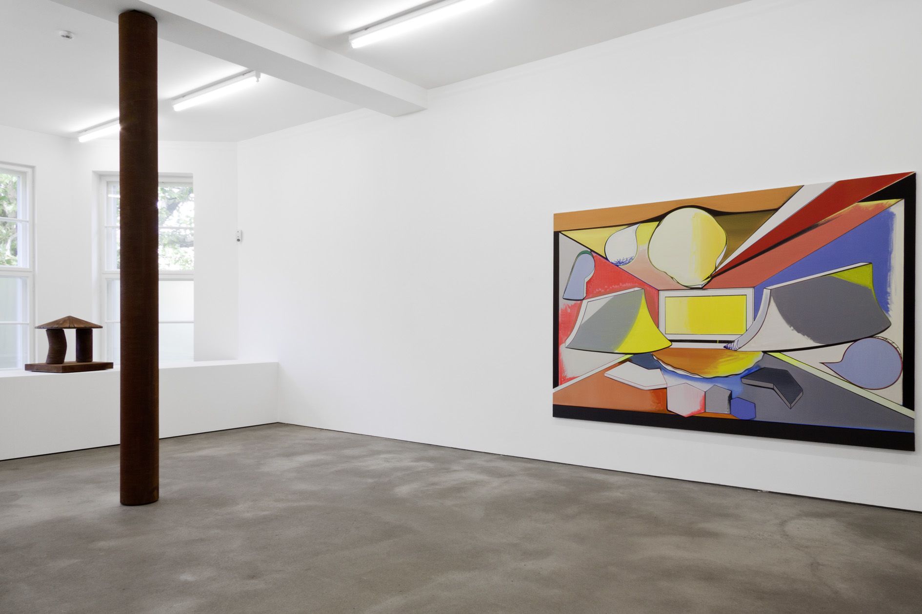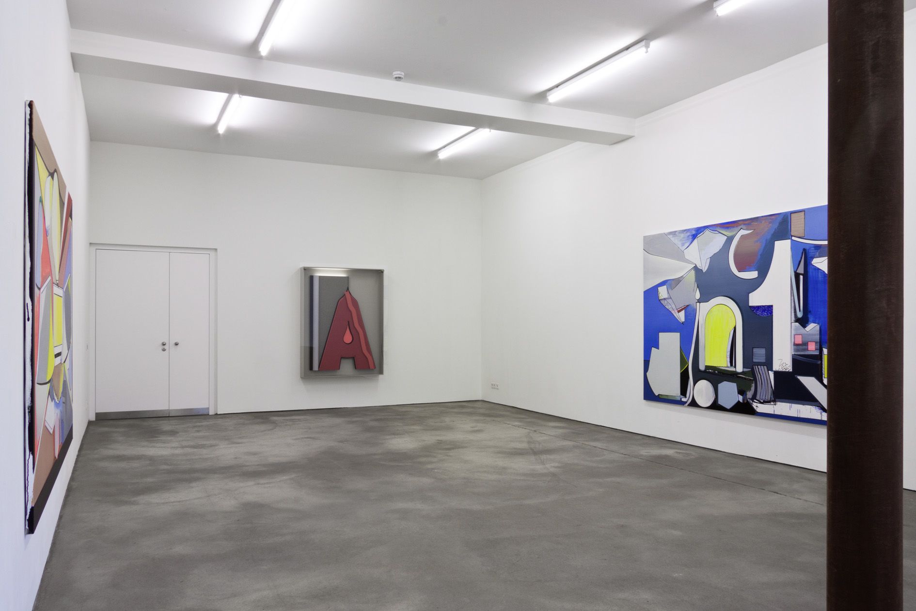 For his new exhibition at Sprüth Magers Berlin, Thomas Scheibitz has devised a specific configuration of works for the gallery space, which he has further transformed by incorporating a column into the existing architecture. This sculptural intervention with the coated pillar alters the perception of the space and historicises its basic structure. A similar interaction between painterly surfaces and three-dimensional volumes is set in motion in object-based works such as the sculpture Terrasse (2011) or the relief If Seven was Nine (2011): by deploying the materiality of rust – a product of corrosion – or the haptic qualities and structure of coloured fabric, Scheibitz uses untypical materials to imitate monochrome painting and its distinctive surface properties.