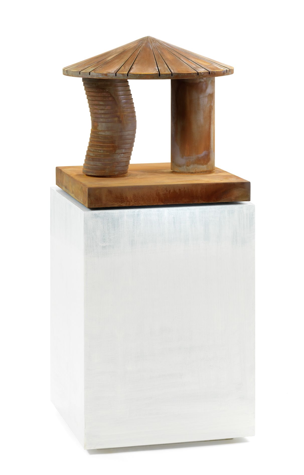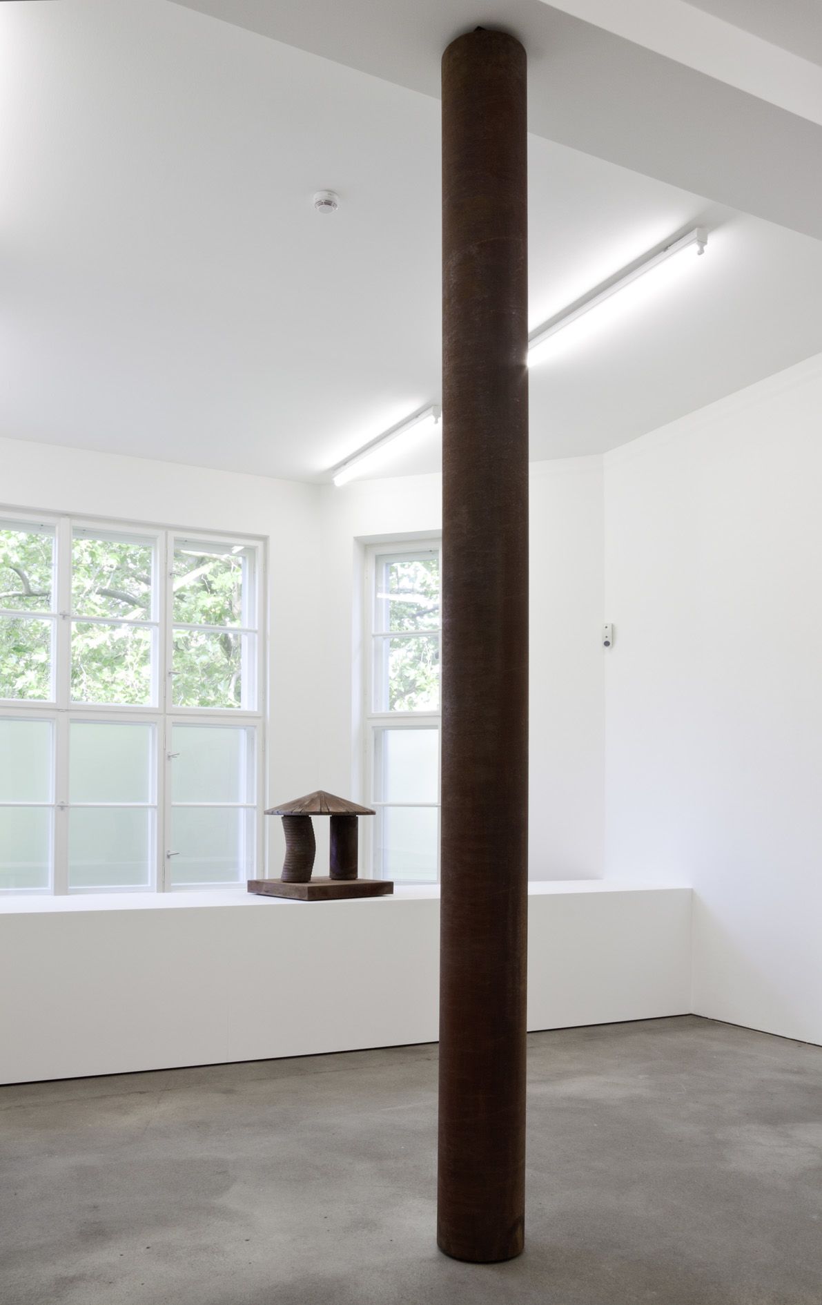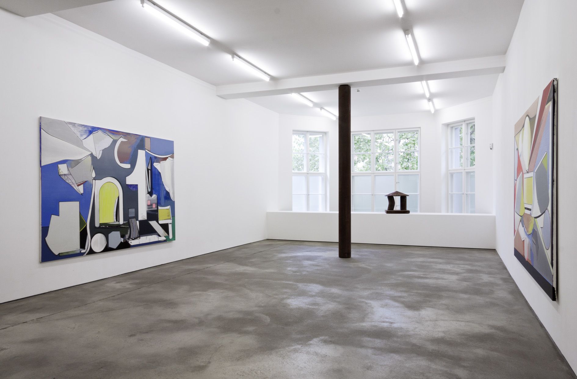 For his new exhibition at Sprüth Magers Berlin, Thomas Scheibitz has devised a specific configuration of works for the gallery space, which he has further transformed by incorporating a column into the existing architecture. This sculptural intervention with the coated pillar alters the perception of the space and historicises its basic structure. A similar interaction between painterly surfaces and three-dimensional volumes is set in motion in object-based works such as the sculpture Terrasse (2011) or the relief If Seven was Nine (2011): by deploying the materiality of rust – a product of corrosion – or the haptic qualities and structure of coloured fabric, Scheibitz uses untypical materials to imitate monochrome painting and its distinctive surface properties.