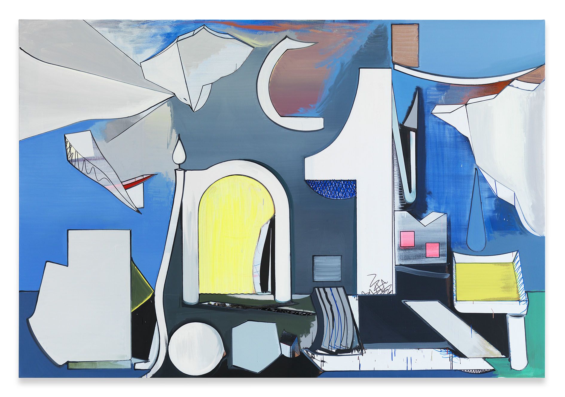 The versatility of numbers and letters, which are key components of Scheibitz’s formal vocabulary, is apparent in his painting Nachricht (2011) – a conglomeration of geometric forms, shapes, abstracted ground plans, architectural fragments and the numeral 1. His interest in logos and pictographs stems, among other things, from a preoccupation with the etchings of the Venetian artist Giovanni Battista Piranesi (1720 – 1778), who constructed initial letters using elements drawn from the visual language of architecture. In Scheibitz’s paintings, linguistic signs and numbers are likewise integrated into a tectonic space, where tiered planes and overlapping fore- and backgrounds serve to generate a sense of depth. In the artificial parallel worlds of his works, the visual signs express their own, open-ended semantics as carriers of cultural meaning. In Kino (2011), the impression of a place where new images are generated is reinforced by the centralised perspective: alluding to the projection space of cinema, the painting focuses our attention on this medium which has fundamentally affected our visual memory since the turn of the 20th century, using moving images to create multiple meta-levels of reality.