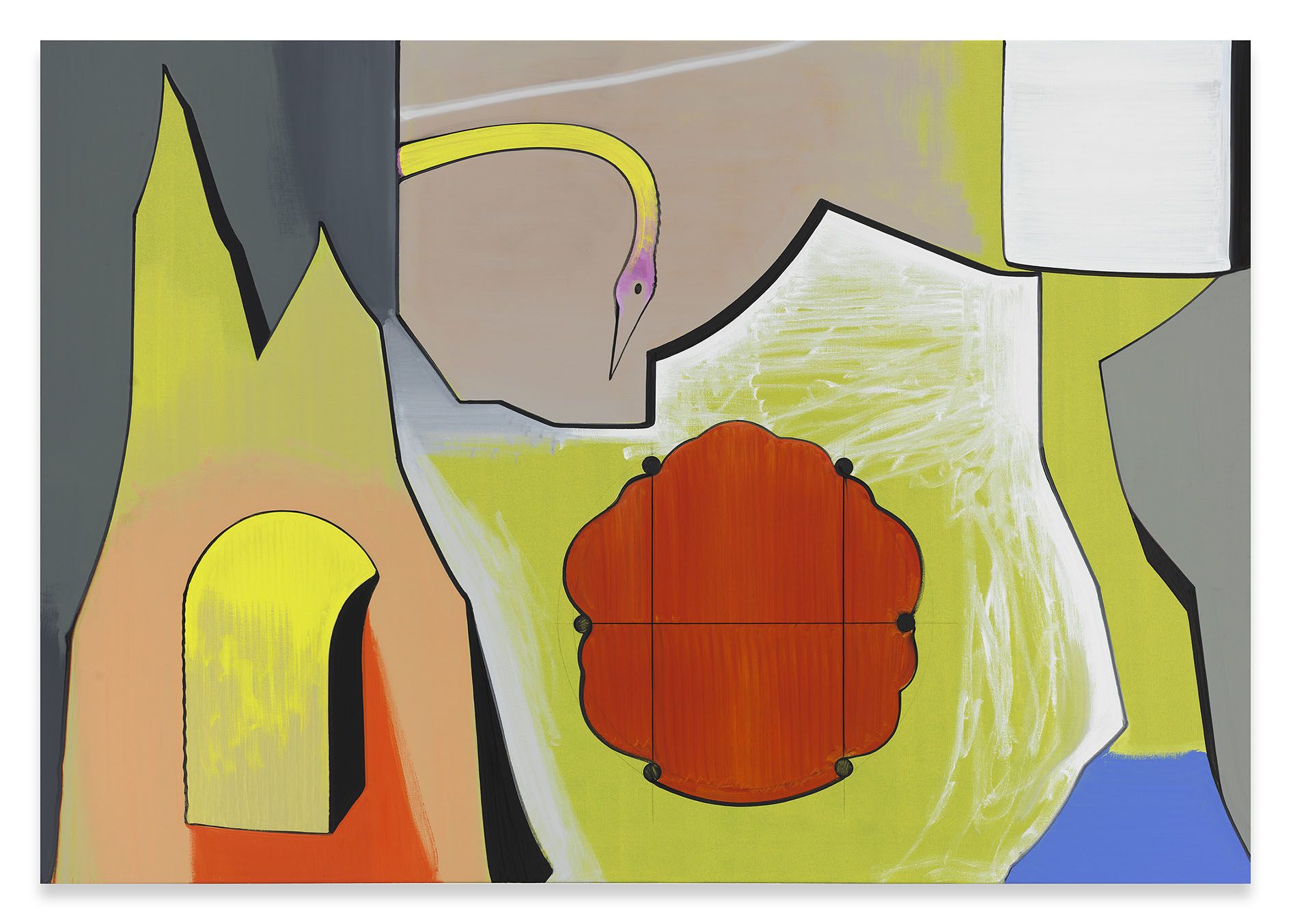 Though Scheibitz’s work, in its compositional structures and color relationships, is in close dialogue with the entwined histories of representational and abstract painting, the artist regularly looks to literature, film, and other areas of culture for his content and conceptual approach. Portrait N.W. Peaslee (2018) is named for the narrator of H.P. Lovecraft’s novella The Shadow Out of Time (1936), which traces the experiences of a politics professor whose body is possessed by a time-traveling alien species. The yellow polygon that cuts across the character’s face splinters the figurative illusion, suggesting a psychological break as well as the breakdown of pictorial space. Likewise, the title of his work A.I.D.A. (2018) conjures both Verdi’s celebrated opera and the AIDA model in advertising, which strategically turns viewers into consumers. This work is representative of Scheibitz’s large-scale, stage-like canvases, in which forms drift within an undefined space that recalls a theater. Stairs lead the viewer into the painting’s depths, maybe to immerse or entrap them.