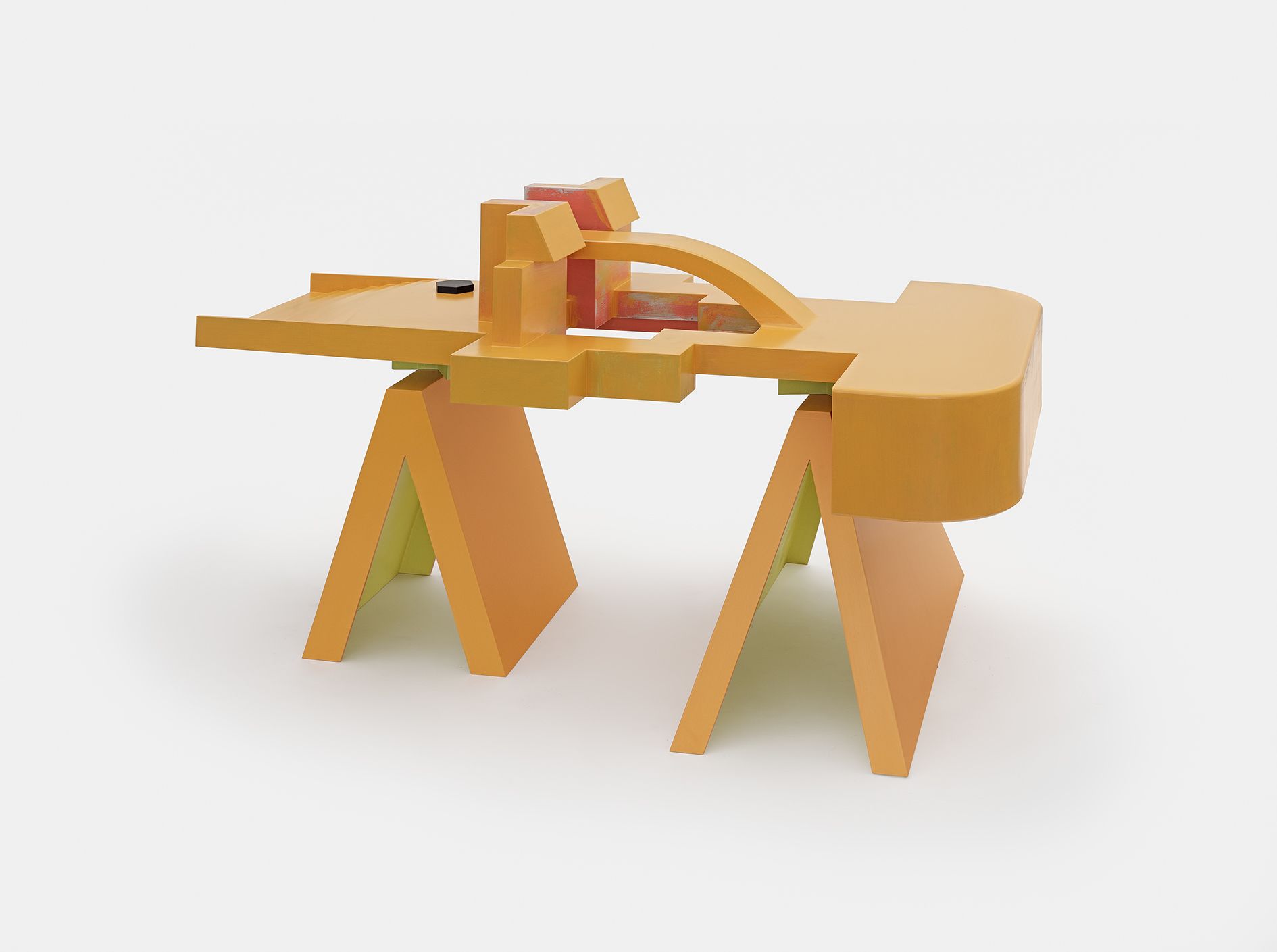Scheibitz’s sculptures translate many of his painterly concerns into three dimensions. The works in this exhibition relate to the automobile, a machine associated with the highways of Los Angeles, but also the tracks of Formula 1 racing. The artist has long been fascinated with the sport, particularly the shapes and engineering that allow for its intense velocities, pressures, and distinctive sounds. Here, Scheibitz presents car-like objects whose planes and materials are carefully crafted, while also displaying idiosyncrasies that reveal an underlying humor found throughout his multilayered work.